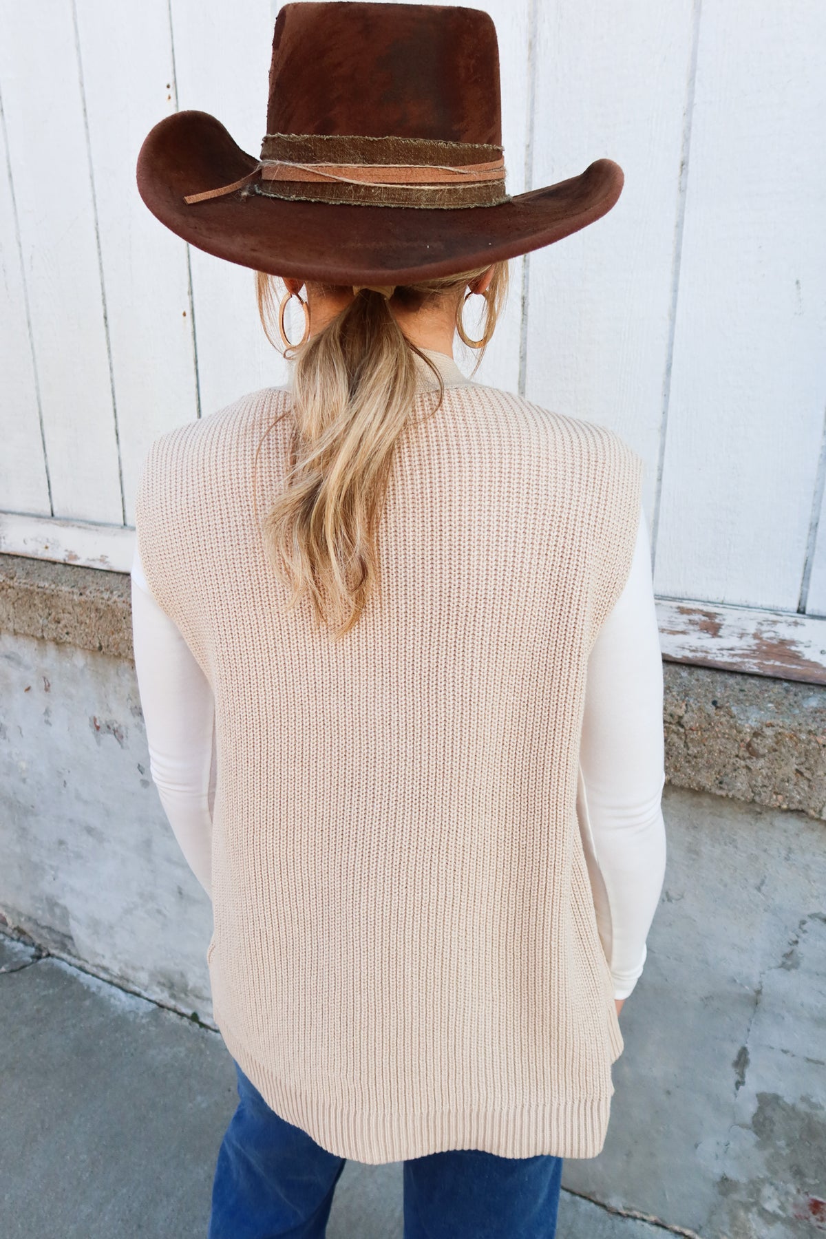 Natural Chunky Knit Varsity Style Button Up Sweater Vest
