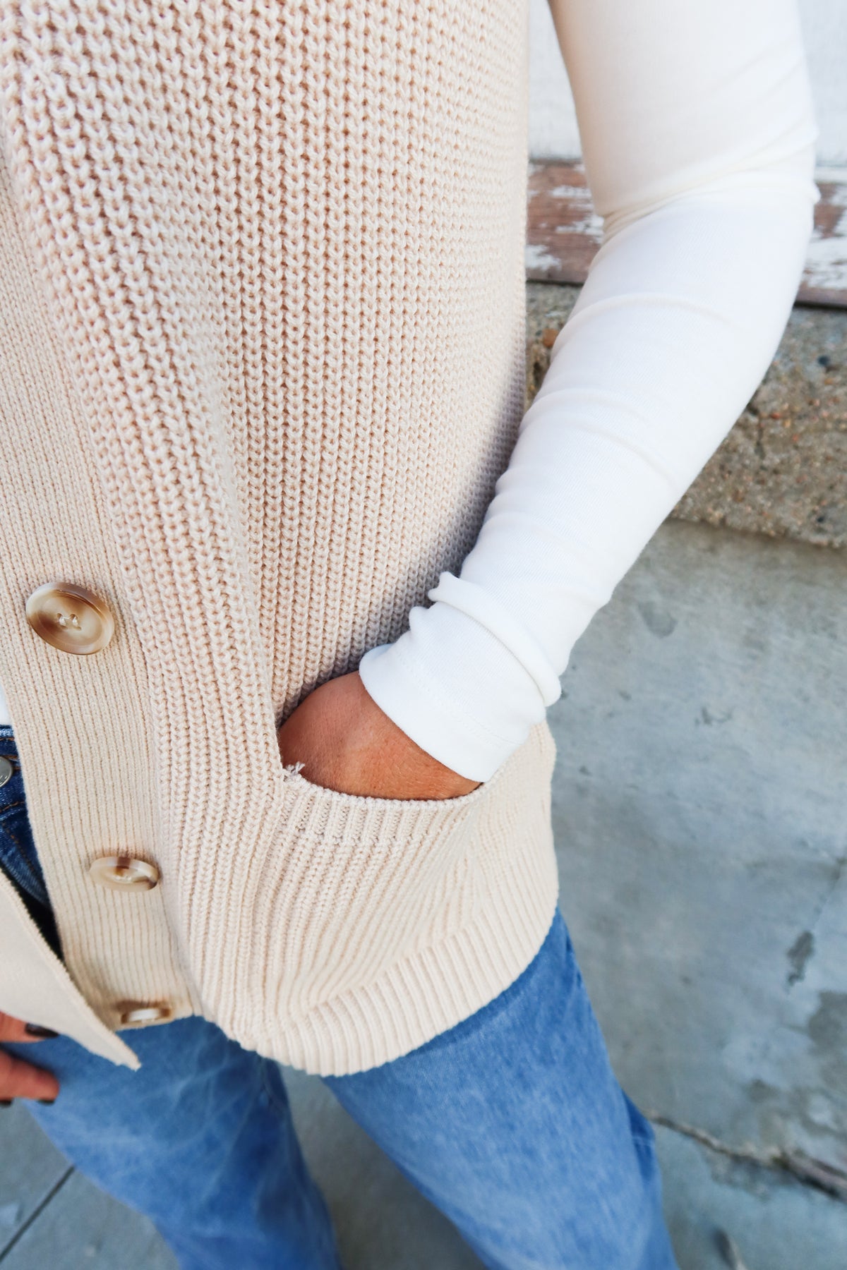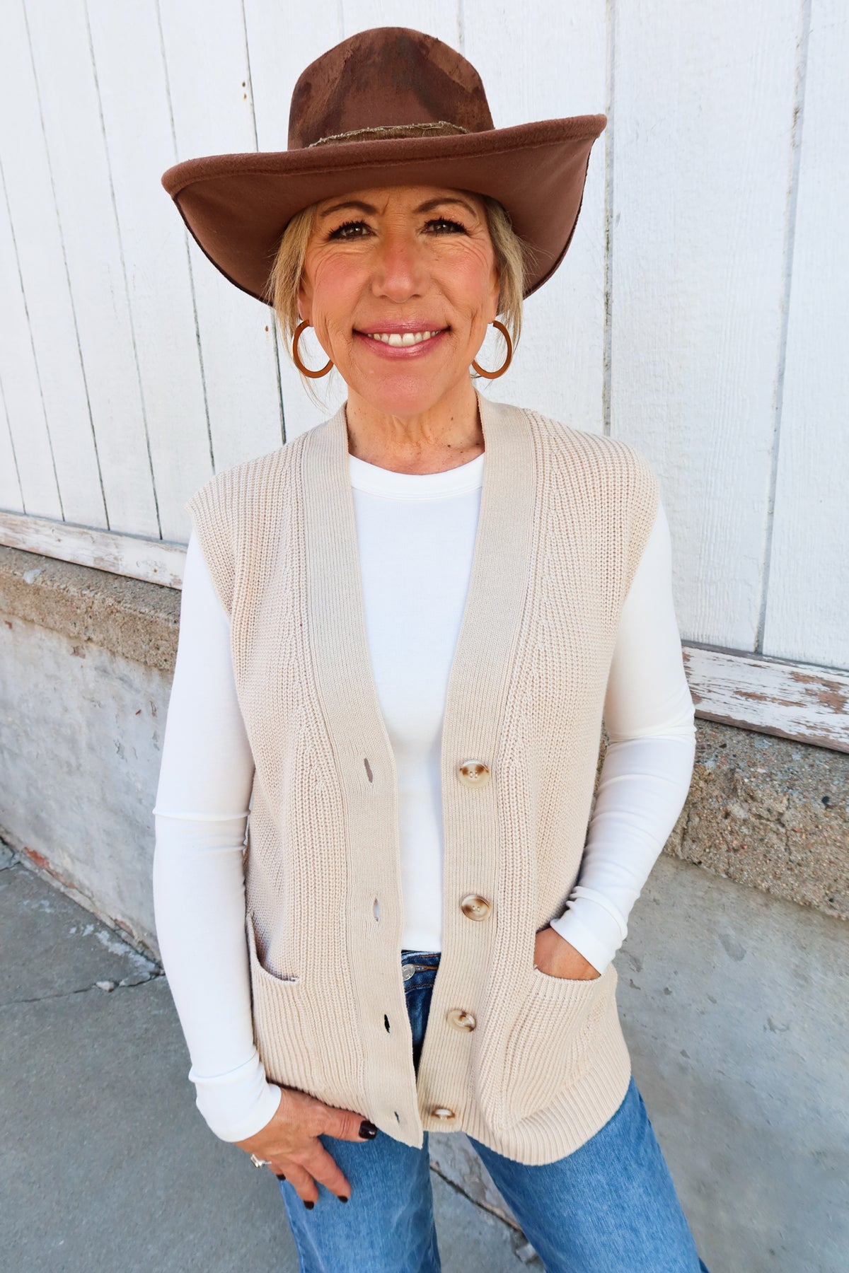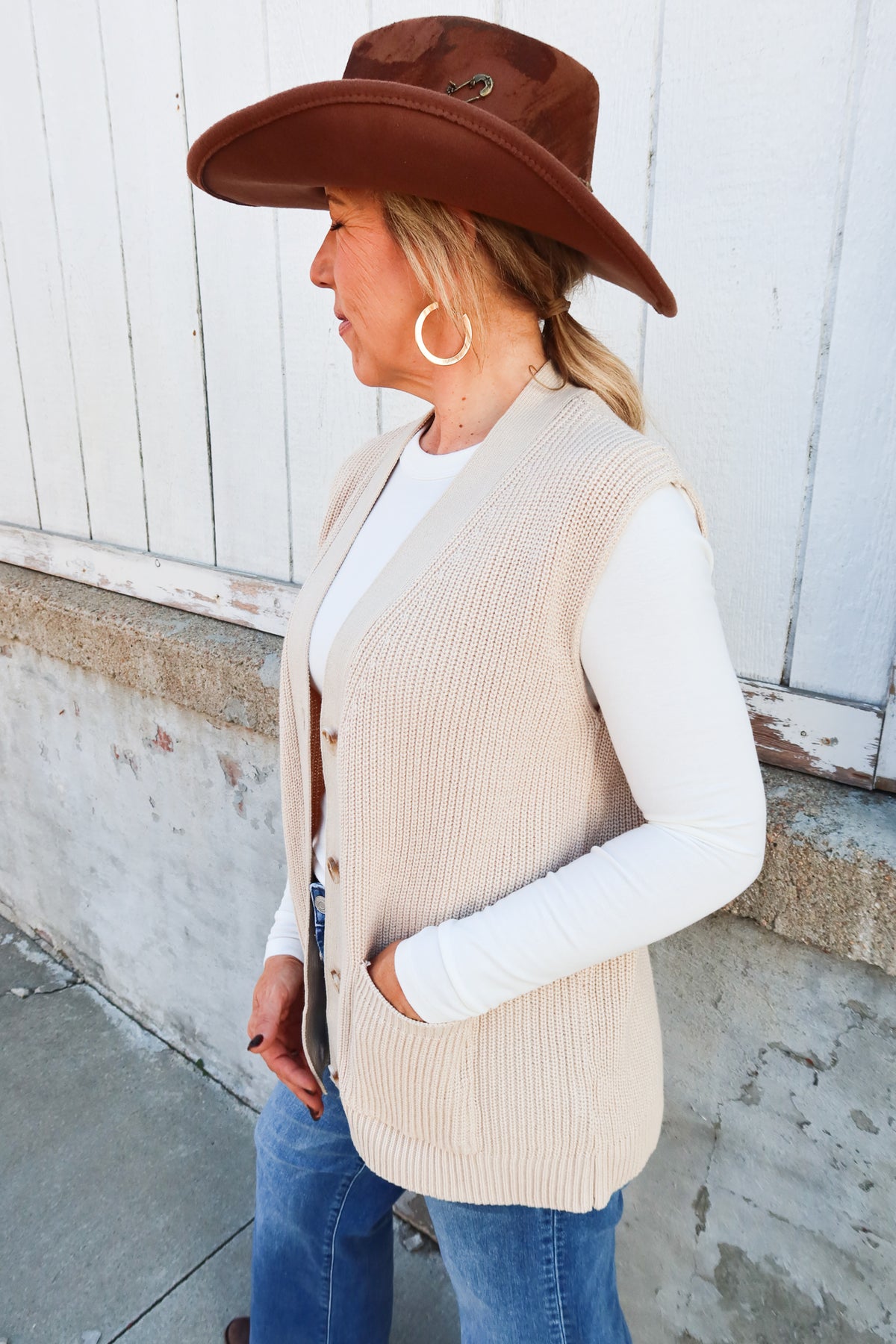 This Natural Chunky Knit Varsity Style Button Up Sweater Vest is the perfect layering piece for cozy fall days. Its soft, chunky knit provides warmth without bulk, making it ideal to pair over shirts or under jackets. The classic varsity style buttons add a timeless touch, effortlessly elevating your autumn wardrobe while keeping you comfortably stylish.