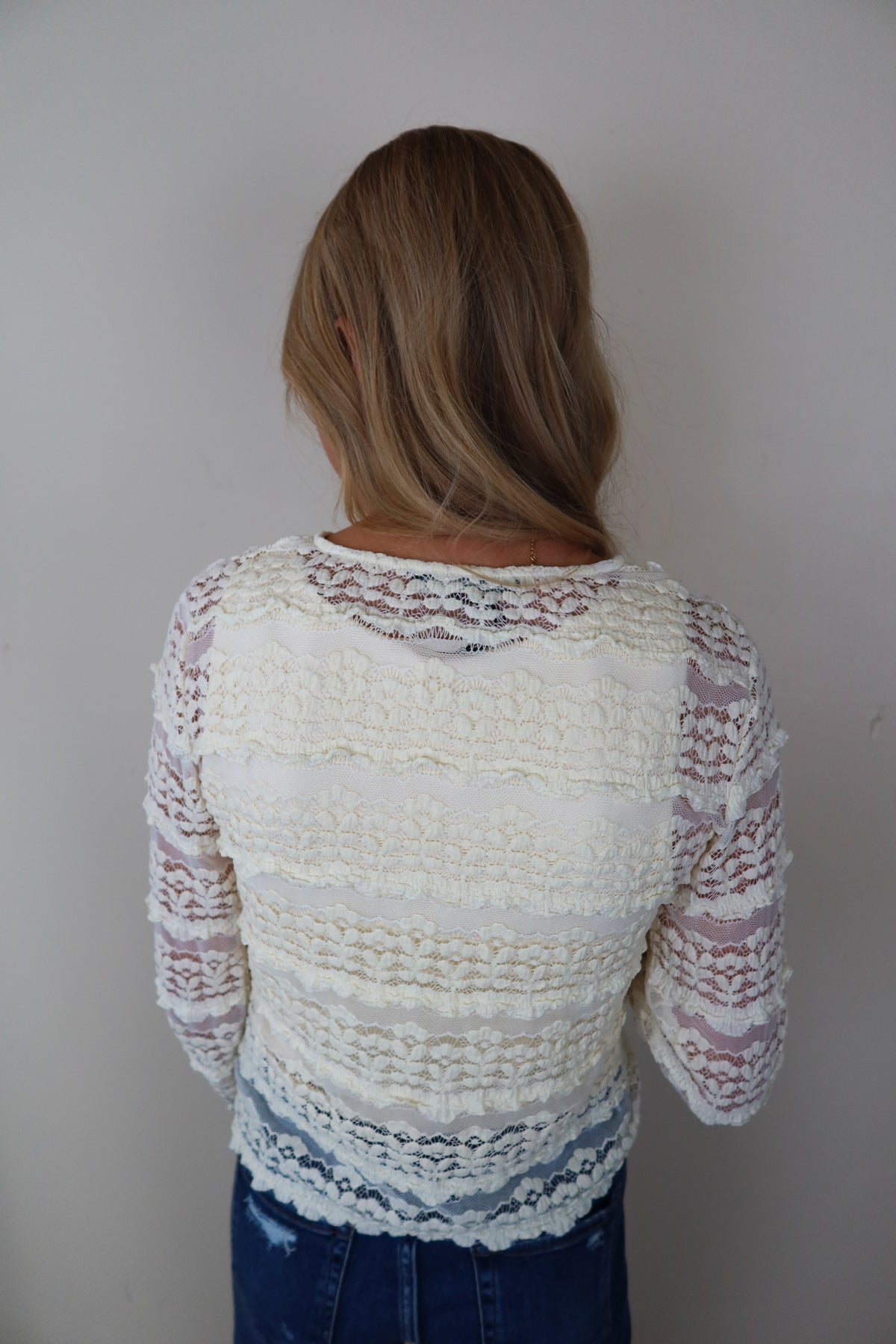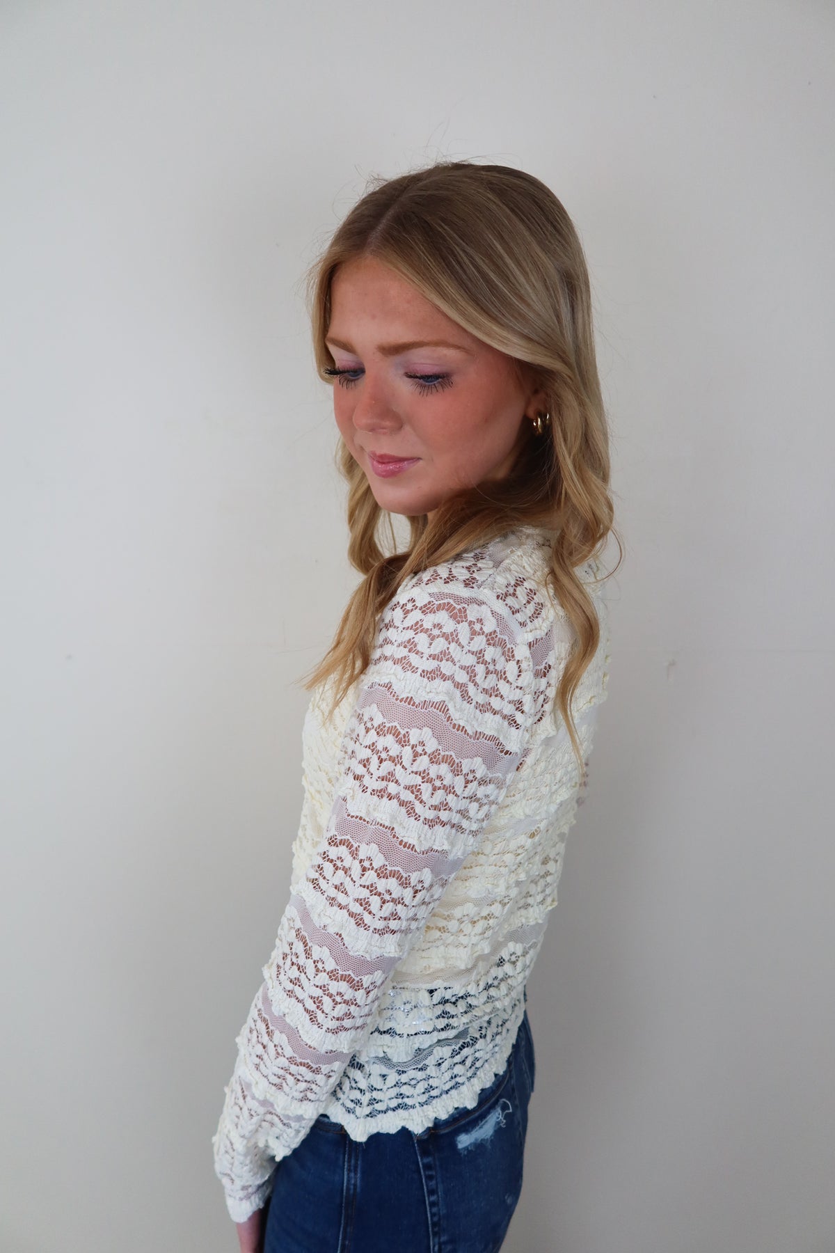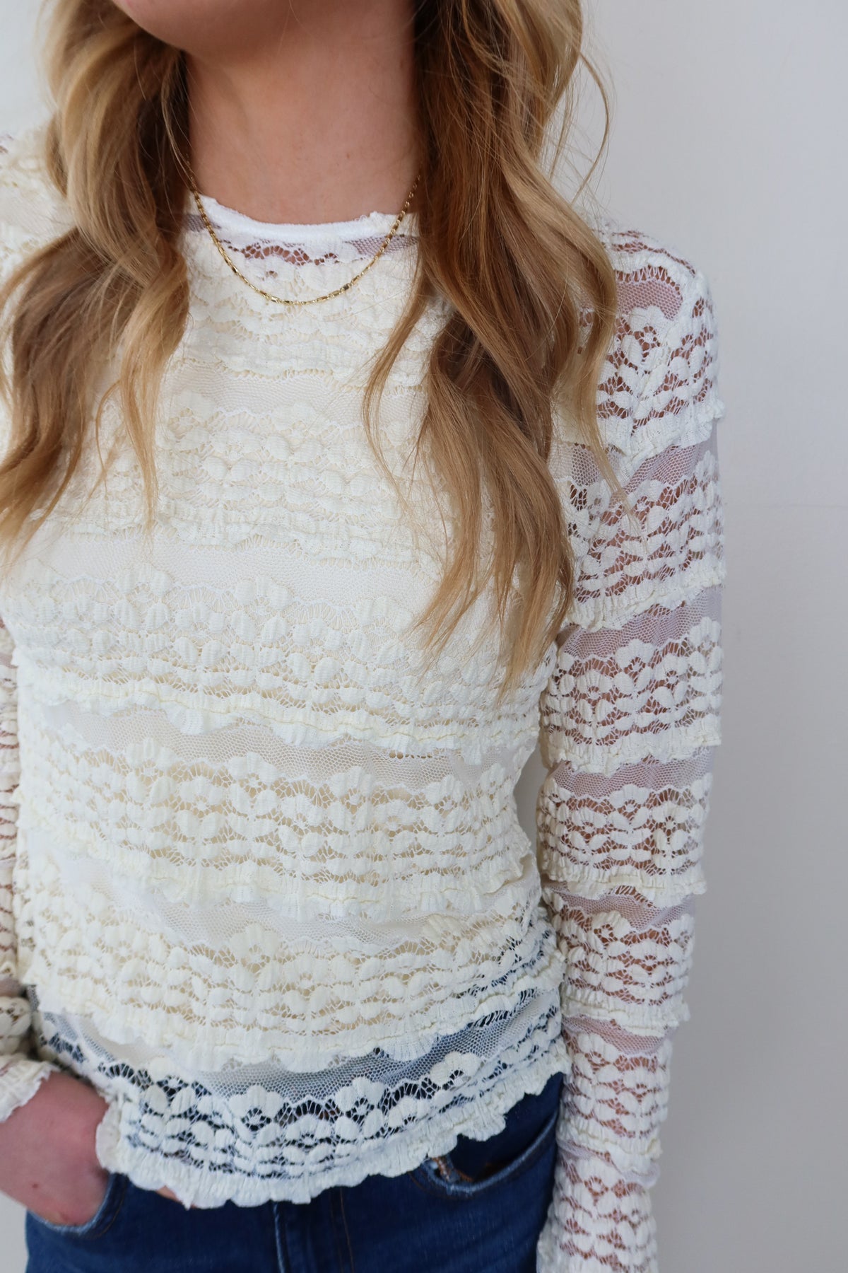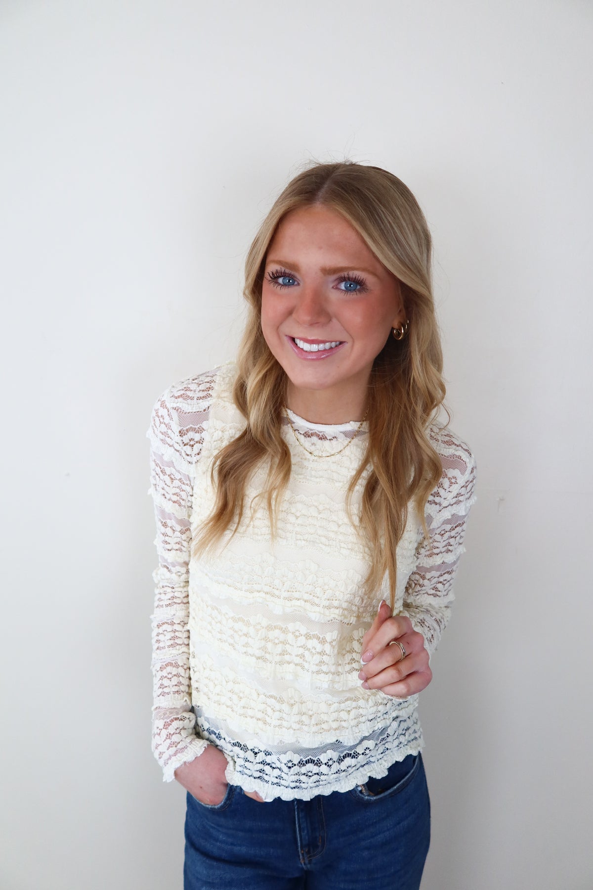 Elevate your wardrobe with this cream long sleeve crew neck stretch lace top, designed for effortless sophistication. The delicate lace detailing adds an elegant touch while the stretchy fabric ensures a comfortable, flattering fit all day long. Perfect for layering under blazers, cardigans, or sheer pieces, this versatile essential transitions seamlessly from office to evening. The timeless crew neckline and classic cream hue make it a go-to piece that pairs with virtually everything in your closet.