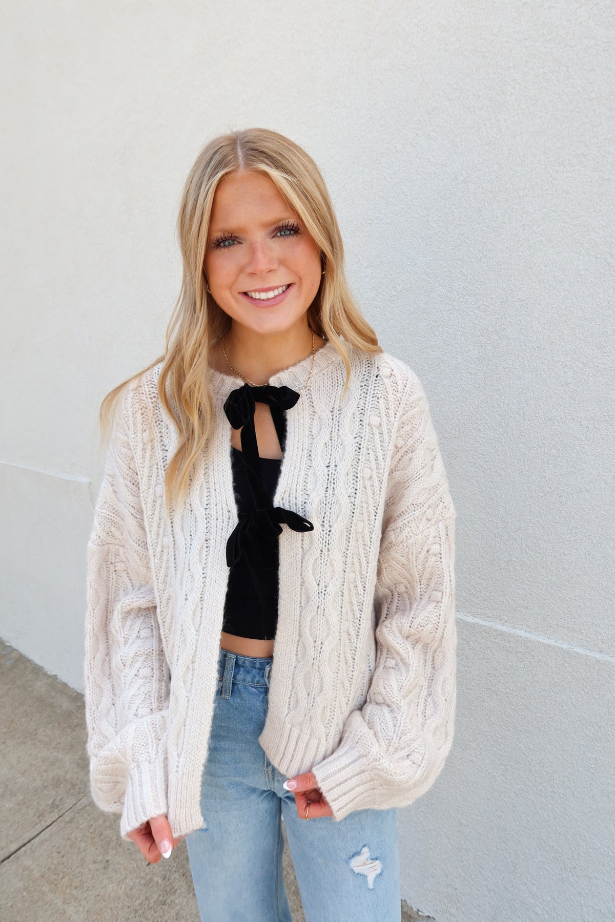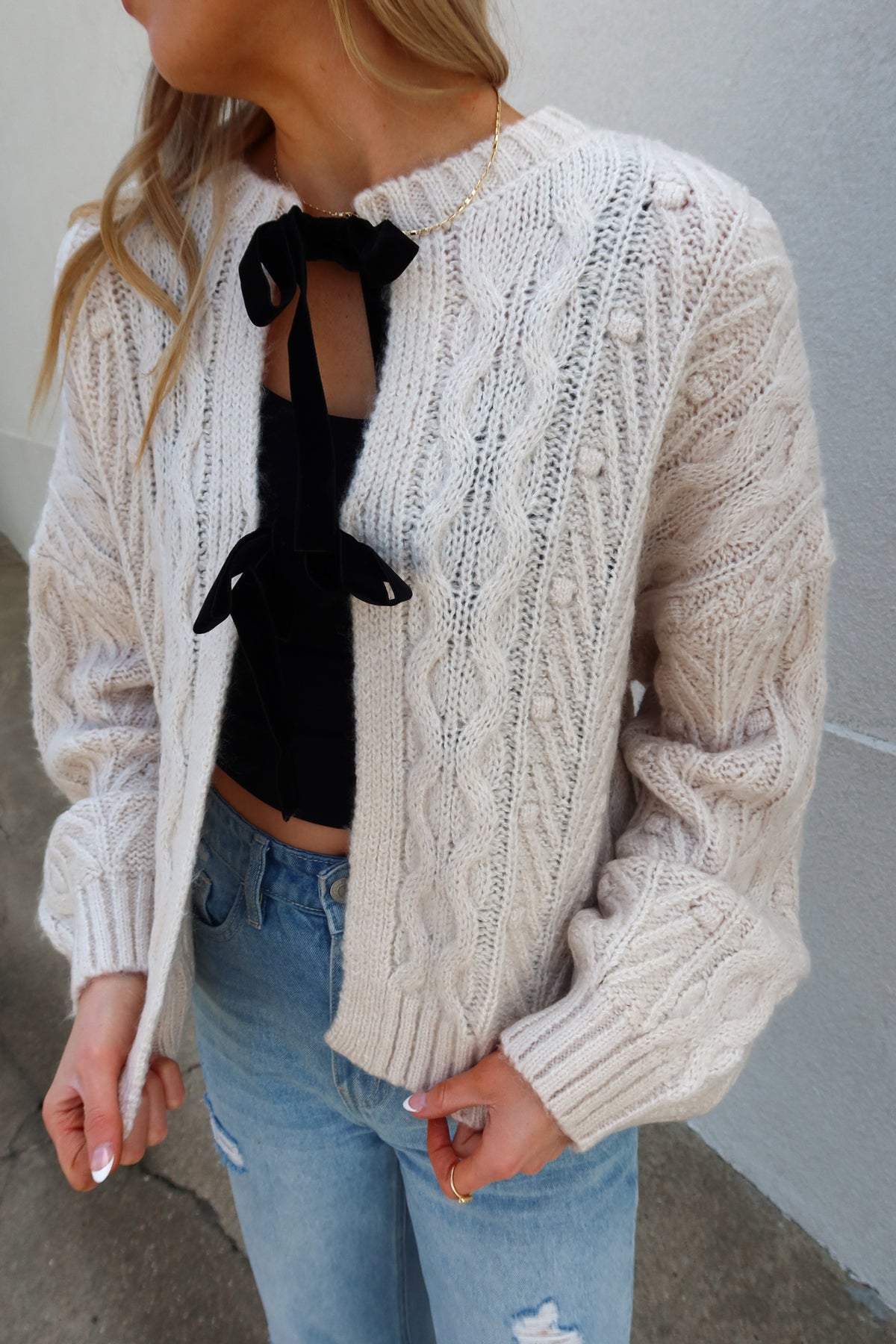 Elevate your wardrobe with the In Love with You Oatmeal Front Tie Cable Cardigan Sweater. Featuring a velvet front tie that adds a stylish focal point, this cardigan offers a flattering length that pairs perfectly with a colored tank underneath for a pop of contrast. Its classic cable knit design makes it a versatile staple for any look, combining comfort with effortless style to keep you cozy and chic all season long.