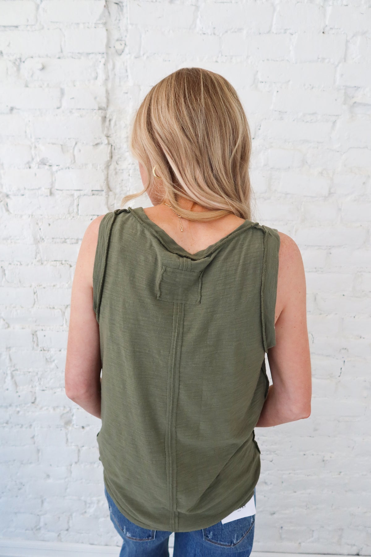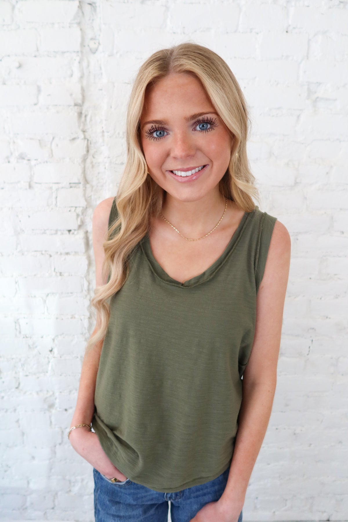 Effortless style meets comfort in this olive tank top, featuring a classic round neckline and casual charm. The lightweight fabric keeps you cool and breezy, while raw edge detailing adds a cute, relaxed touch. Perfect for layering or wearing solo, this versatile piece transitions seamlessly from weekend outings to everyday wear. A wardrobe essential that's as comfortable as it is stylish.