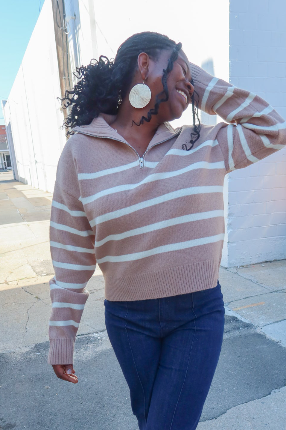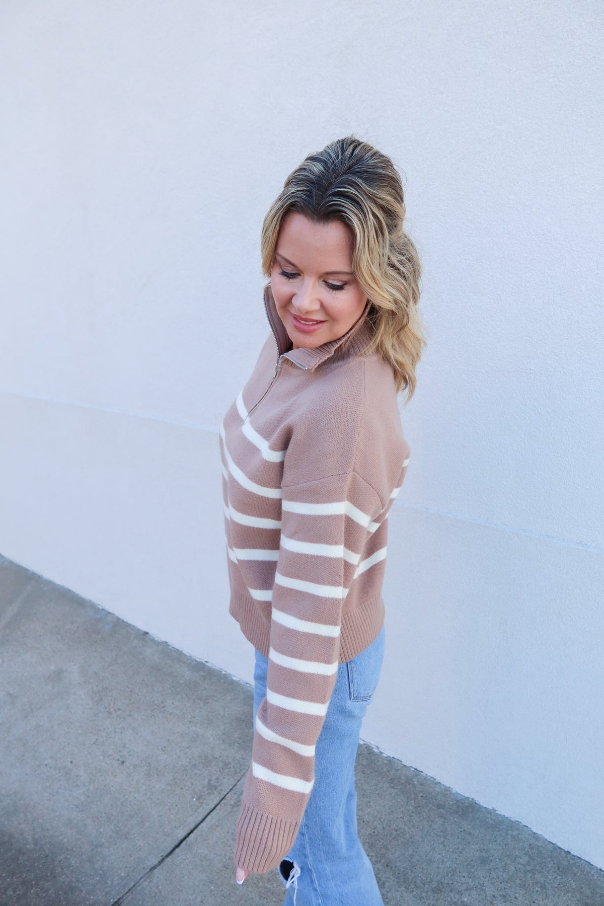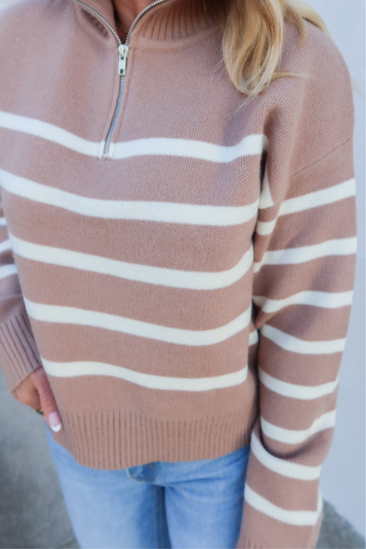 Elevate your casual wardrobe with the Softly Spoken Quarter Zip Sweater. Featuring elegant taupe and cream stripes, this sweater combines timeless style with everyday comfort. The front quarter zip allows for adjustable warmth and effortless layering, making it perfect for cooler days. Soft to the touch and designed for easy wear, this piece offers both versatility and subtle sophistication for your wardrobe.