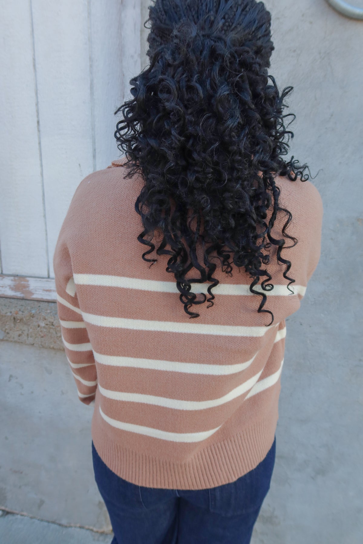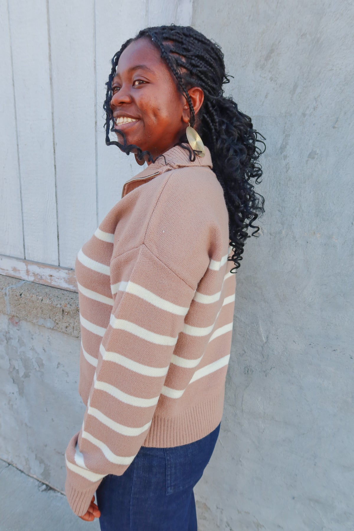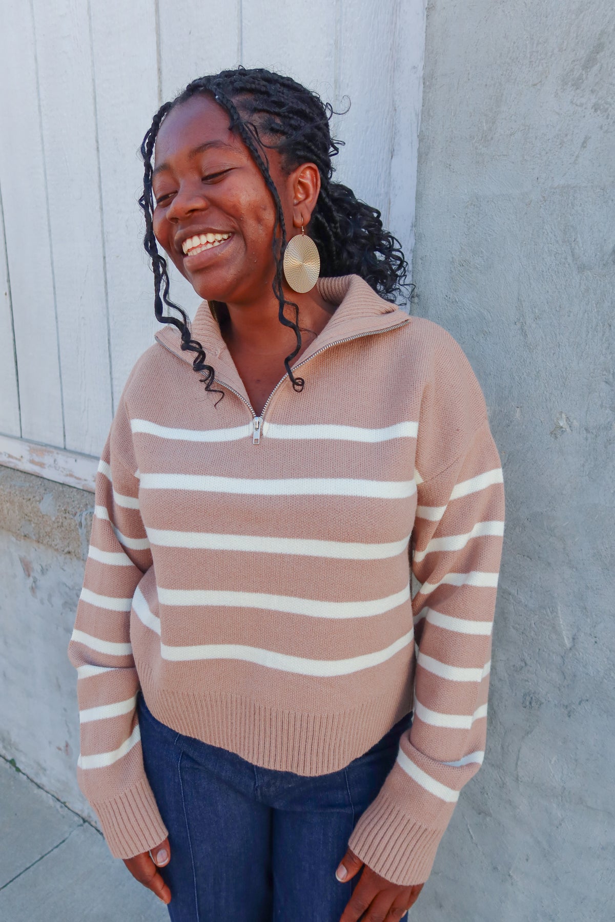 Elevate your casual wardrobe with the Softly Spoken Quarter Zip Sweater. Featuring elegant taupe and cream stripes, this sweater combines timeless style with everyday comfort. The front quarter zip allows for adjustable warmth and effortless layering, making it perfect for cooler days. Soft to the touch and designed for easy wear, this piece offers both versatility and subtle sophistication for your wardrobe.