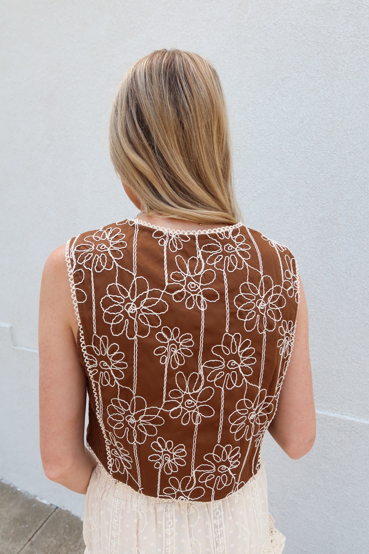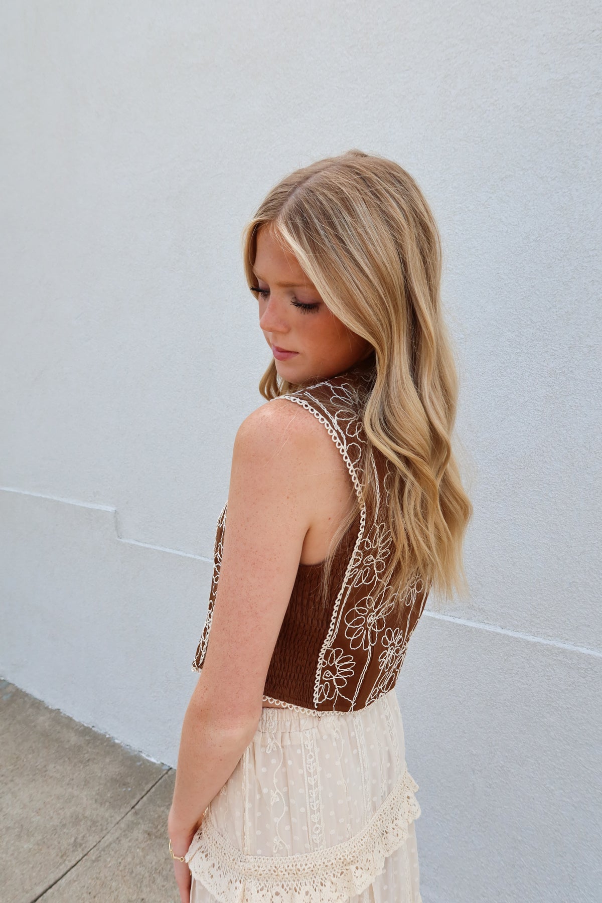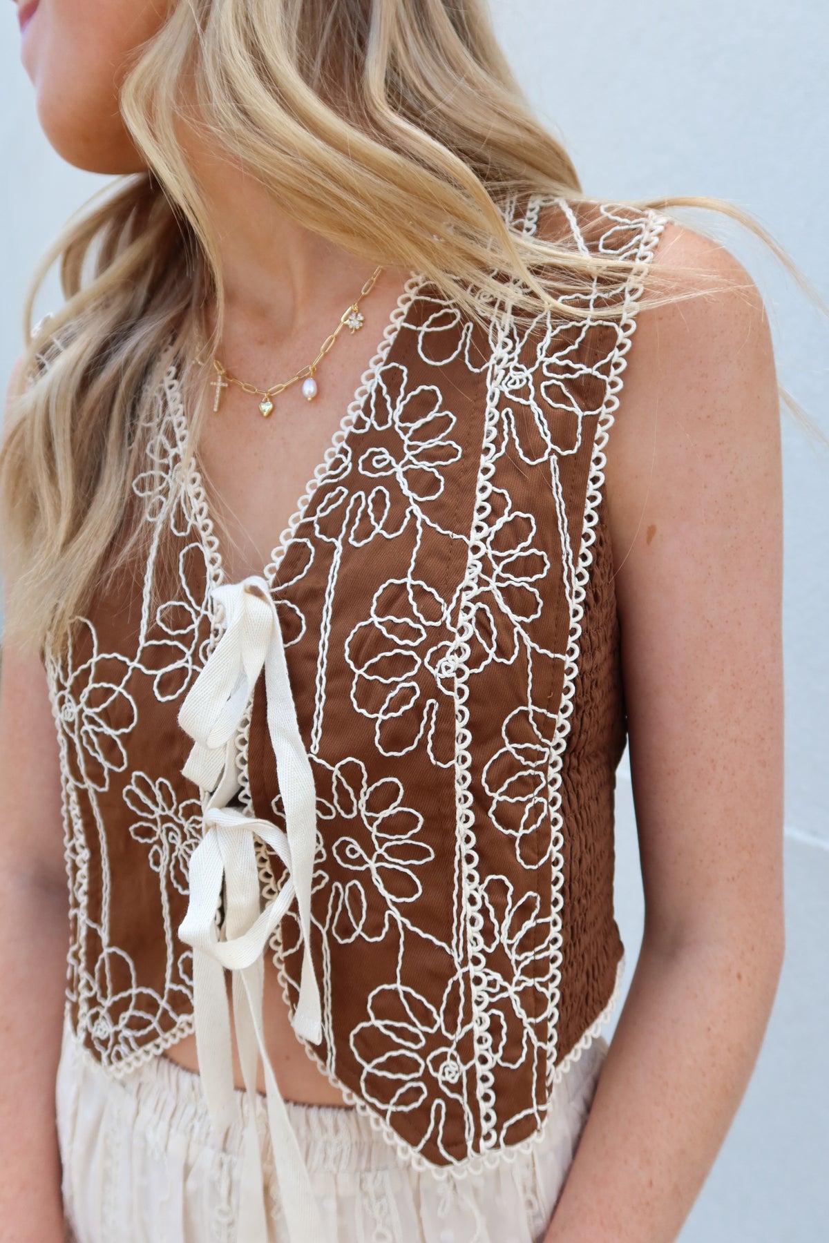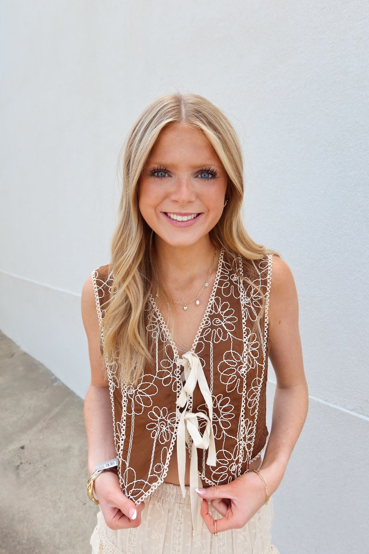 Elevate your style with the Golden Hour Embroidered Tie Front Vest. Featuring intricate boho-inspired embroidery and a flattering front tie, this vest adds a touch of effortless charm to any outfit. Perfect for layering, it enhances your look with subtle detail and a relaxed, breezy vibe.