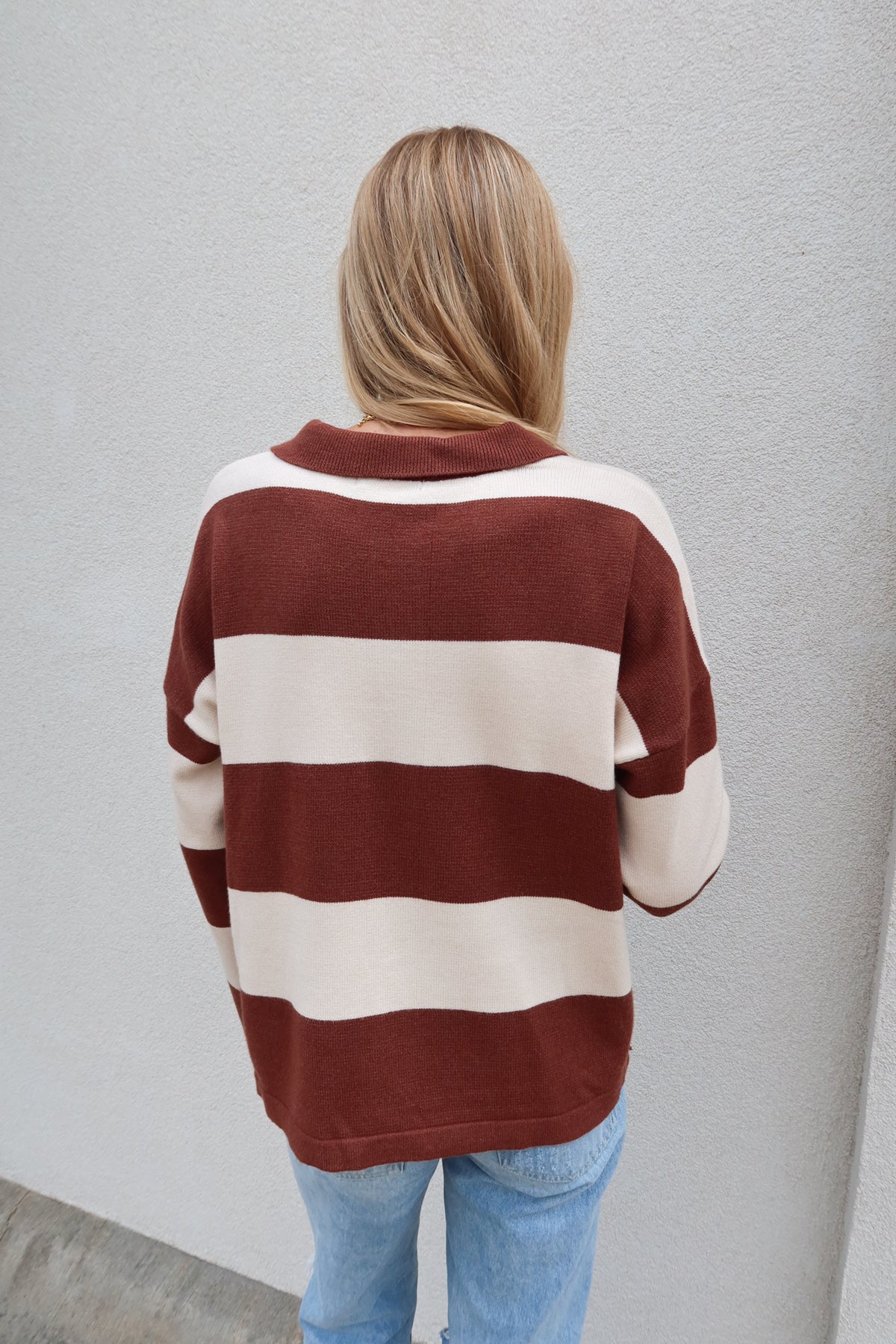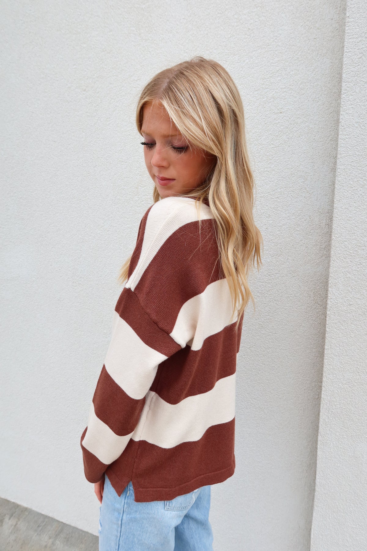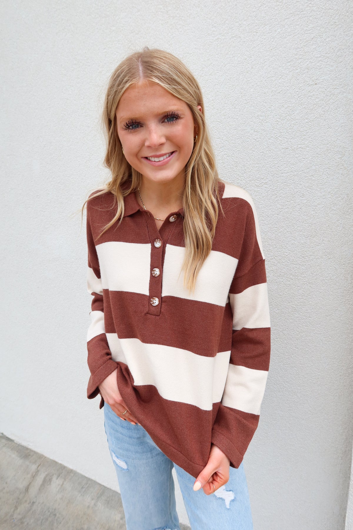 Embrace cozy style with the Latte Lines Brown Striped Sweater, designed to add warmth and effortless charm to your wardrobe. Its soft fabric and classic striped pattern create a versatile look perfect for layering or wearing on its own. Ideal for casual outings or relaxed days, this sweater combines comfort and timeless design to keep you looking polished and feeling comfortable all day long.