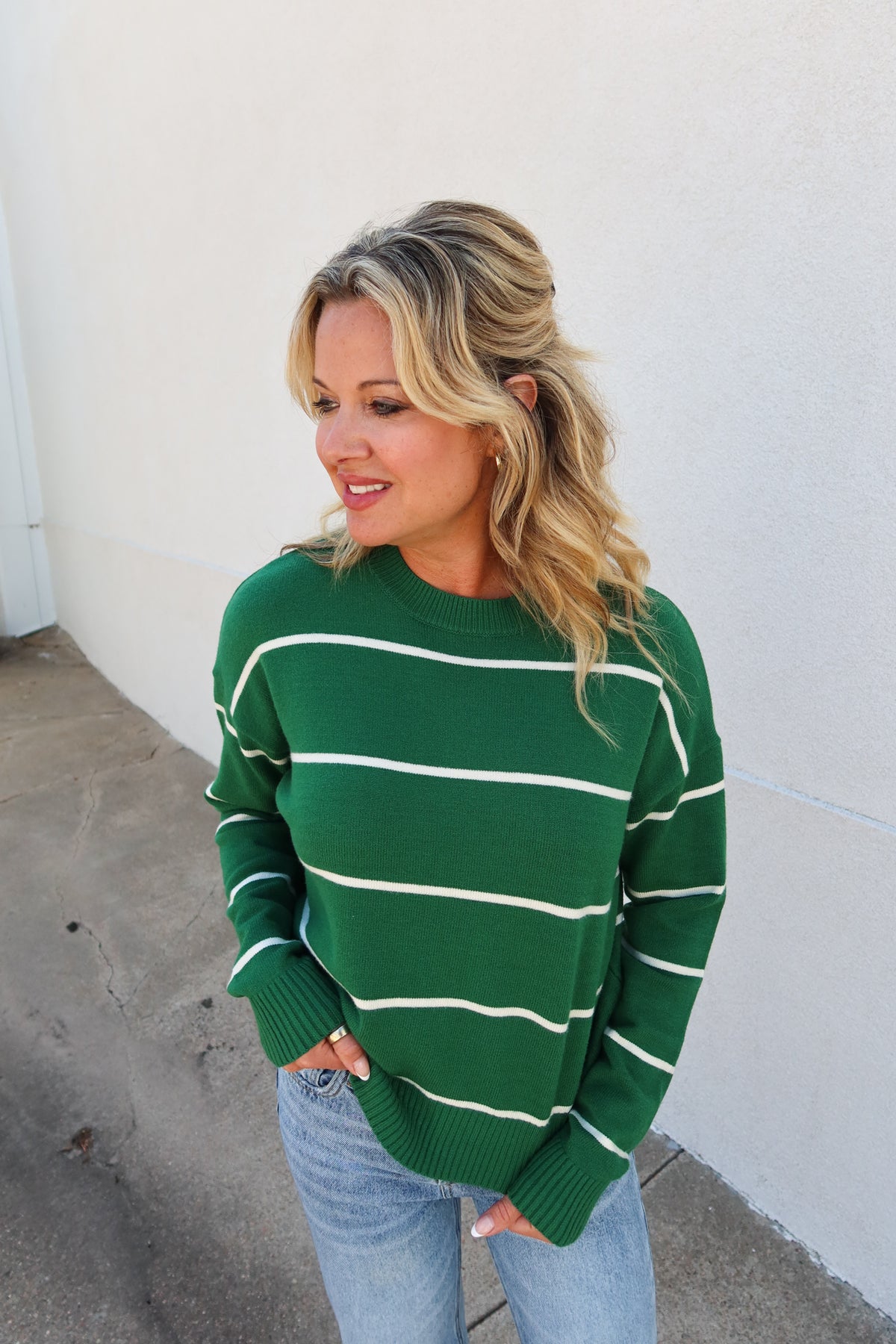 Experience cozy comfort with the Be Your Favorite Green Striped Sweater, crafted from soft fabric that feels gentle on your skin. Its classic white stripes add a fresh, stylish touch, making it the perfect choice for casual outings or layering on cooler days. Embrace warmth and effortless style in one versatile sweater.