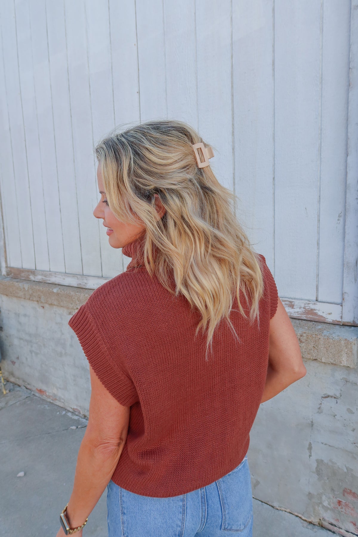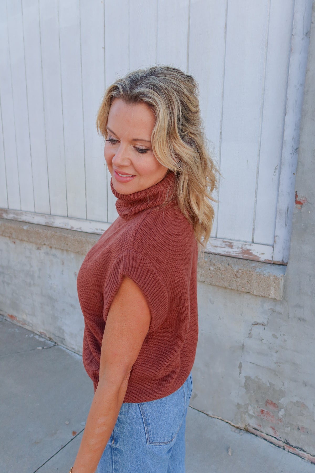 This brown sleeveless turtle neck sweater vest is the perfect cozy addition to your fall wardrobe. Its warm, soft fabric keeps you comfortable on crisp autumn days while the sleeveless design lets you layer effortlessly. Embrace seasonal style and versatility with a piece that easily pairs with your favorite long sleeves or jackets for a chic, layered look.