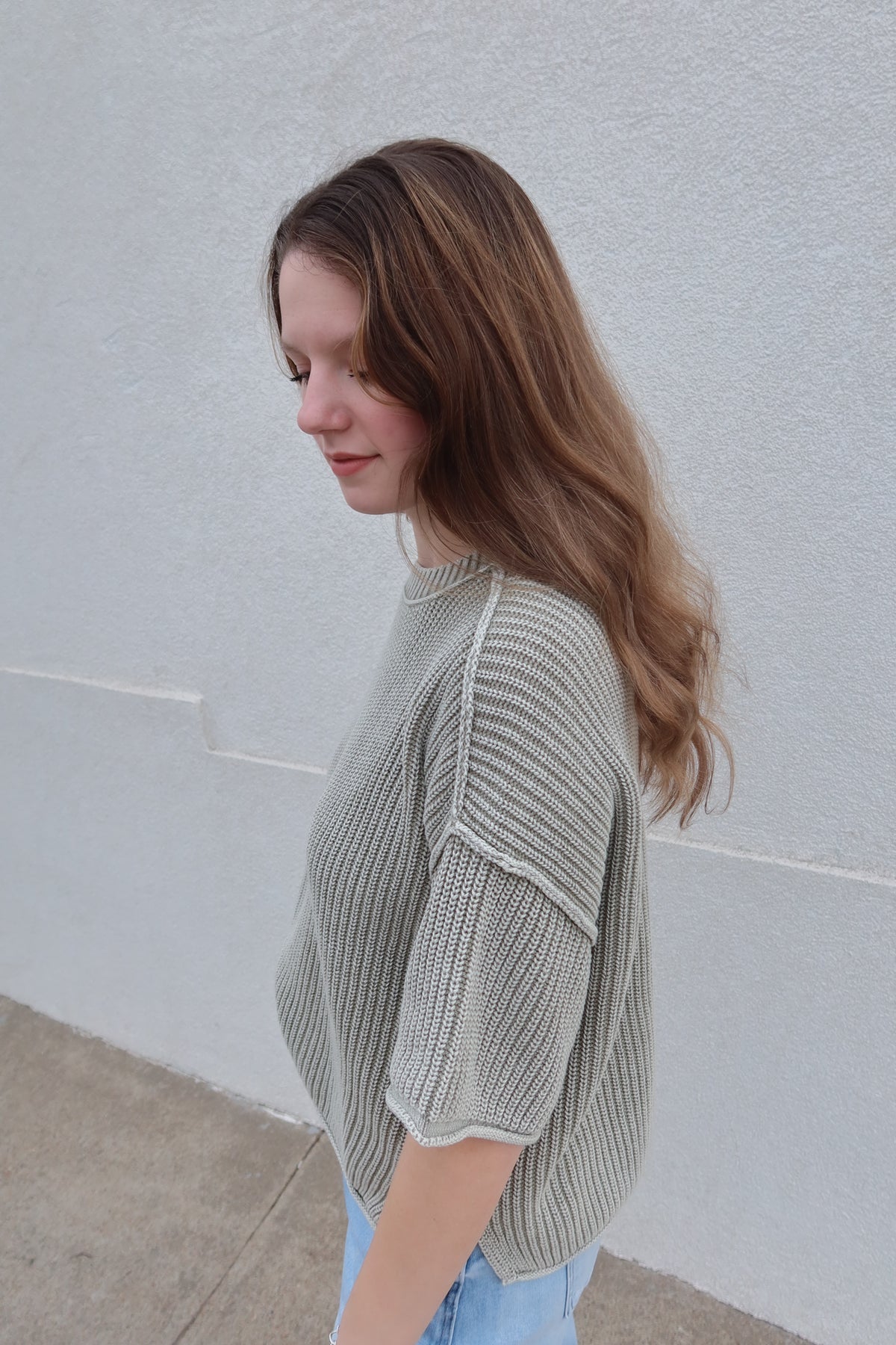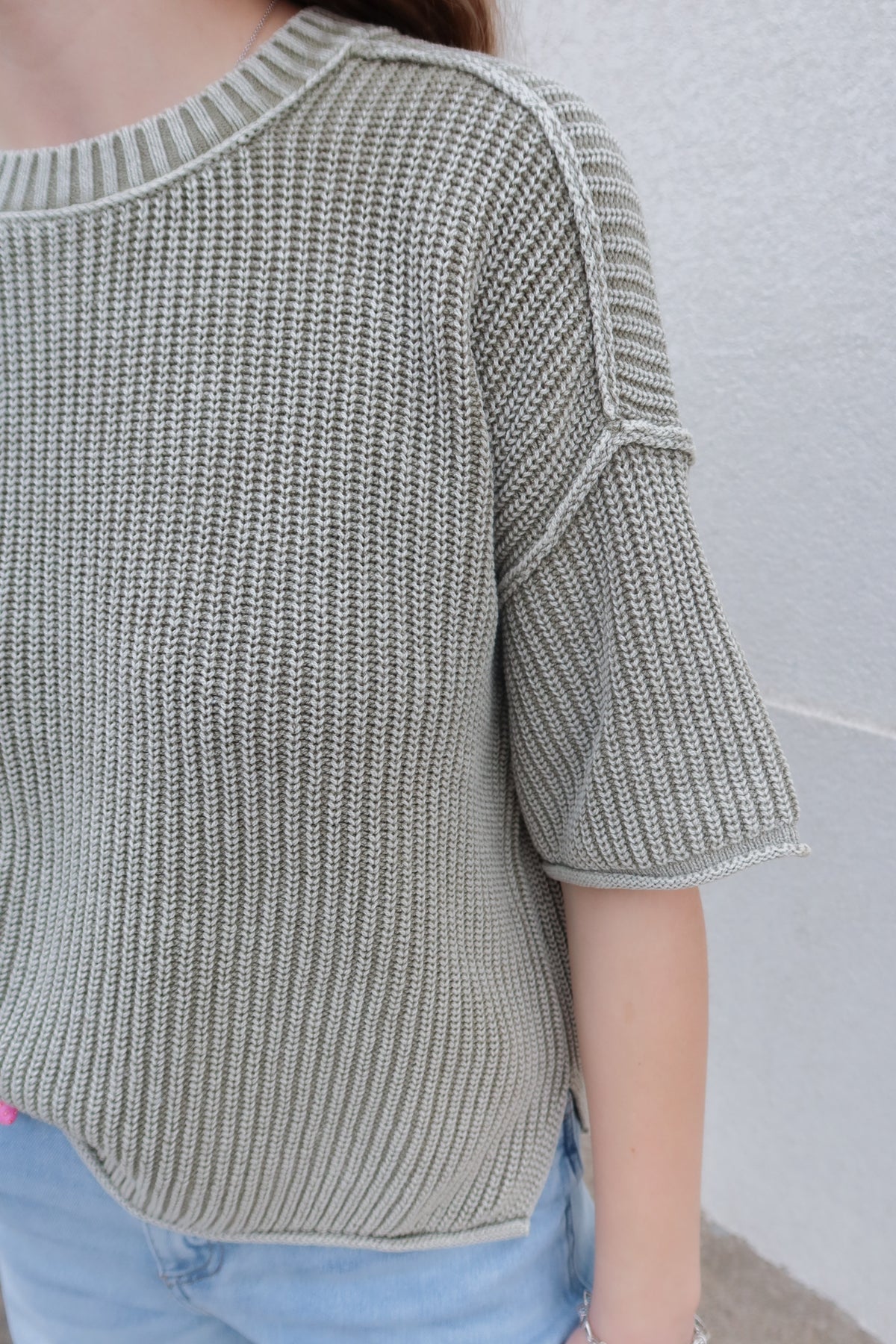 Embrace effortless spring style with this olive crew neck sweater, designed for warmth without the weight. The raw edge detailing adds contemporary edge to a timeless silhouette, while the lightweight knit keeps you comfortable as temperatures rise. Perfect for layering or wearing solo, this versatile piece transitions seamlessly from casual days to relaxed evenings. The rich olive tone pairs beautifully with any wardrobe, making it an essential addition to your seasonal rotation.
