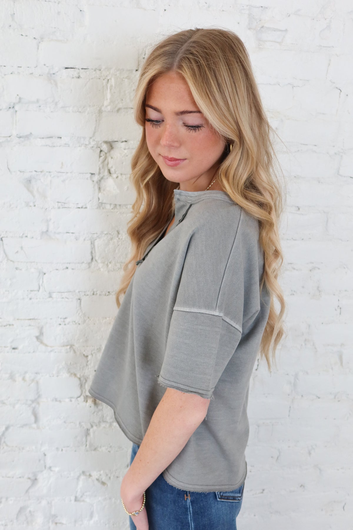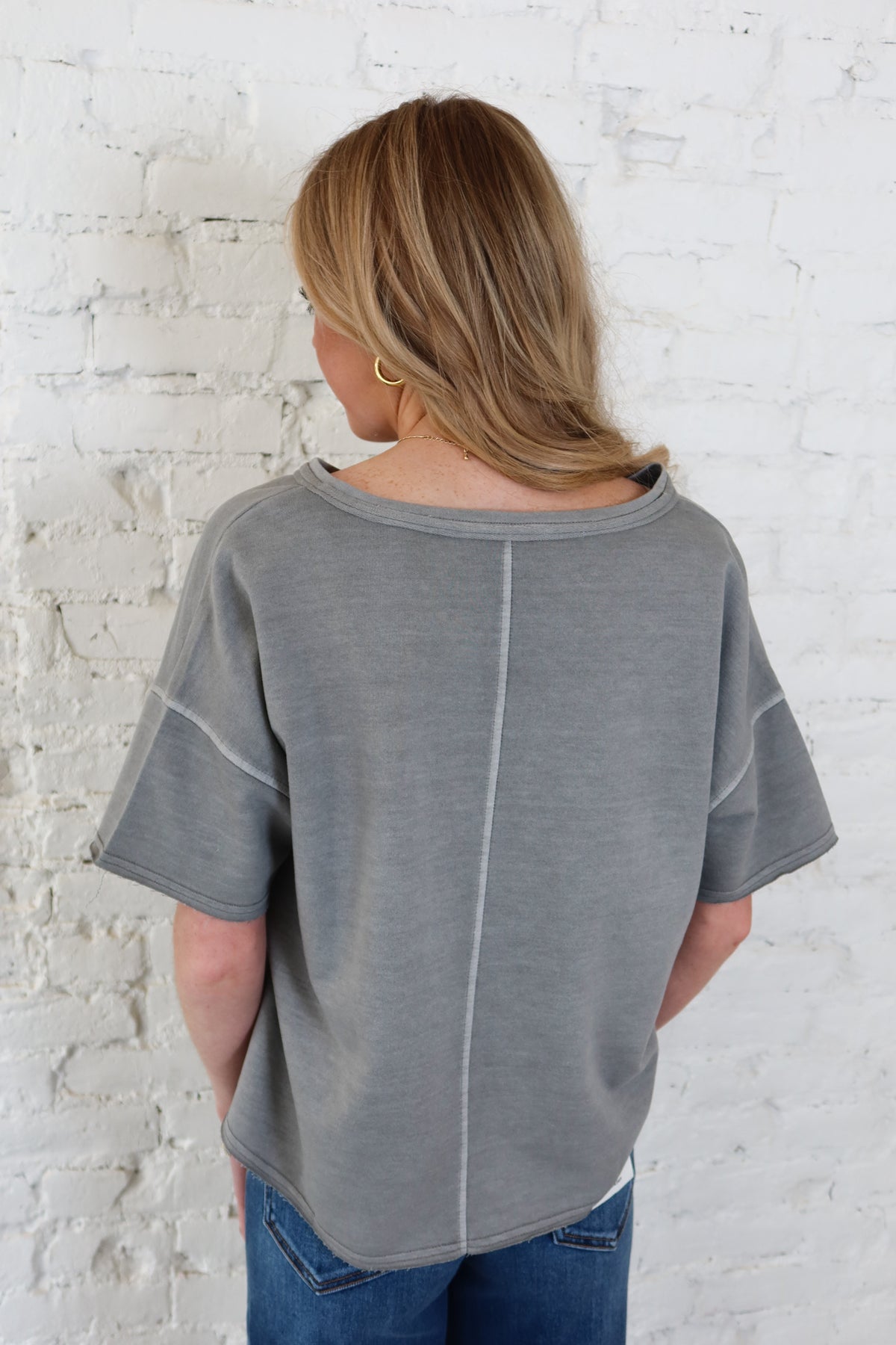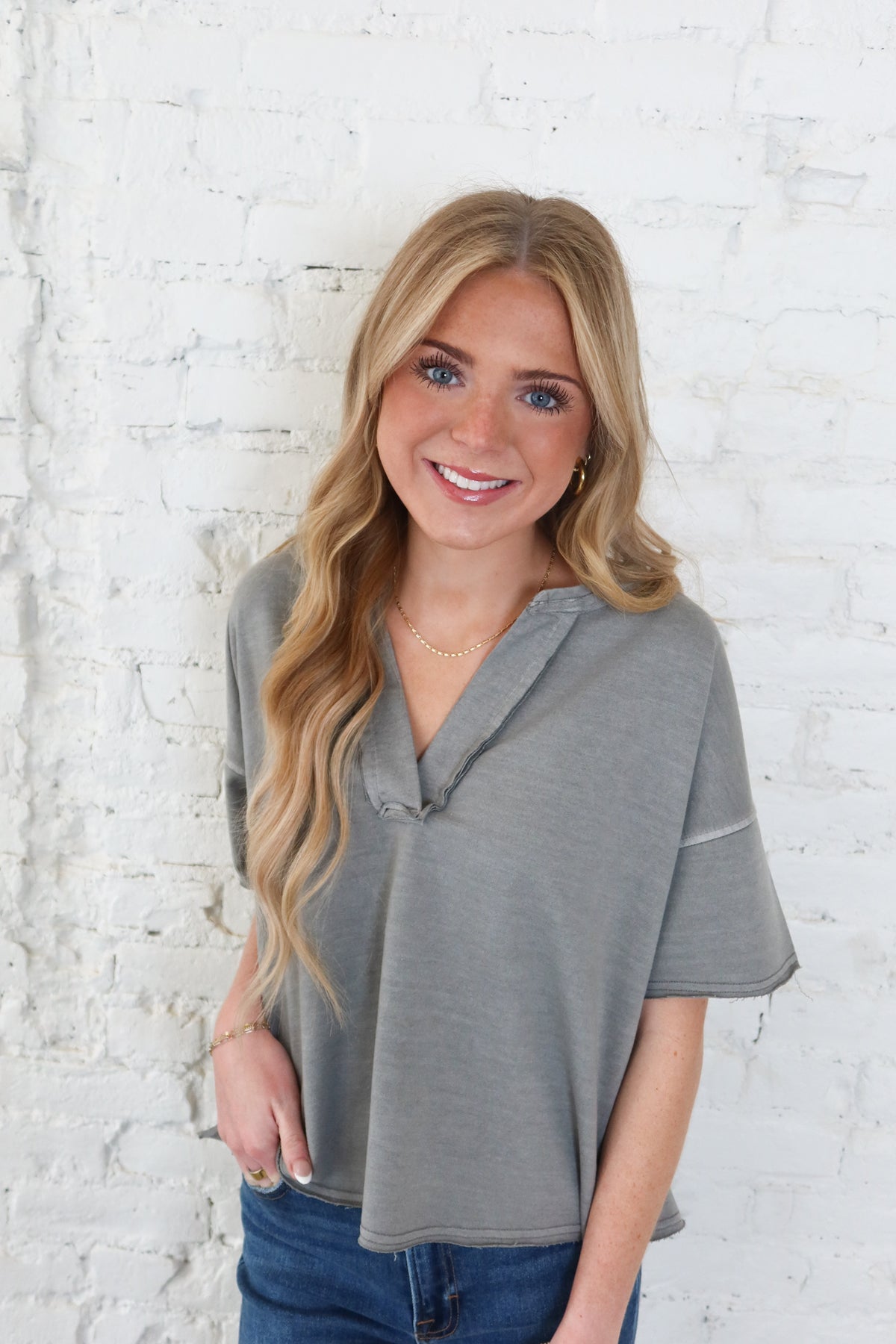 Effortless style meets modern comfort in this oversized grey top. Featuring a flattering v-slip neckline and relaxed drop shoulders for a contemporary silhouette, this piece drapes beautifully on all body types. Raw edge detailing adds an edgy, finished touch that elevates casual wear. Perfect for layering or wearing solo, this versatile top transitions seamlessly from day to night.