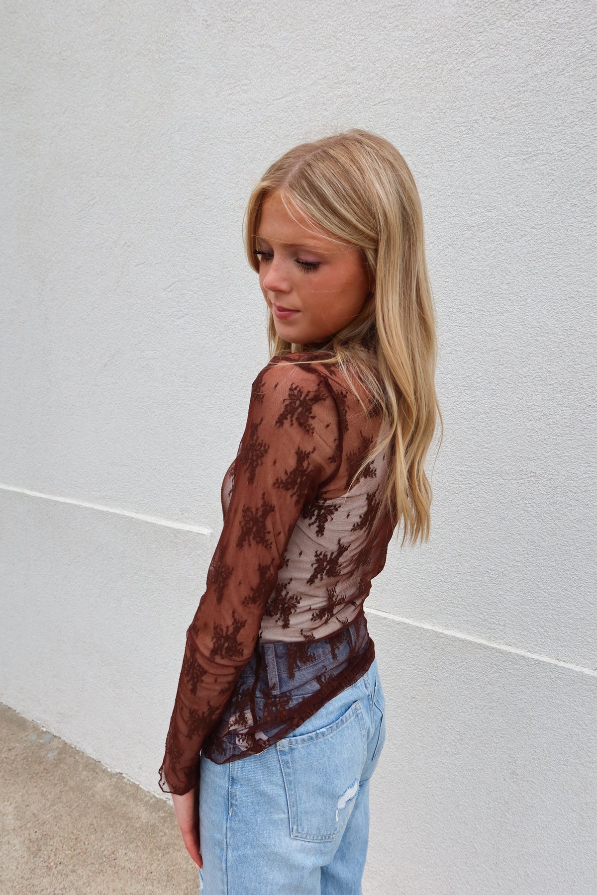 Elevate your wardrobe with the Vintage Whisper Brown Lace Layering Top. Its delicate brown lace offers a timeless, romantic touch perfect for layering. The lightweight fabric ensures comfortable wear all day, making it an ideal choice to effortlessly enhance any outfit with subtle sophistication and charm.