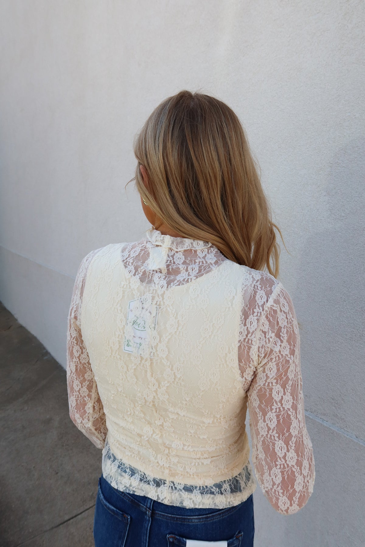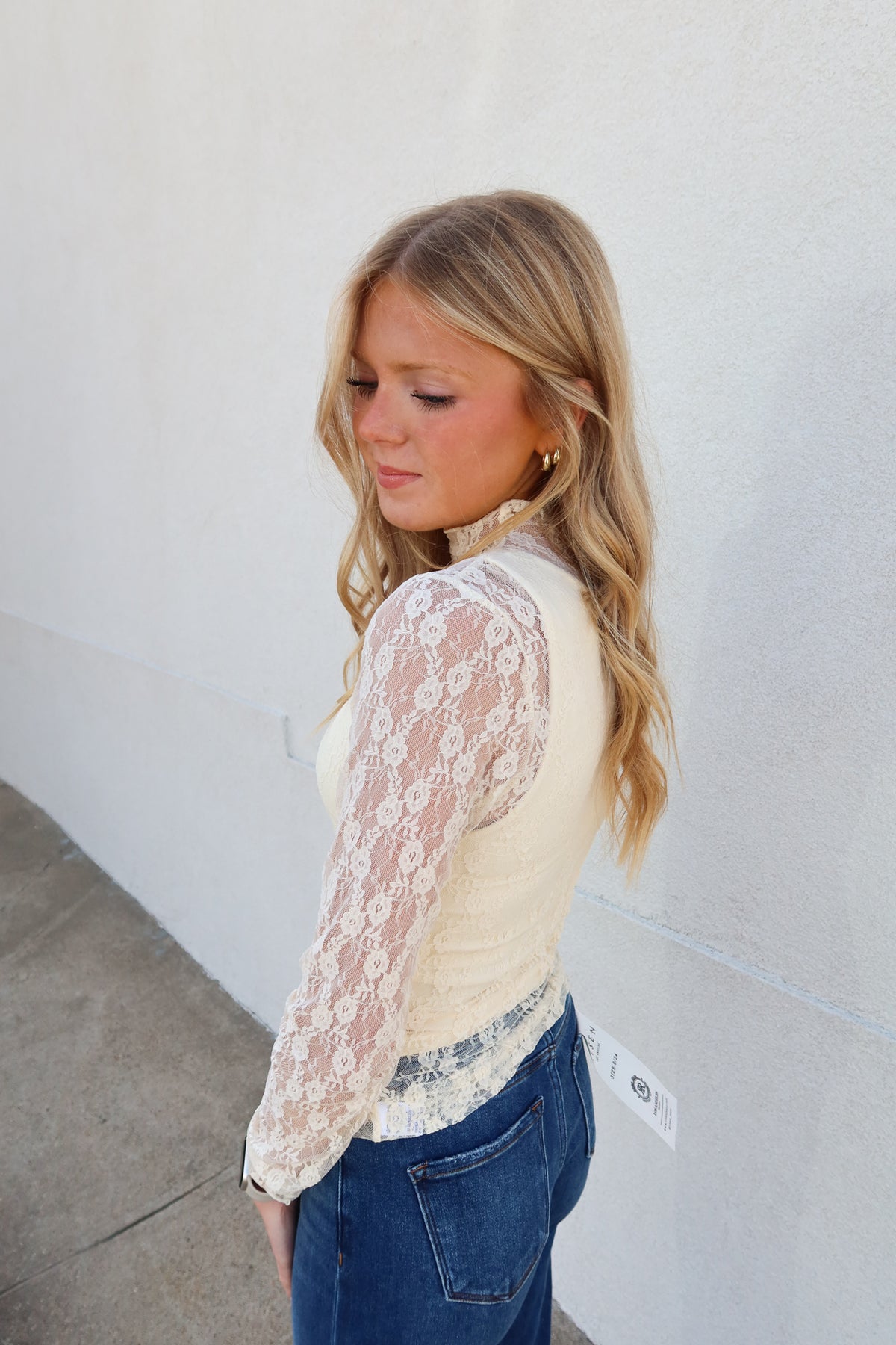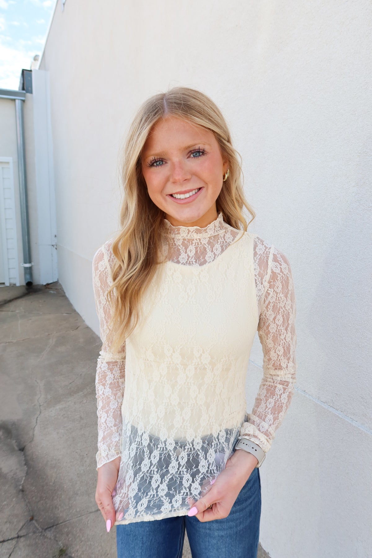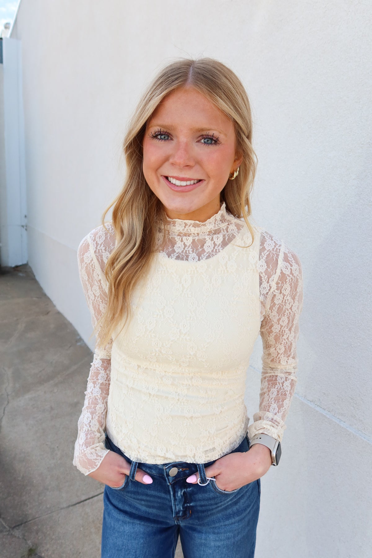 Elevate your fall wardrobe with the Champagne Long Sleeve Lace Top, designed for effortless layering. Its delicate lace detail adds a touch of daintiness and elegance, perfect for pairing under sweaters or jackets. Lightweight and versatile, this top keeps you stylish and comfortable throughout the season. Embrace cozy sophistication with this timeless layering essential.