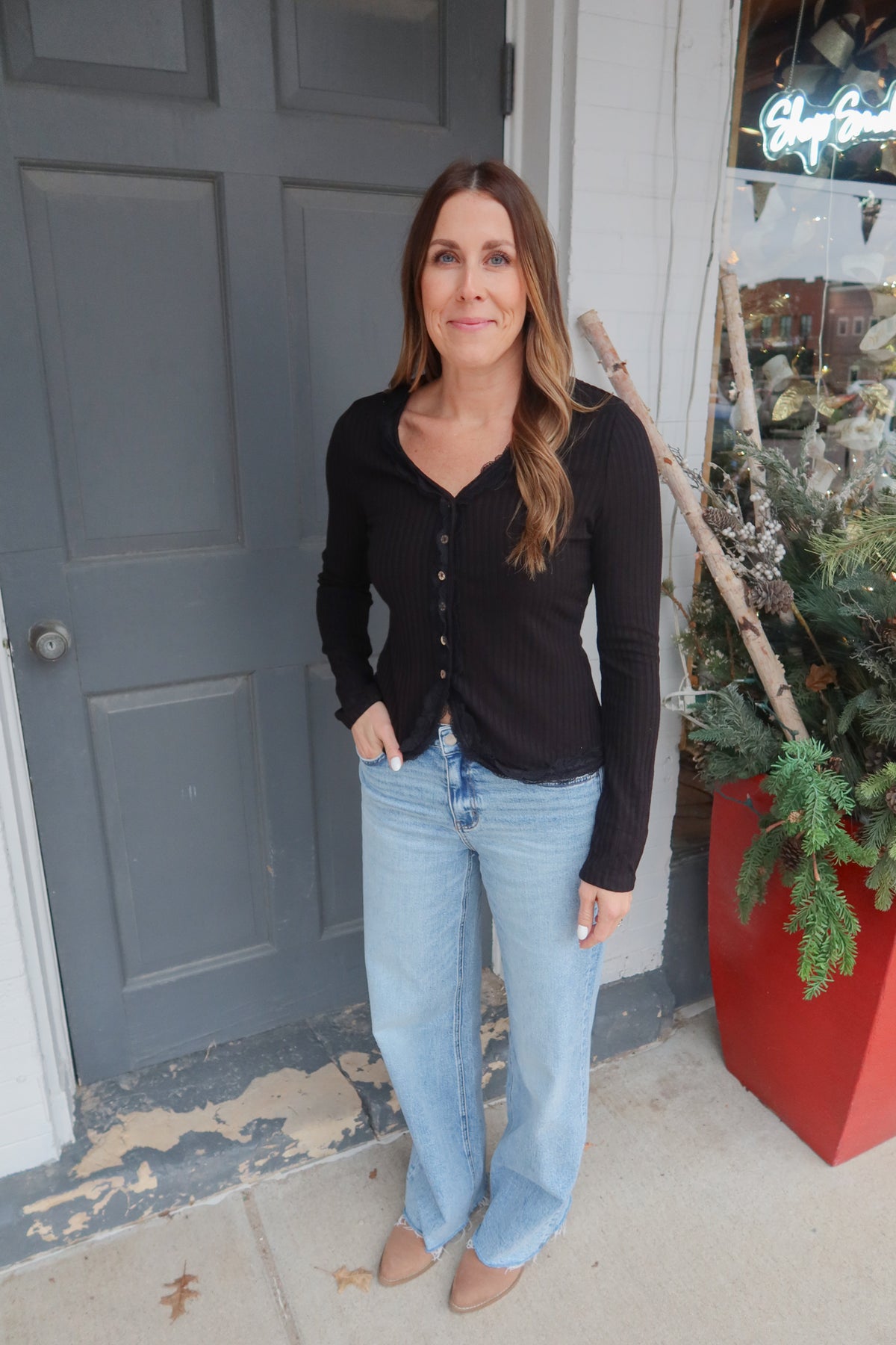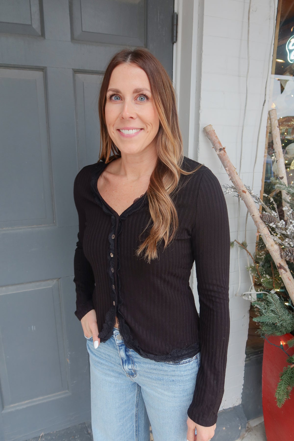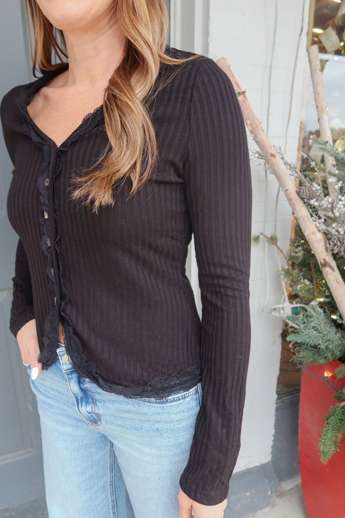 Elevate your everyday wardrobe with this sophisticated black button-down top, designed to flatter and impress. The front button details create a polished, intentional look that transitions seamlessly from office to evening, while delicate lace trim adds an unexpected touch of elegance and femininity. The fitted silhouette hugs your curves in all the right places, offering a streamlined appearance that works beautifully on its own or layered under your favorite pieces. Perfect for those who appreciate quality craftsmanship and timeless style.