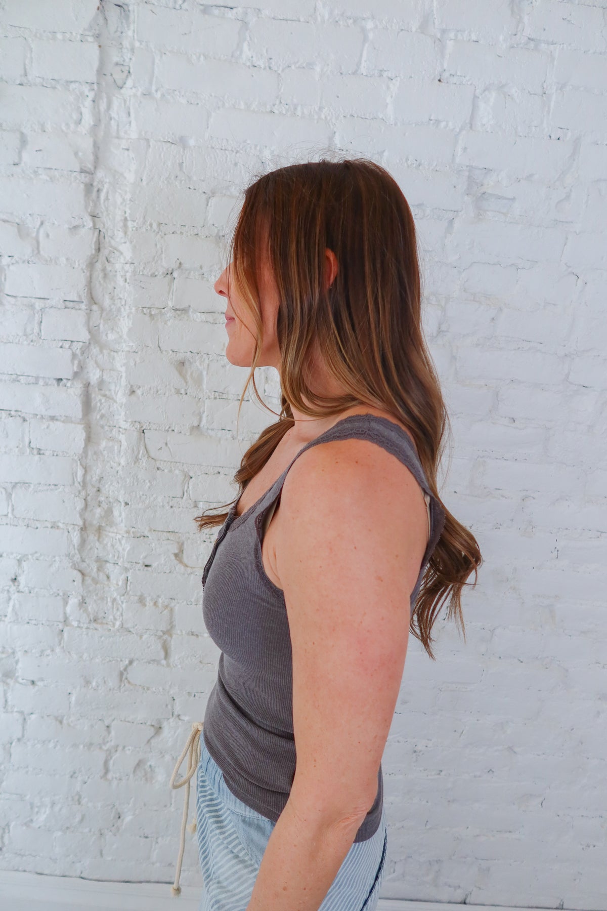 Elevate your everyday wardrobe with this sophisticated grey tank top, featuring a half button-up front that offers effortless style versatility. Delicate lace trim details add a touch of elegance and femininity, making it perfect for layering or wearing solo. The soft, breathable fabric ensures all-day comfort, while the refined design transitions seamlessly from casual daytime looks to evening outings. Whether paired with jeans, skirts, or tailored trousers, this piece becomes an essential staple that works harder in your closet.