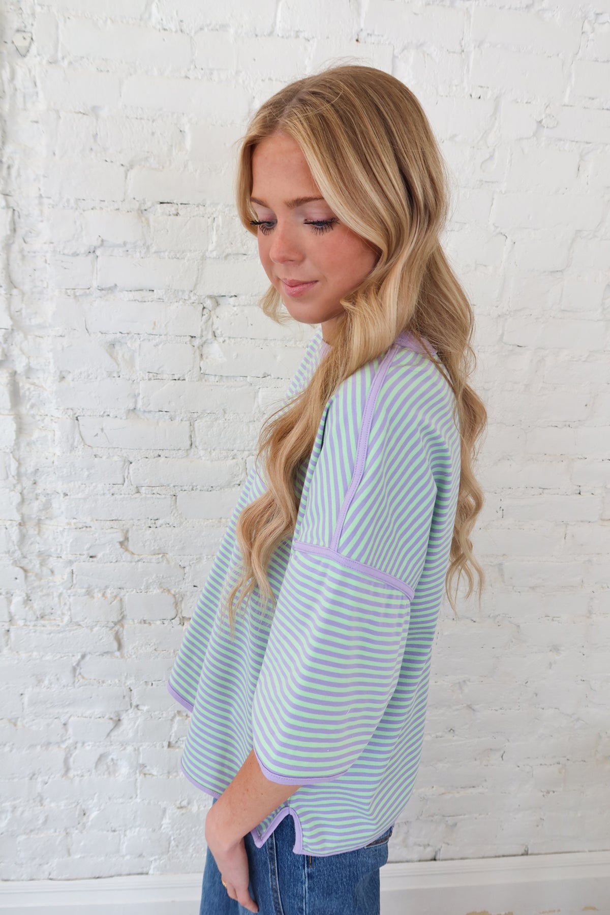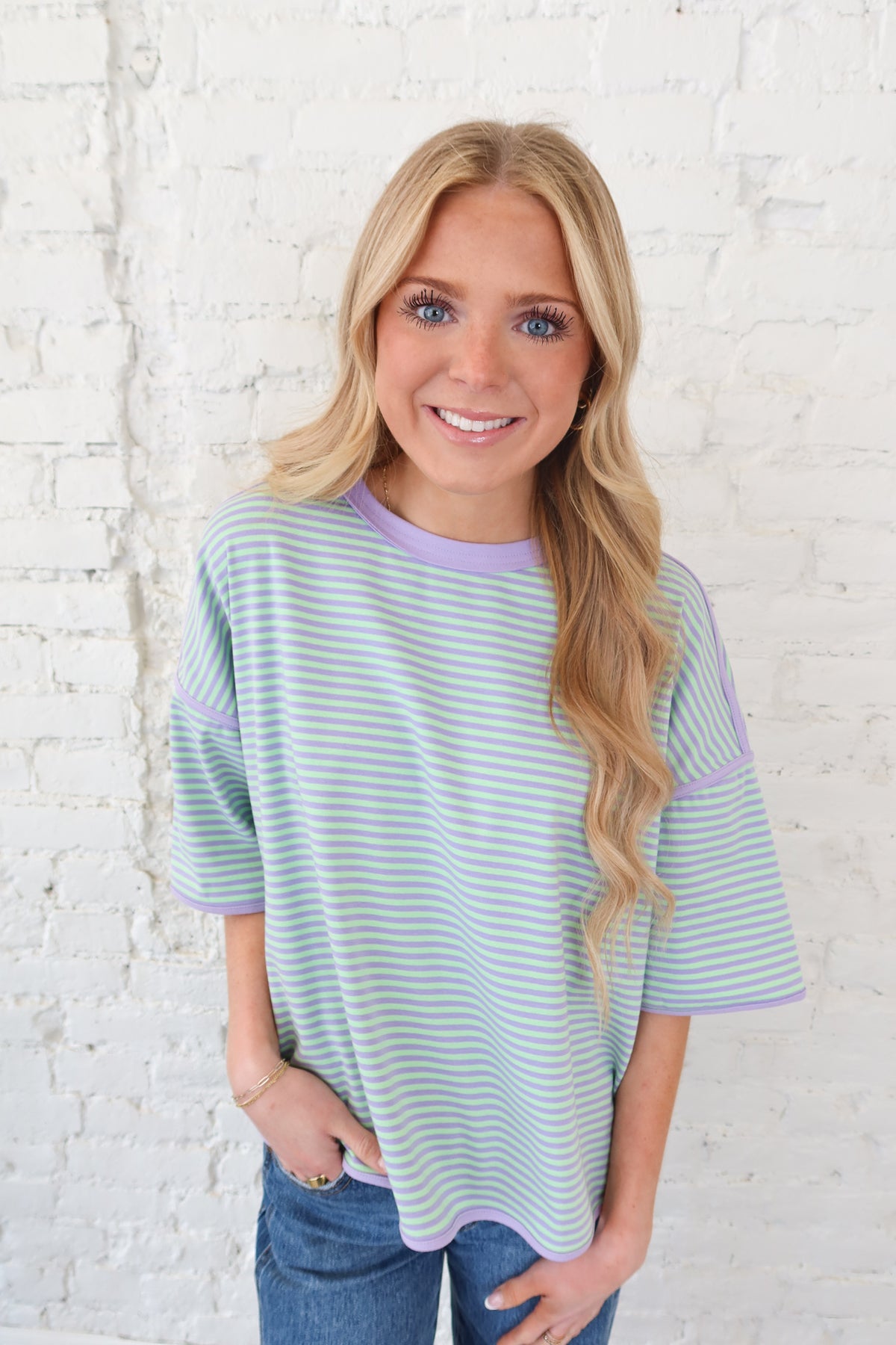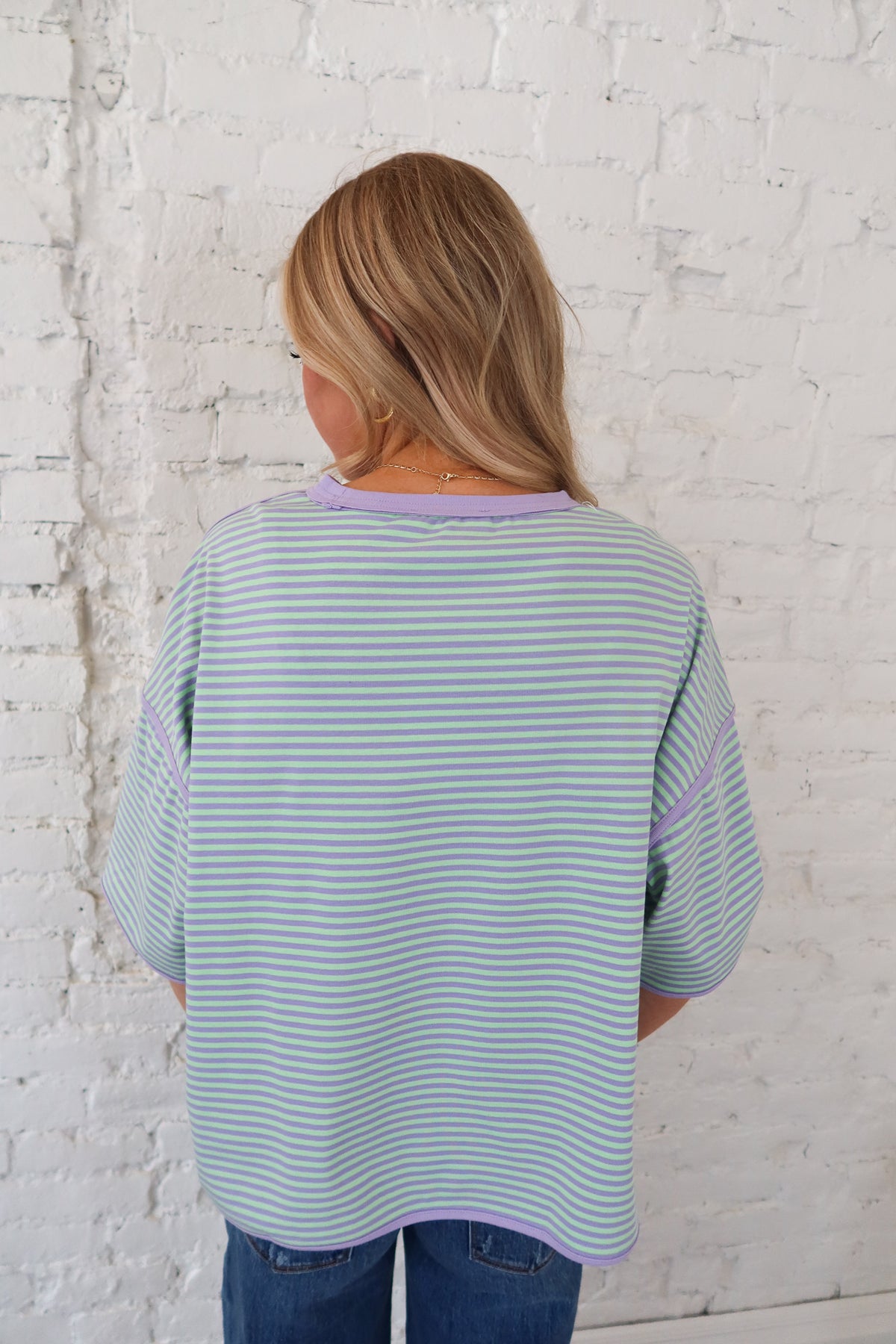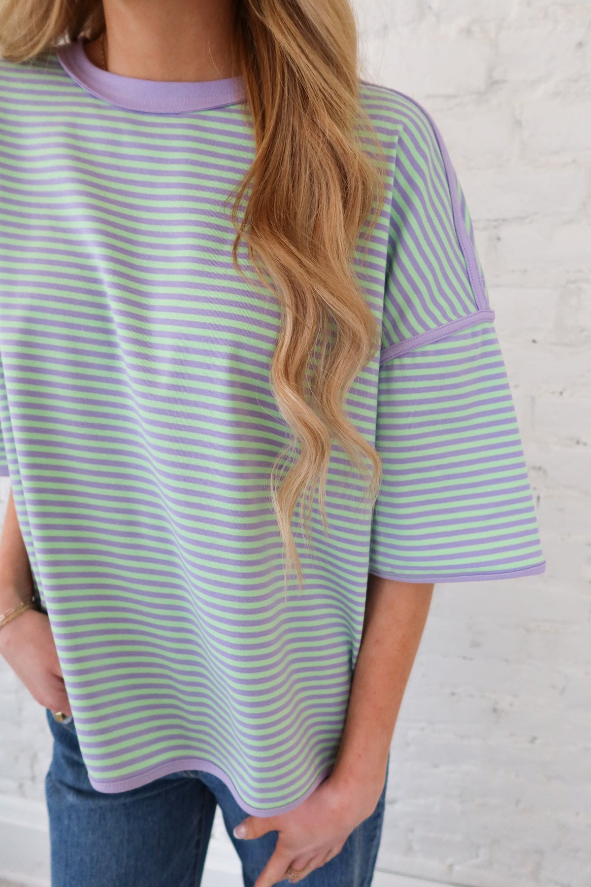 Step into spring with this bright, fun striped oversized tee. Mint and lilac colors bring playful energy to this oversized top. Crafted from structured fabric with reinforced thick seams, it delivers durability without sacrificing comfort. The relaxed fit works perfectly for layering or wearing solo, making it a versatile staple that transitions effortlessly from casual weekends to laid-back weekdays.