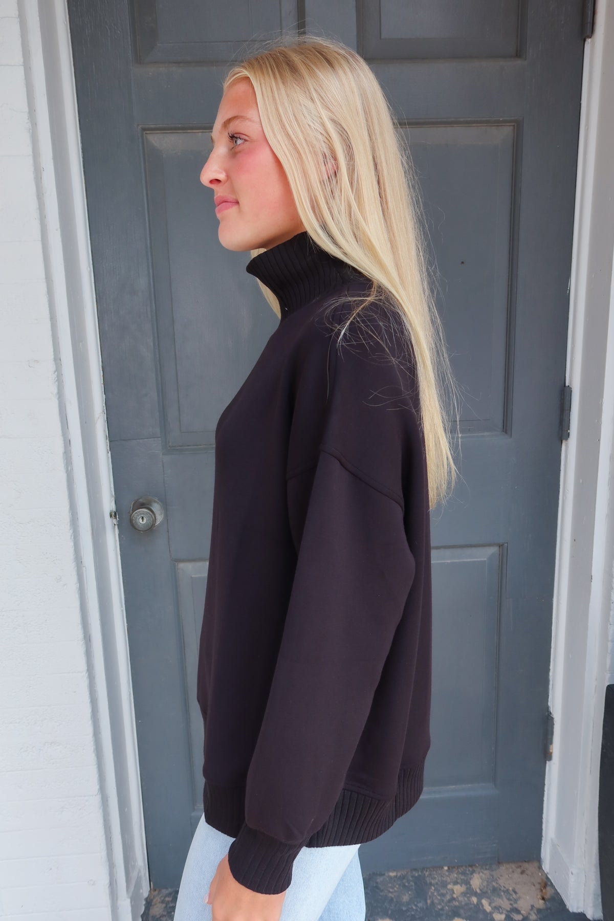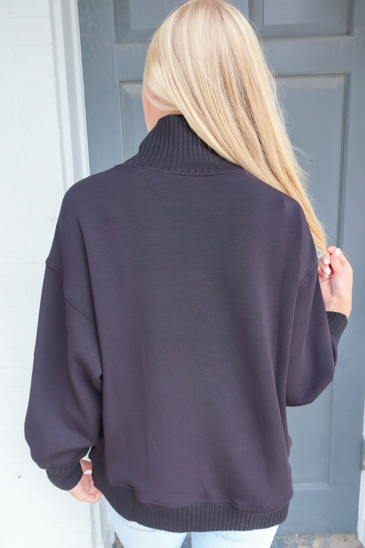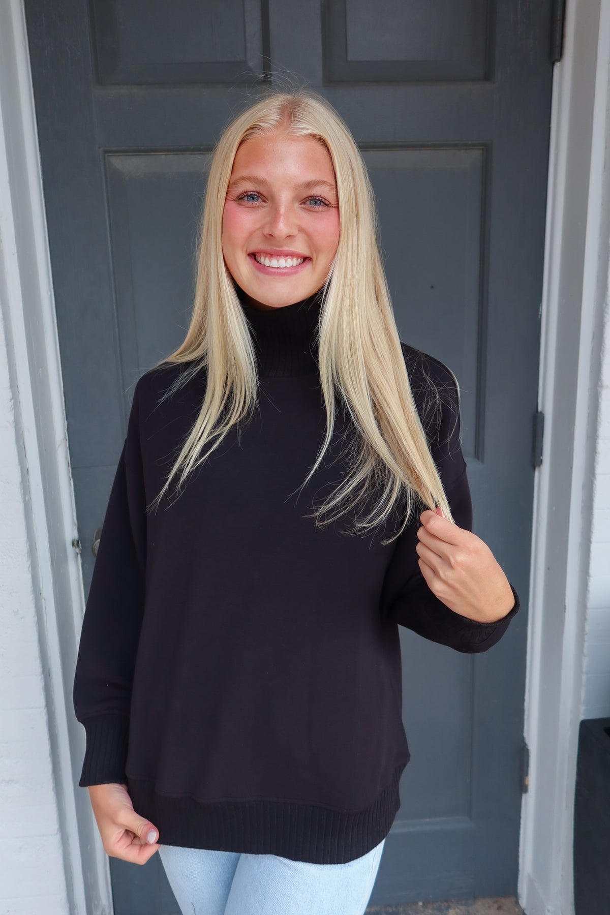 Stay cozy and stylish with the Cafe Corner Black Modal Rib Mock Neck Pullover Top. This thick, long-sleeve turtleneck features a soft modal rib fabric that feels gentle against your skin while adding warmth. Its sleek black color and flattering mock neck design make it a cute and versatile piece, perfect for layering or wearing alone on chilly days. Elevate your wardrobe with a comfortable top that combines snug comfort with understated elegance.