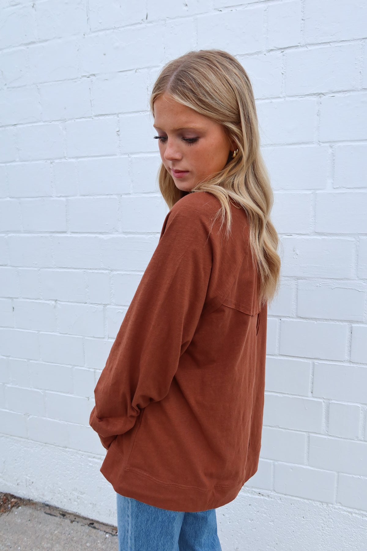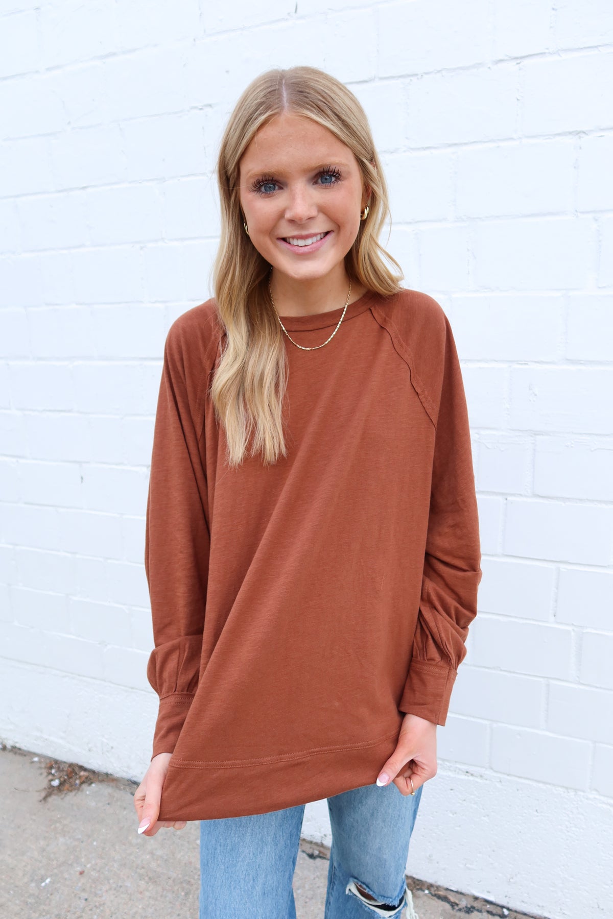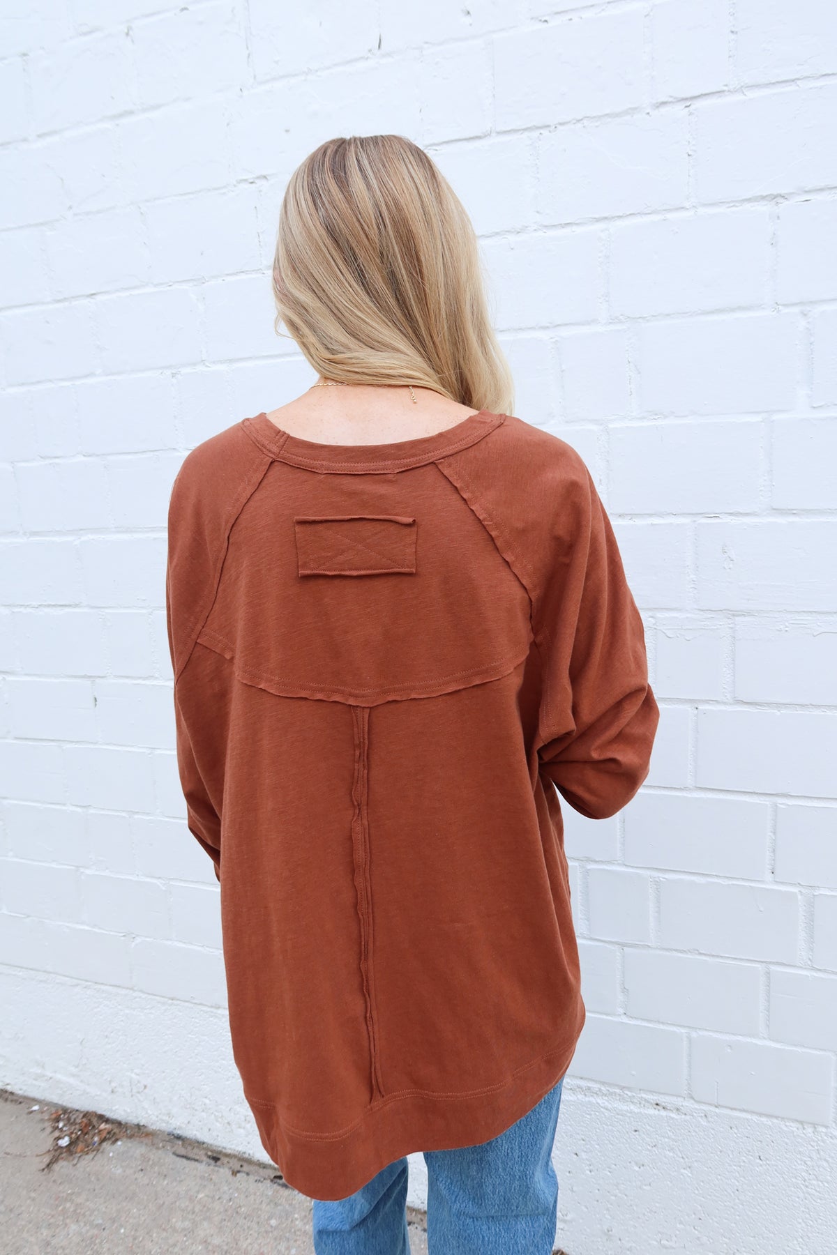 Experience effortless style with the Chestnut Cotton Oversize Long Sleeve Top. Designed with a relaxed, oversized fit and distinctive exposed seam details, this top offers both comfort and a modern edge. Perfect for layering or wearing on its own, it brings a casual yet refined look to your wardrobe.