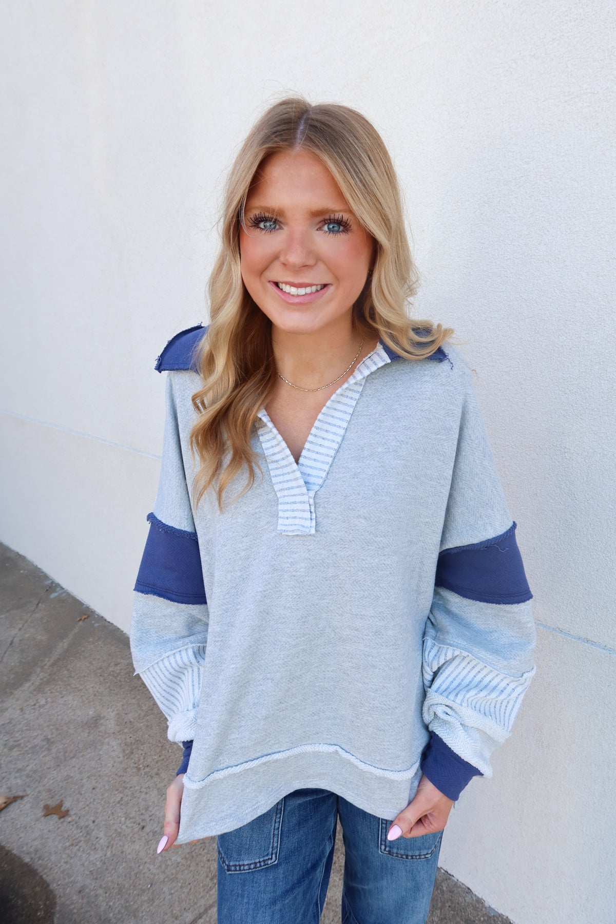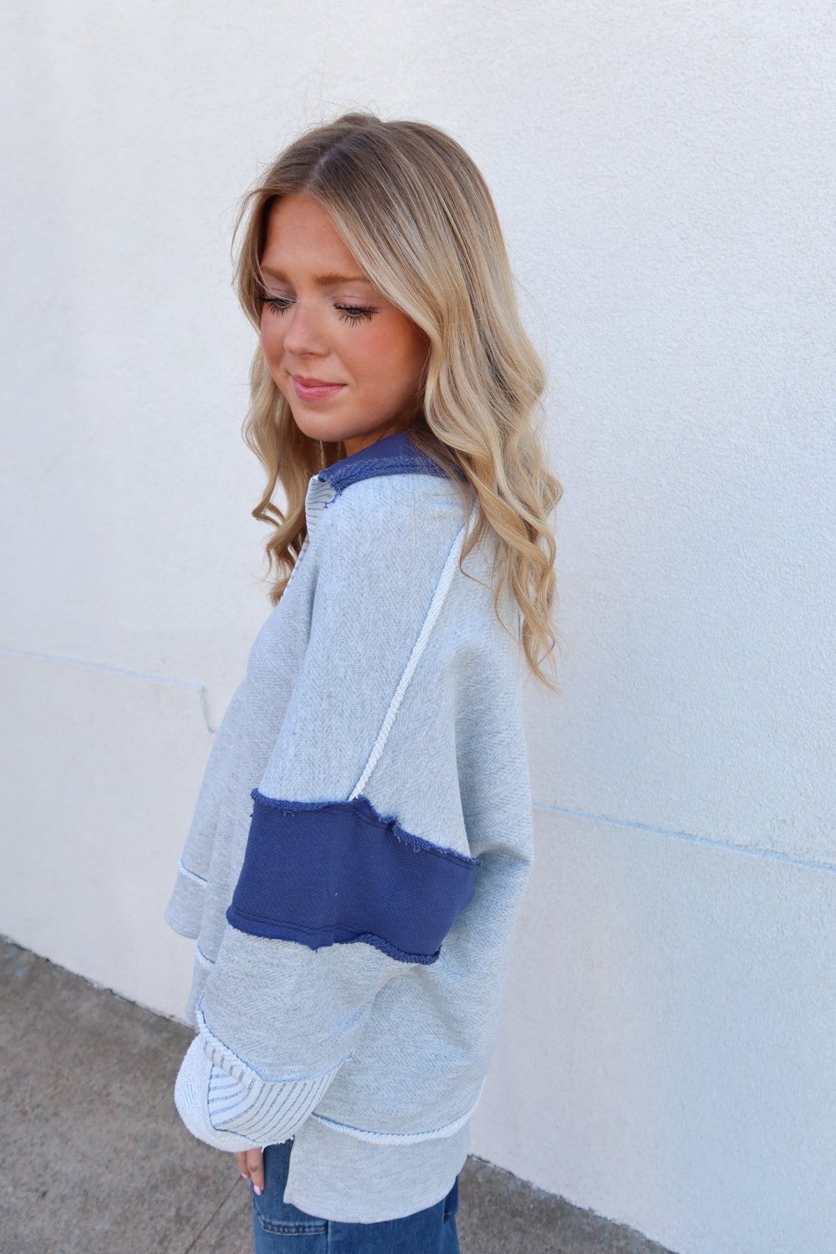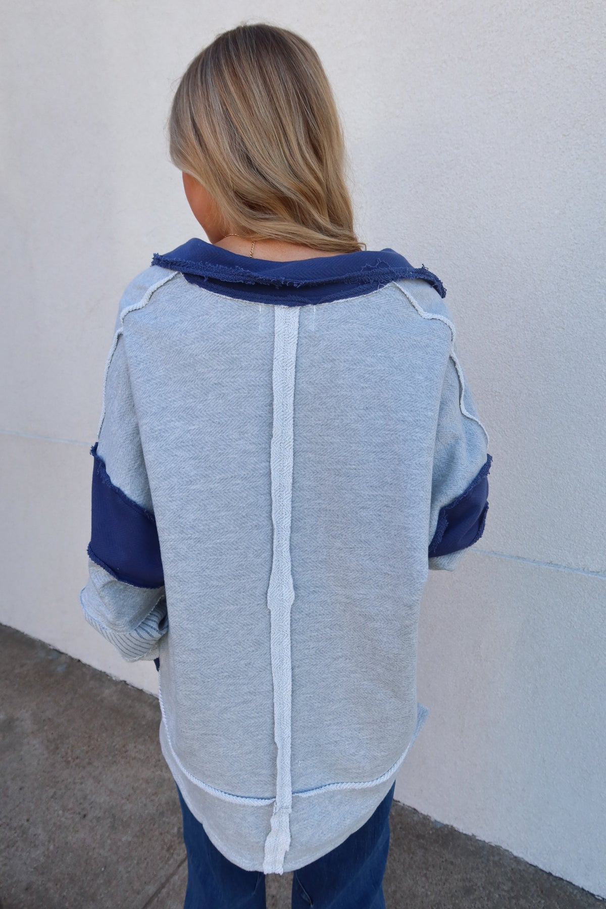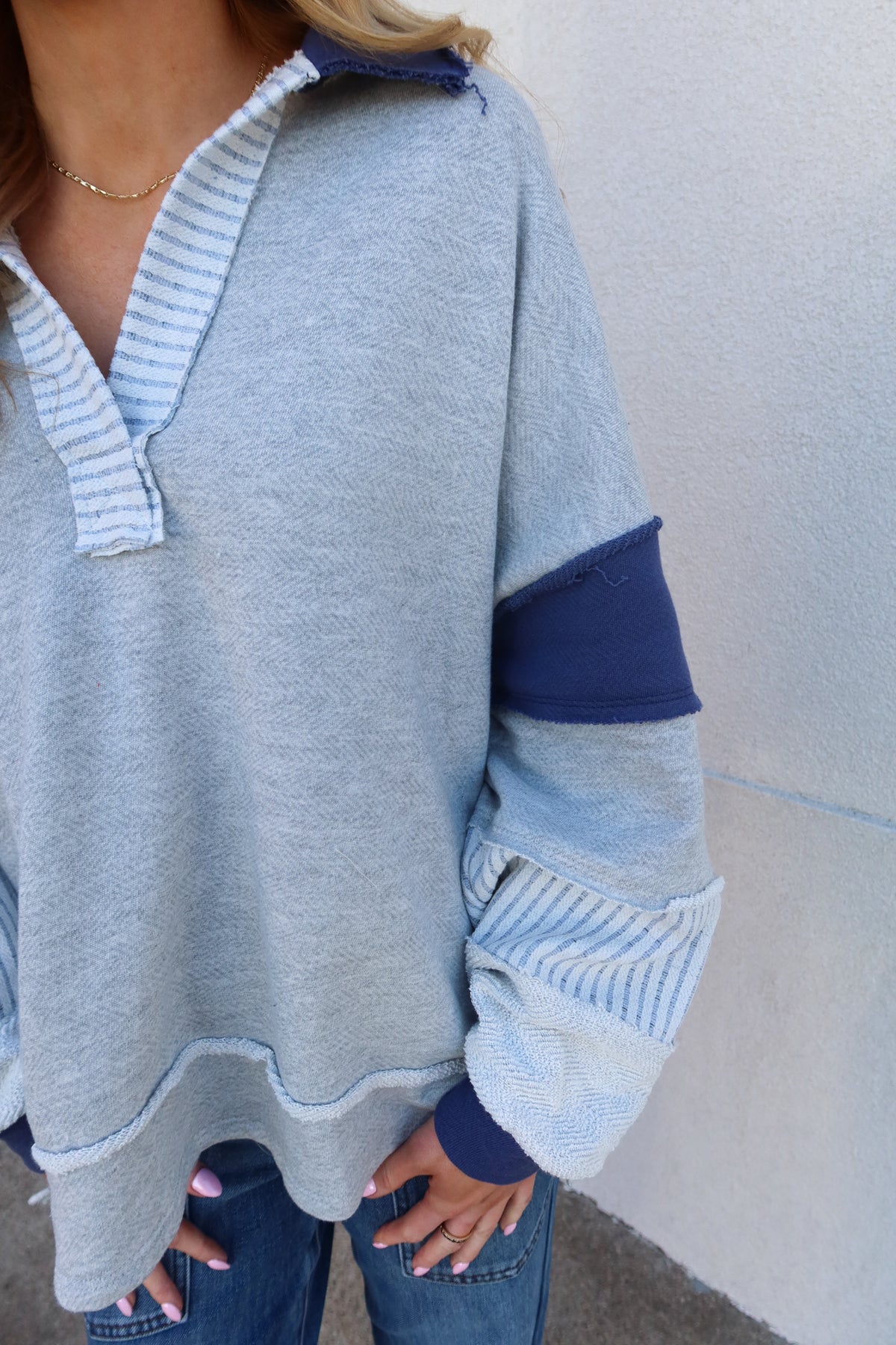 Elevate your casual wardrobe with this charming collared sweatshirt that effortlessly blends comfort and contemporary style. Crafted from soft French terry knit, it features a sophisticated grey and navy colorway paired with an eye-catching patchwork detail on the sleeve that adds instant visual interest. The structured collar gives it a polished edge perfect for layering or wearing solo, while the relaxed fit keeps you cozy all day long. Whether you're heading to brunch or running errands, this versatile piece strikes the perfect balance between cute and trendy—a modern essential that works harder than it looks.
