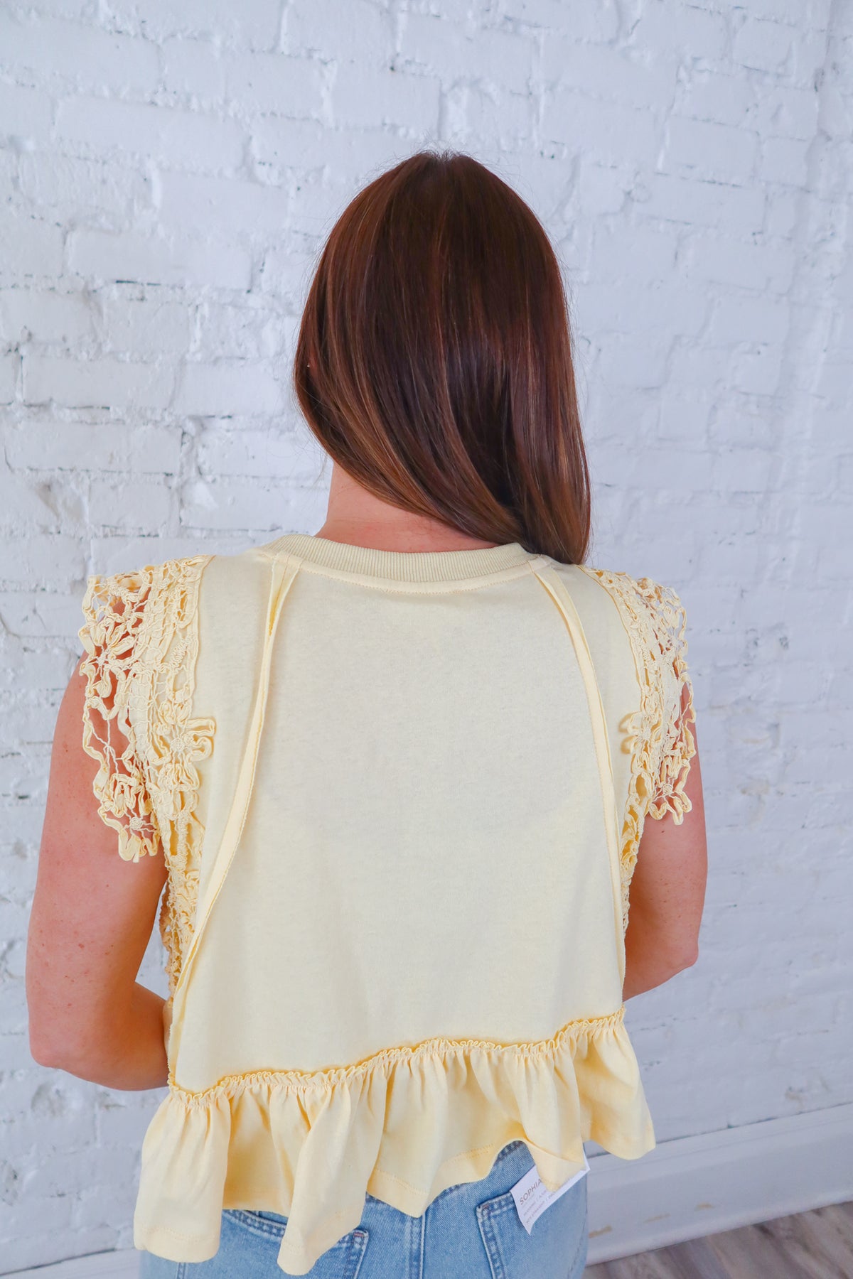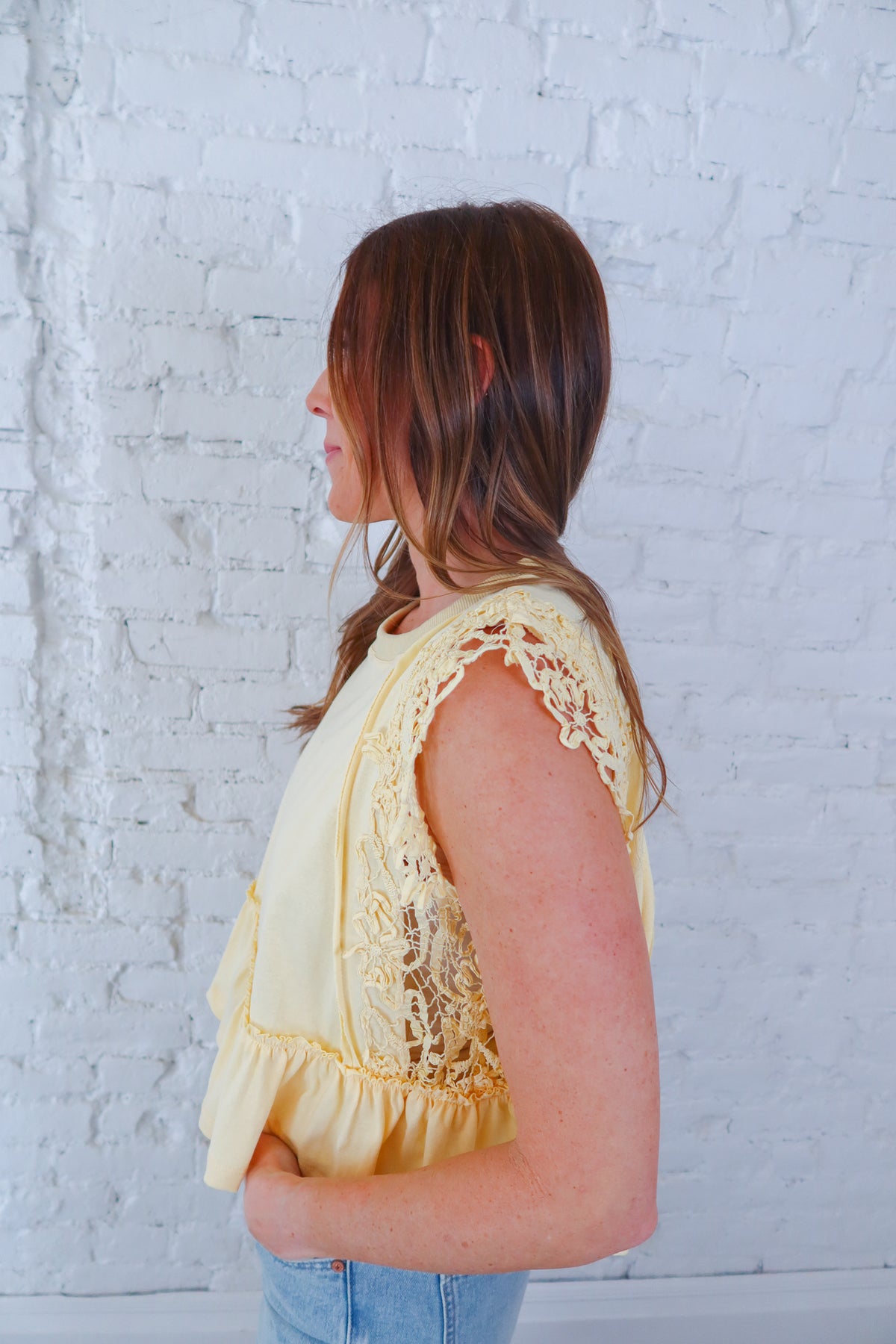 Brighten your wardrobe with this stunning yellow lace crochet top that combines effortless style with intricate craftsmanship. Delicate crochet detailing adorns the sides and sleeves, creating a romantic, textured look that catches the light beautifully. Exposed seam details add an edgy, modern twist that elevates the piece from classic to contemporary. Perfect for layering or wearing solo, this versatile top transitions seamlessly from casual days to evening outings.