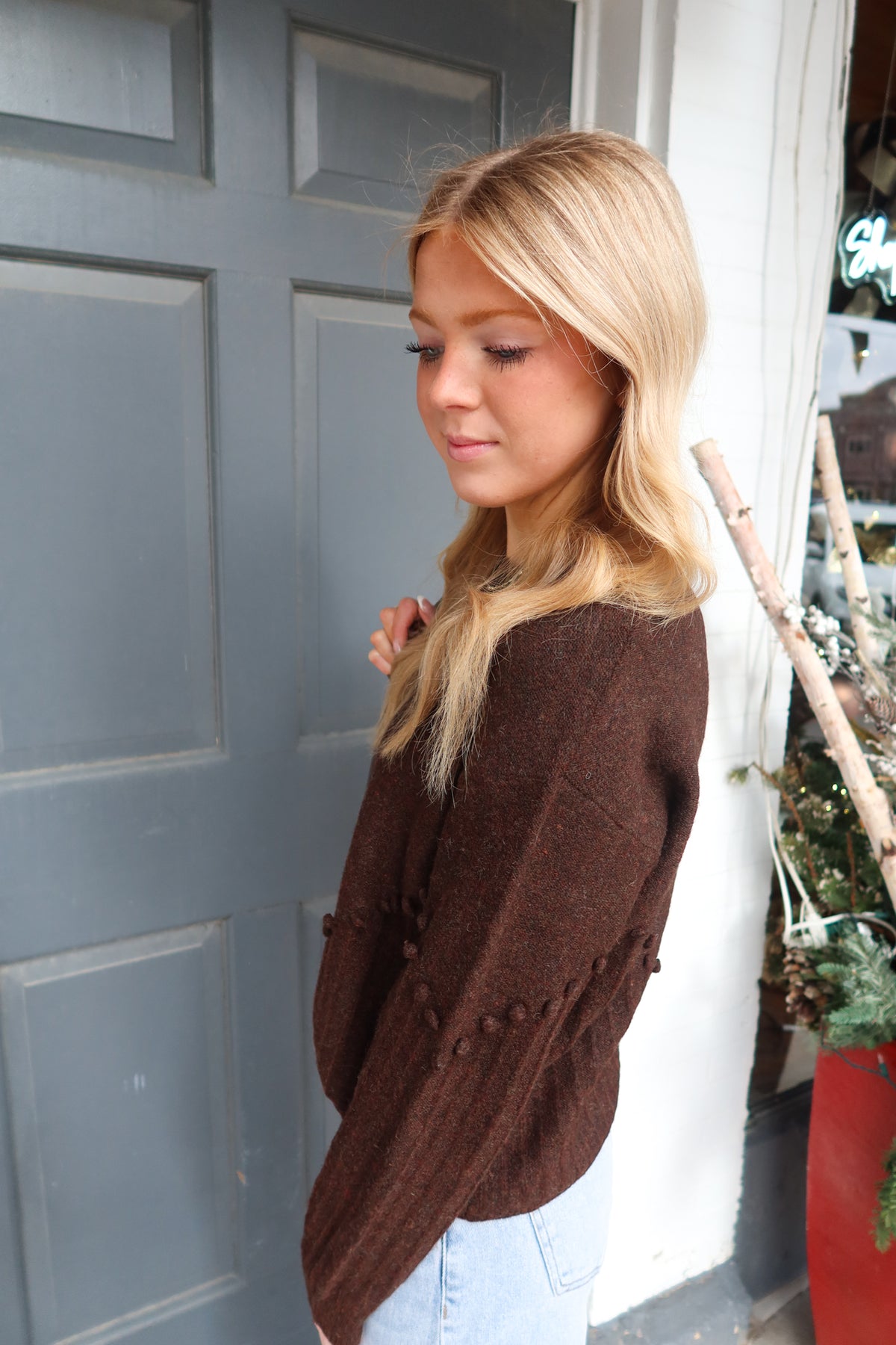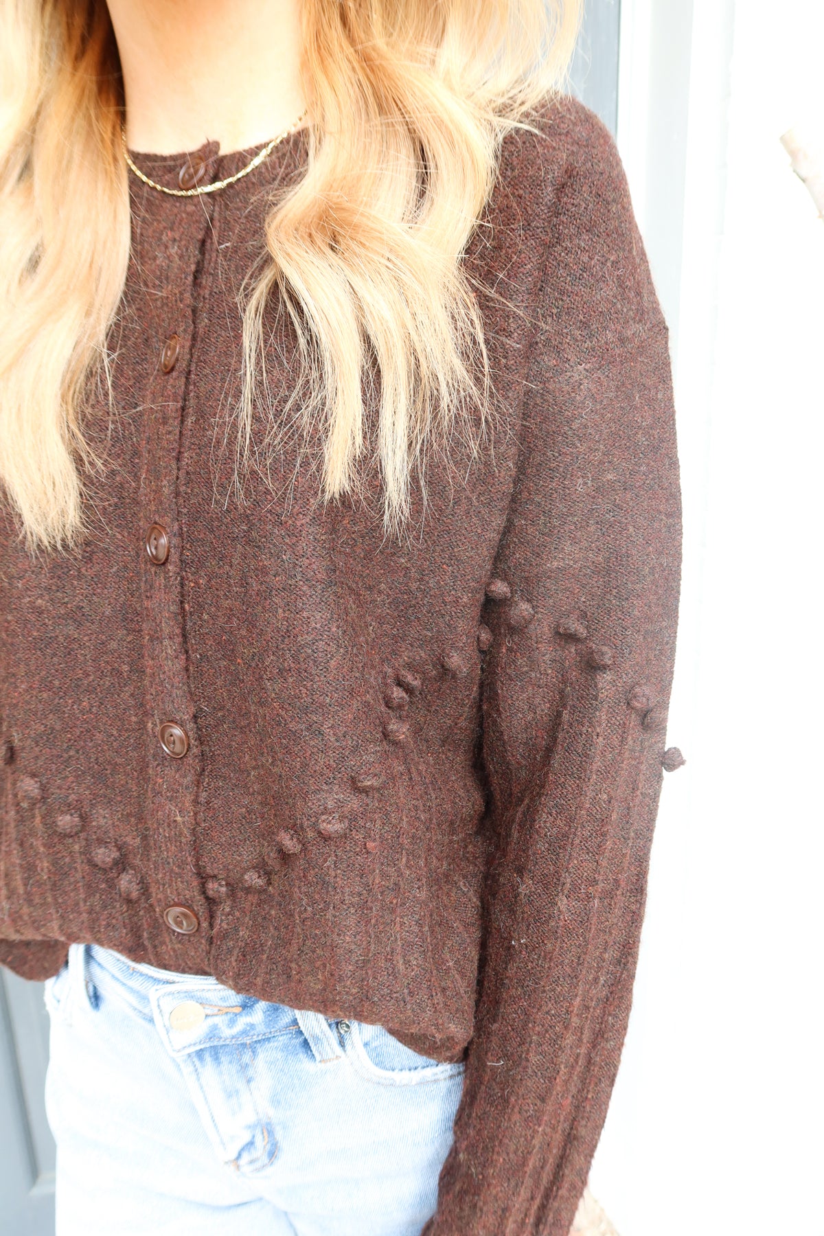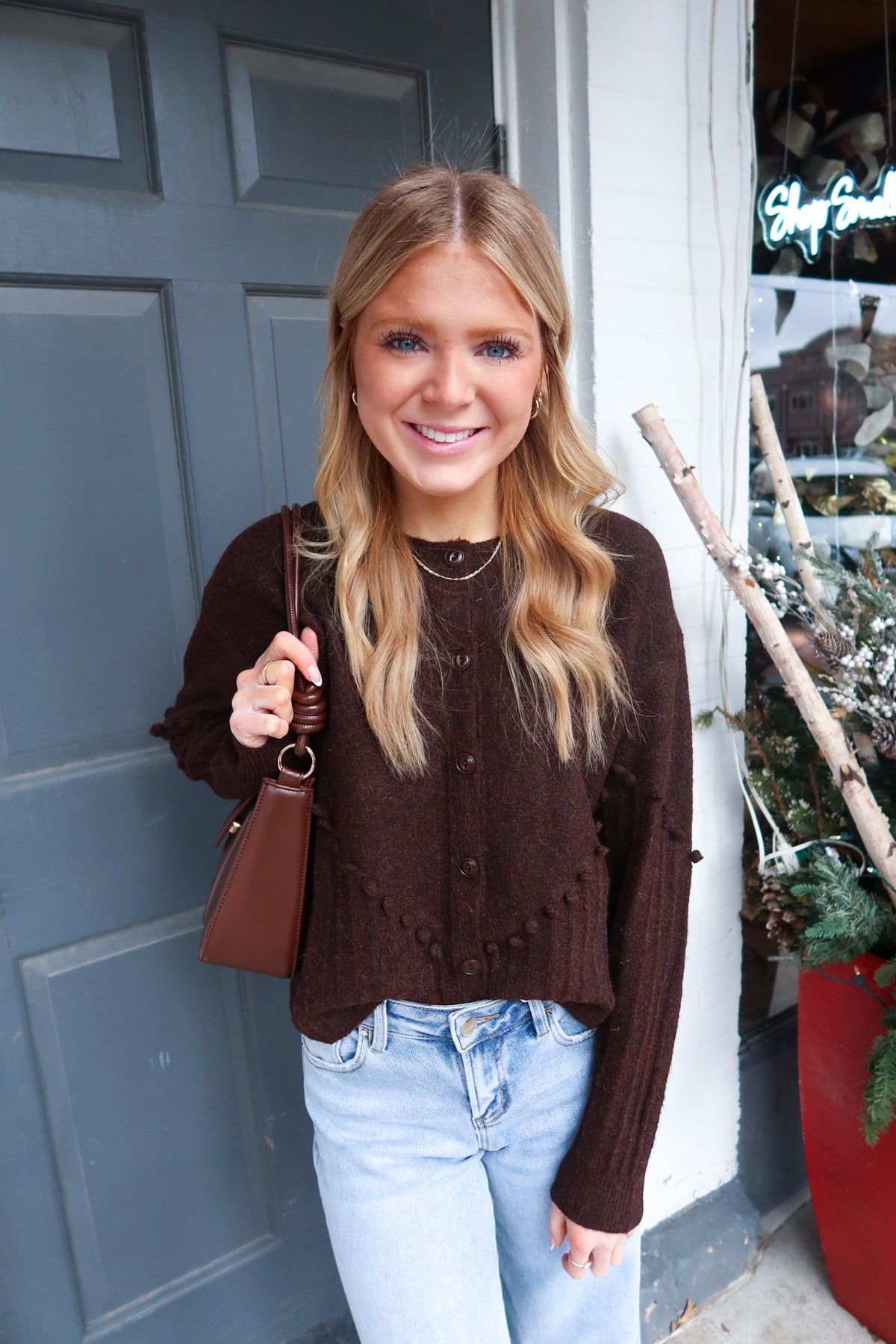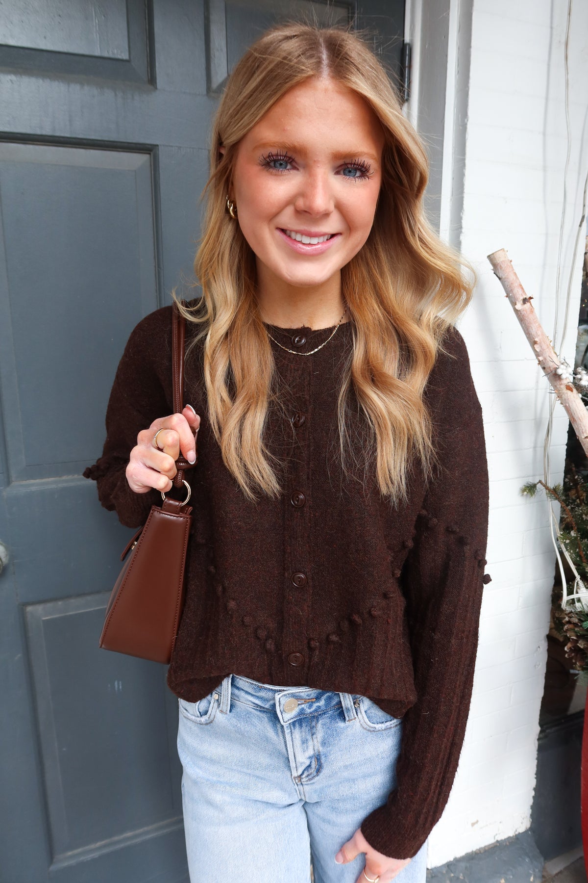 Cozy meets playful in this charming chocolate sweater, featuring eye-catching pom pom details that add personality to your everyday look. The convenient front button closure makes layering effortless, while the soft knit fabric keeps you comfortable all season long. Perfect for casual outings or relaxed weekends, this piece brings a touch of whimsy to your wardrobe without sacrificing warmth or style.