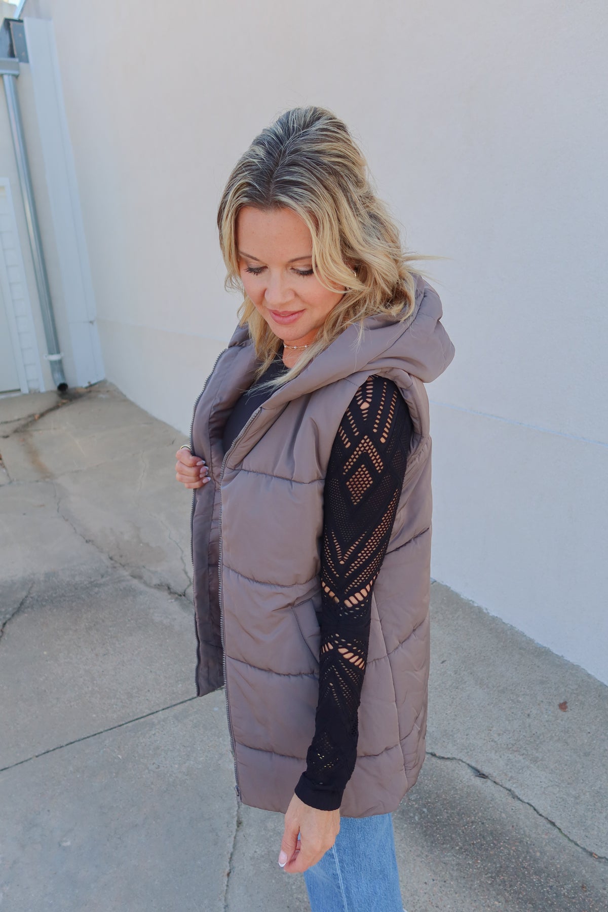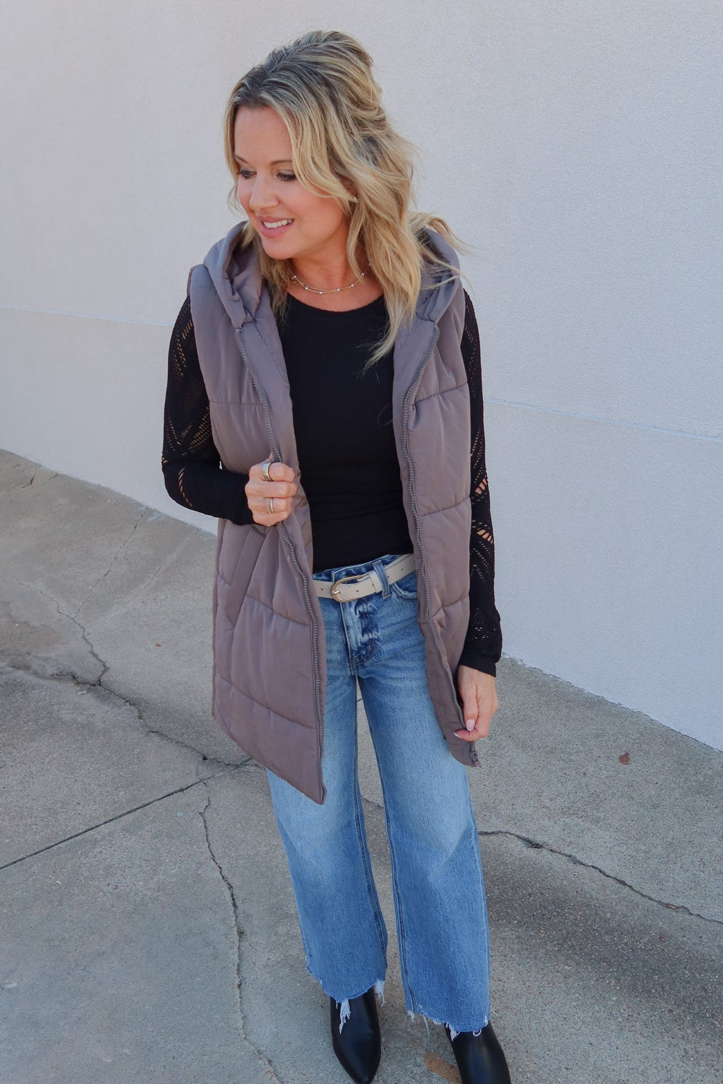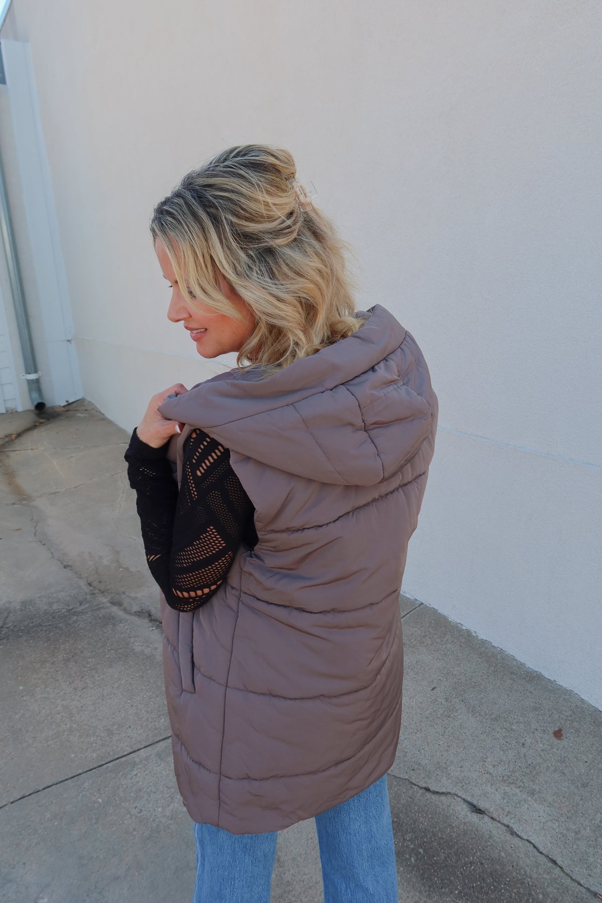 Stay warm and stylish with the Good Call Hooded Puffer Vest. Its front zip closure ensures easy wear and a secure fit, while handy pockets offer convenient storage for essentials. The hood provides extra protection against chilly winds, making this vest a versatile and practical addition to your outerwear collection. Ideal for layering on unpredictable days, it combines comfort and function effortlessly.