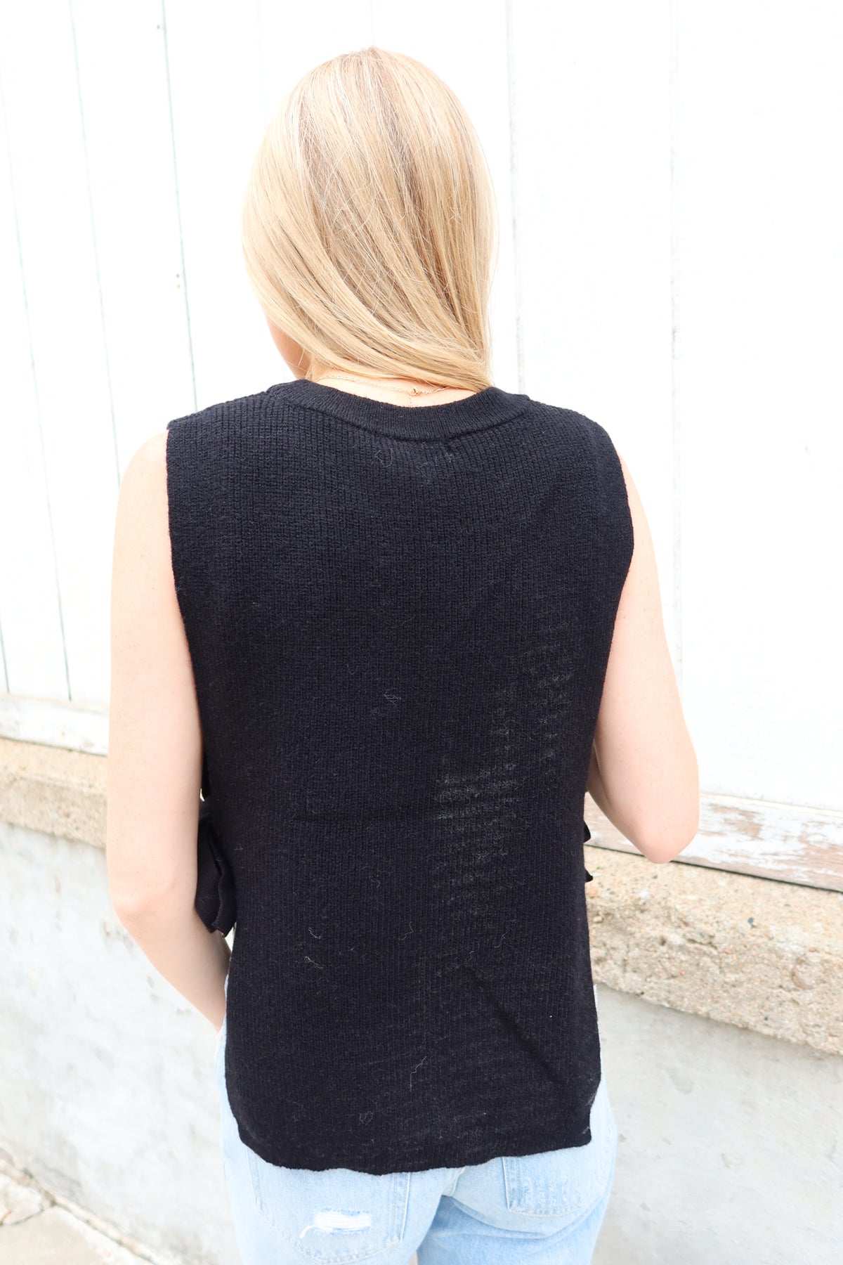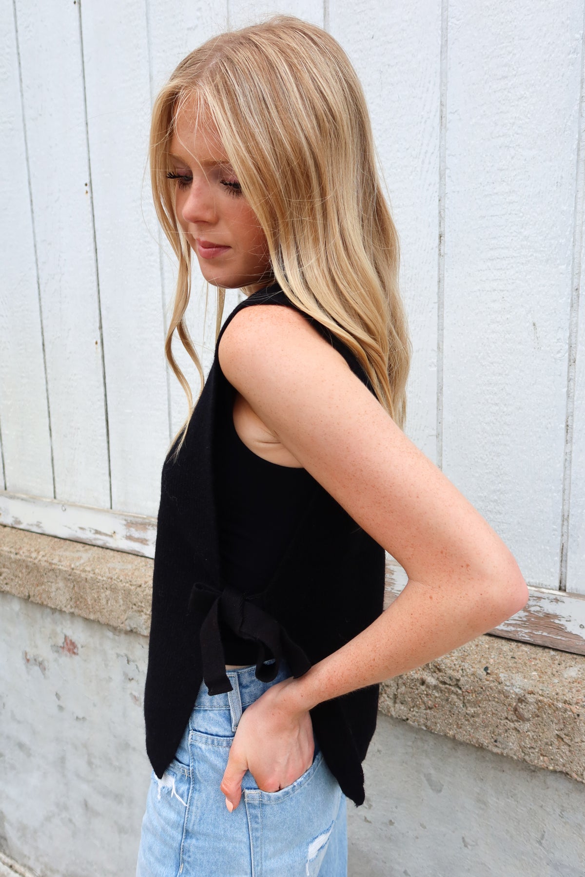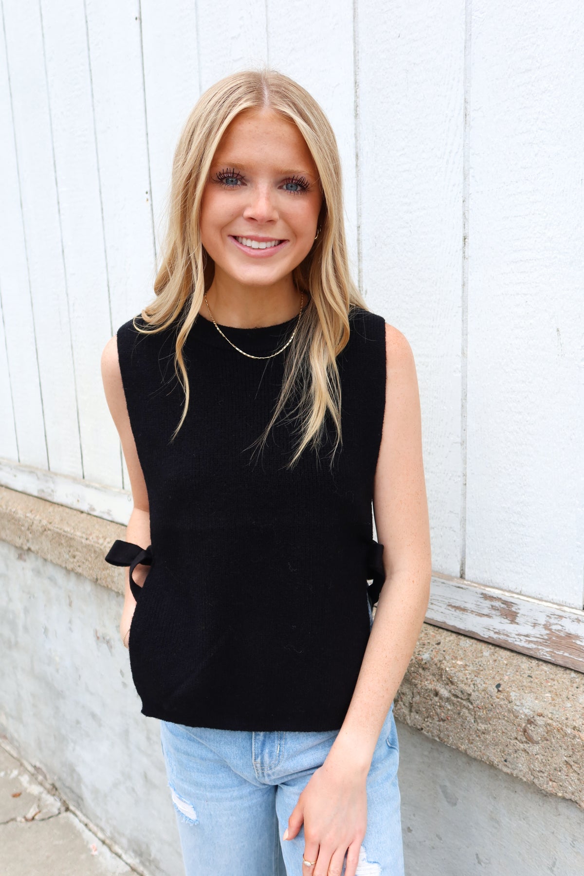 Elevate your look with the Side Charm Black Side Tie Sweater Vest, designed to combine cozy comfort and modern style. The sleek black knit features adjustable side ties that add a flattering, customizable fit, perfect for layering over shirts or dresses. This versatile vest effortlessly boosts your wardrobe with a chic edge, making it an essential piece for both casual and polished outfits. Embrace style and comfort in one statement piece.