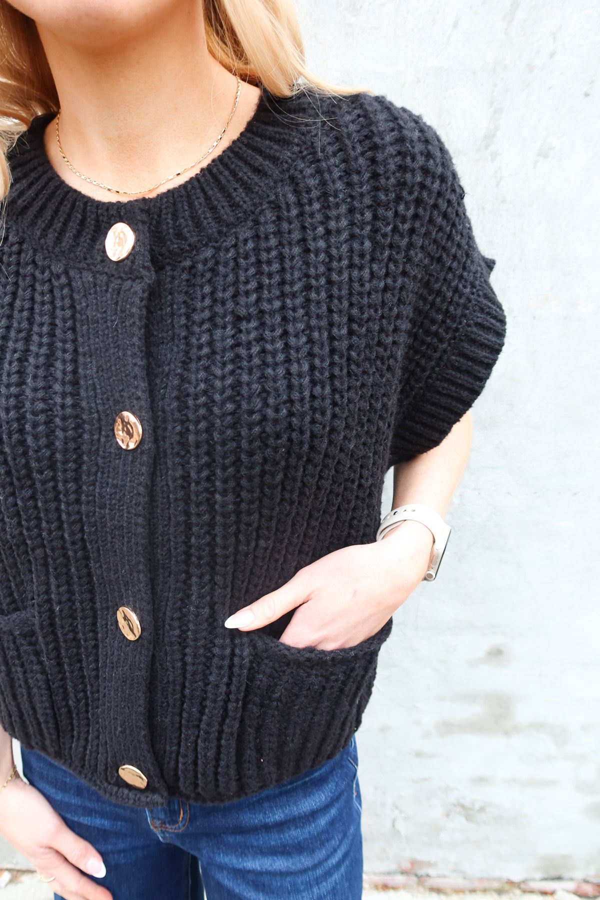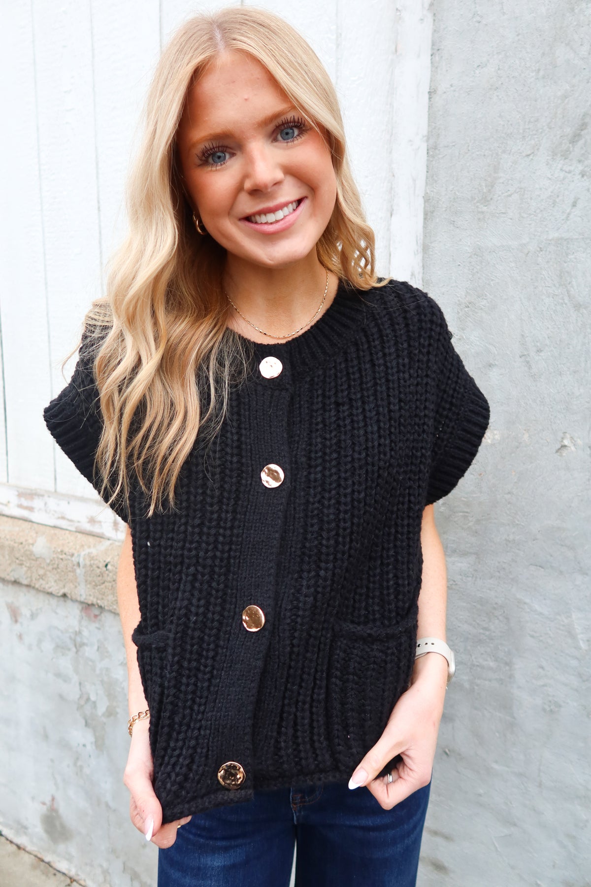 Elevate your layering game with this striking black knit sweater vest, designed for effortless sophistication. The oversized silhouette pairs beautifully with any outfit, while bold gold buttons add a touch of luxury and visual interest. Crafted from quality knit fabric, it offers comfort without compromise—perfect for creating polished, versatile looks that transition seamlessly from office to weekend. A timeless piece that works as hard as you do.