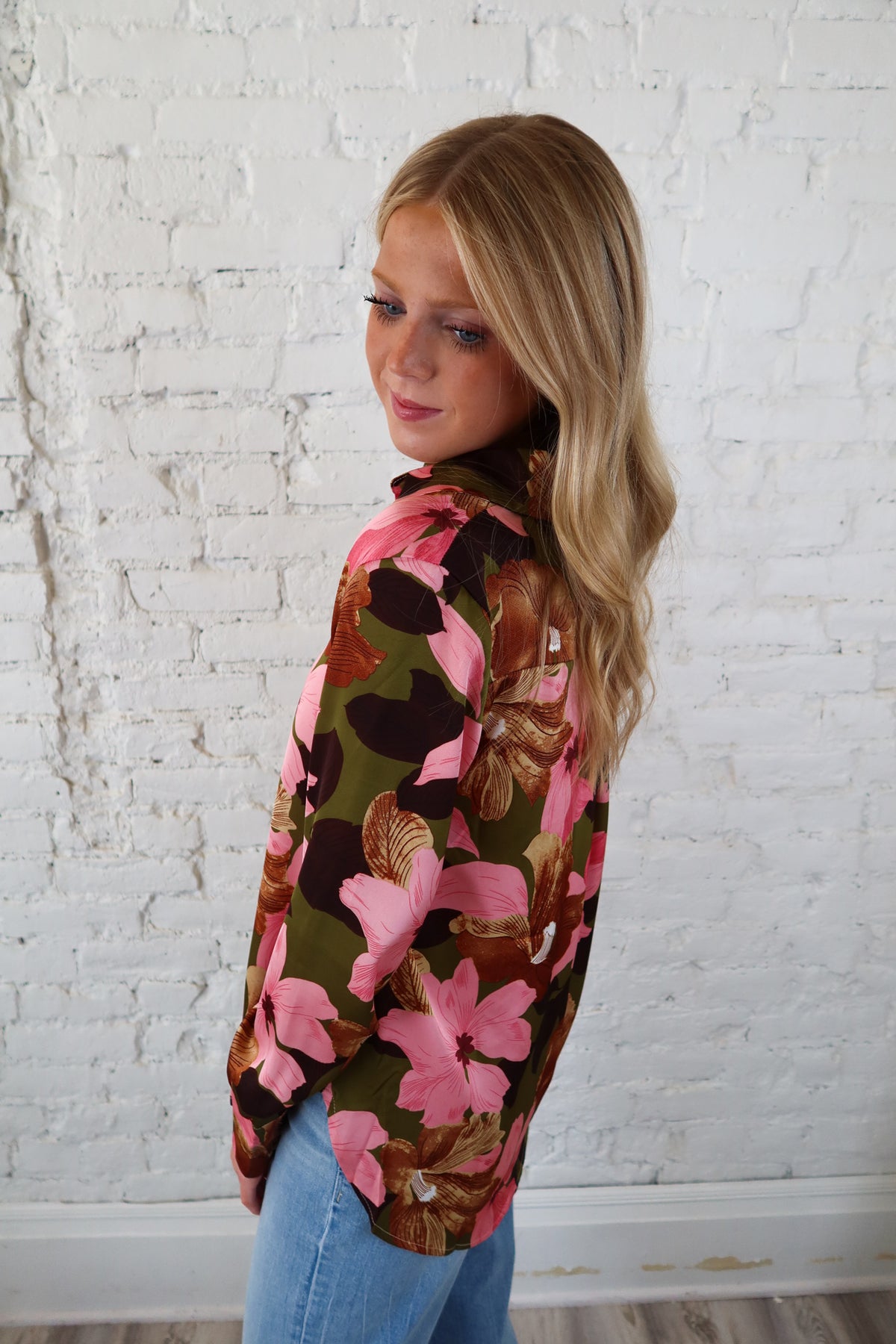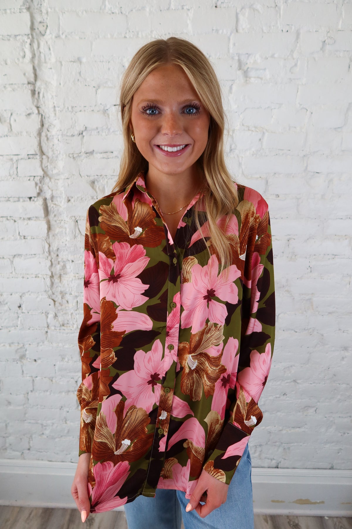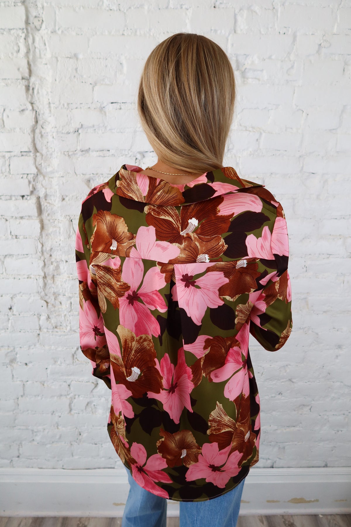 Elevate your style with the Satin Garden Button Down Floral Blouse. Crafted from smooth satin, this blouse offers a luxurious feel and gentle sheen that catches the light beautifully. The delicate floral pattern adds a fresh, feminine touch, while the button-down design provides effortless elegance and versatility. Perfect for both workdays and weekend outings, this blouse pairs seamlessly with jeans or tailored pants, making it a standout addition to any wardrobe. Experience comfort and sophistication in one graceful piece.