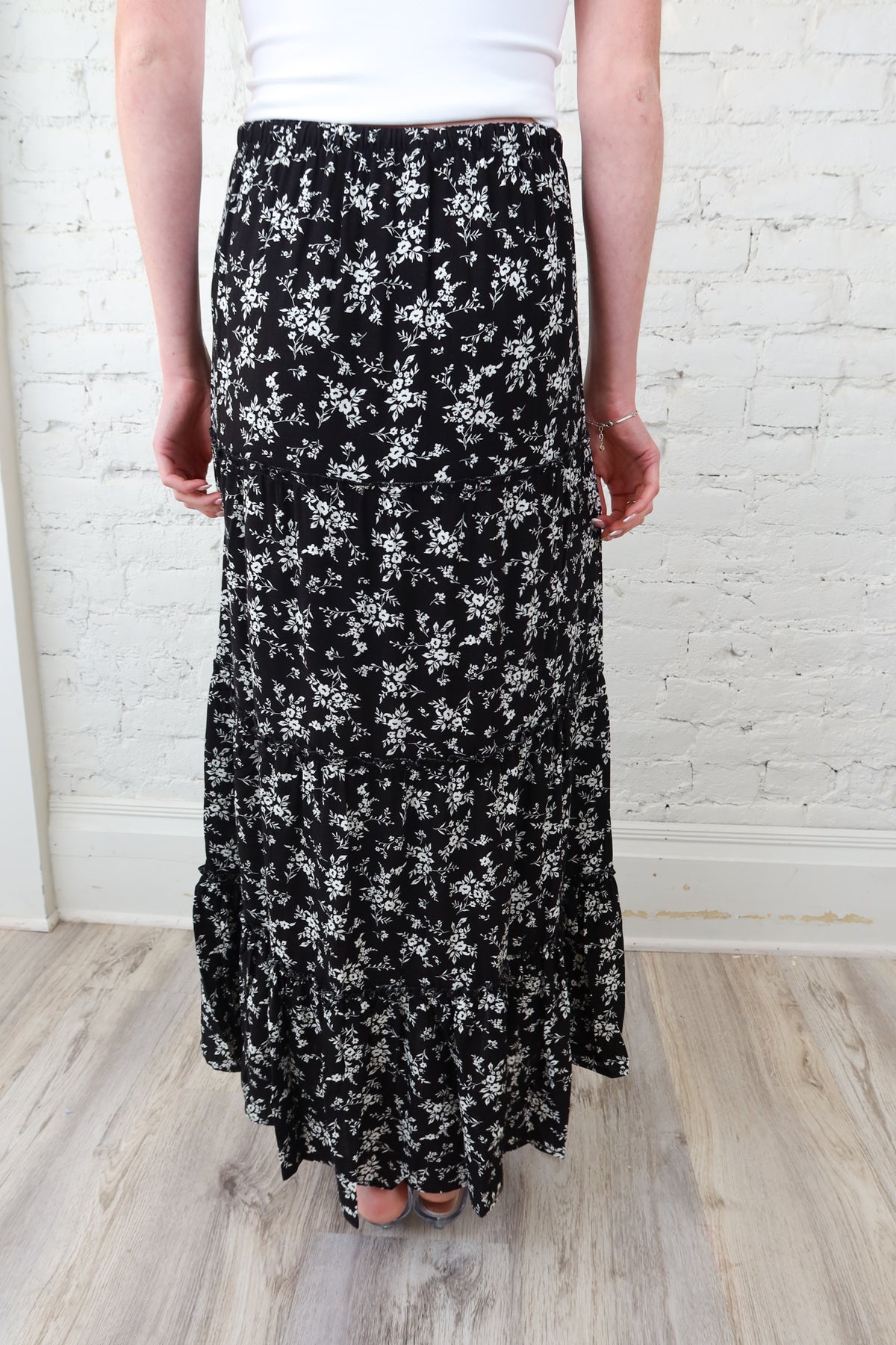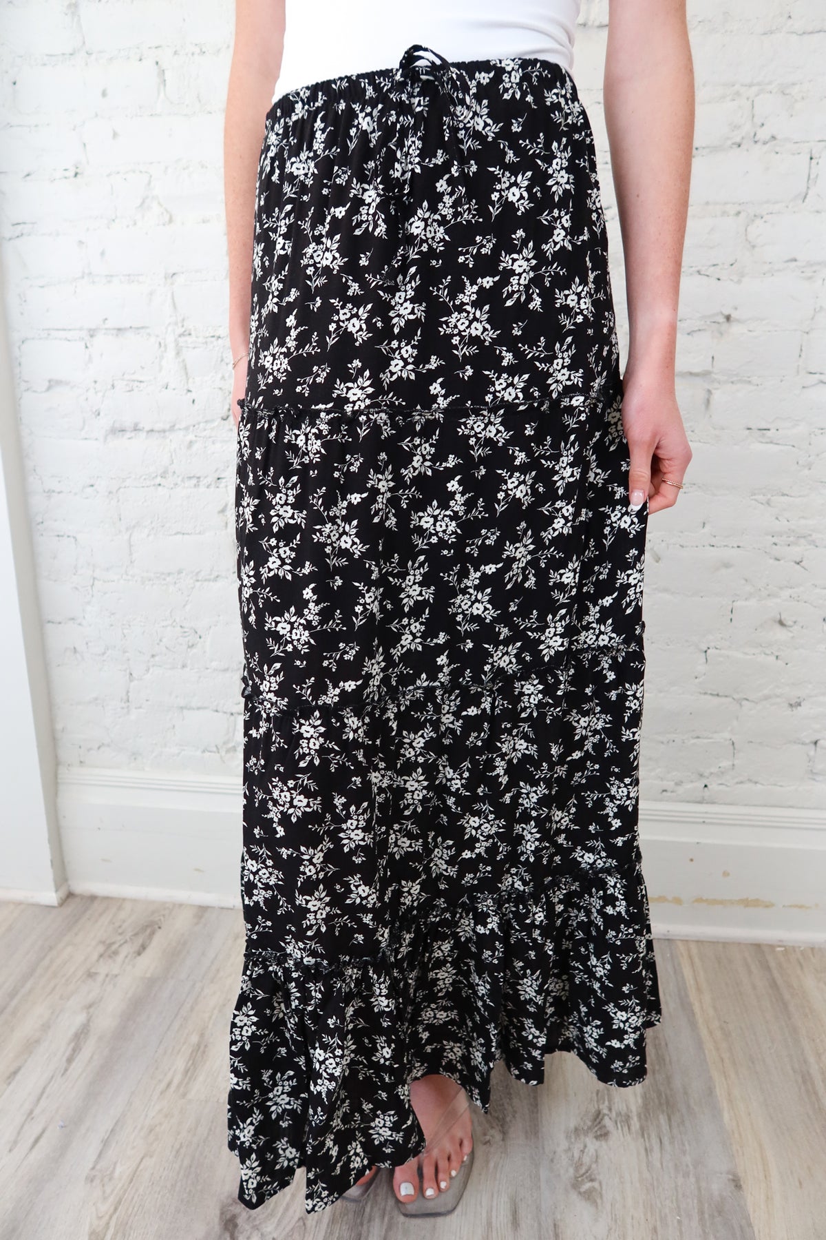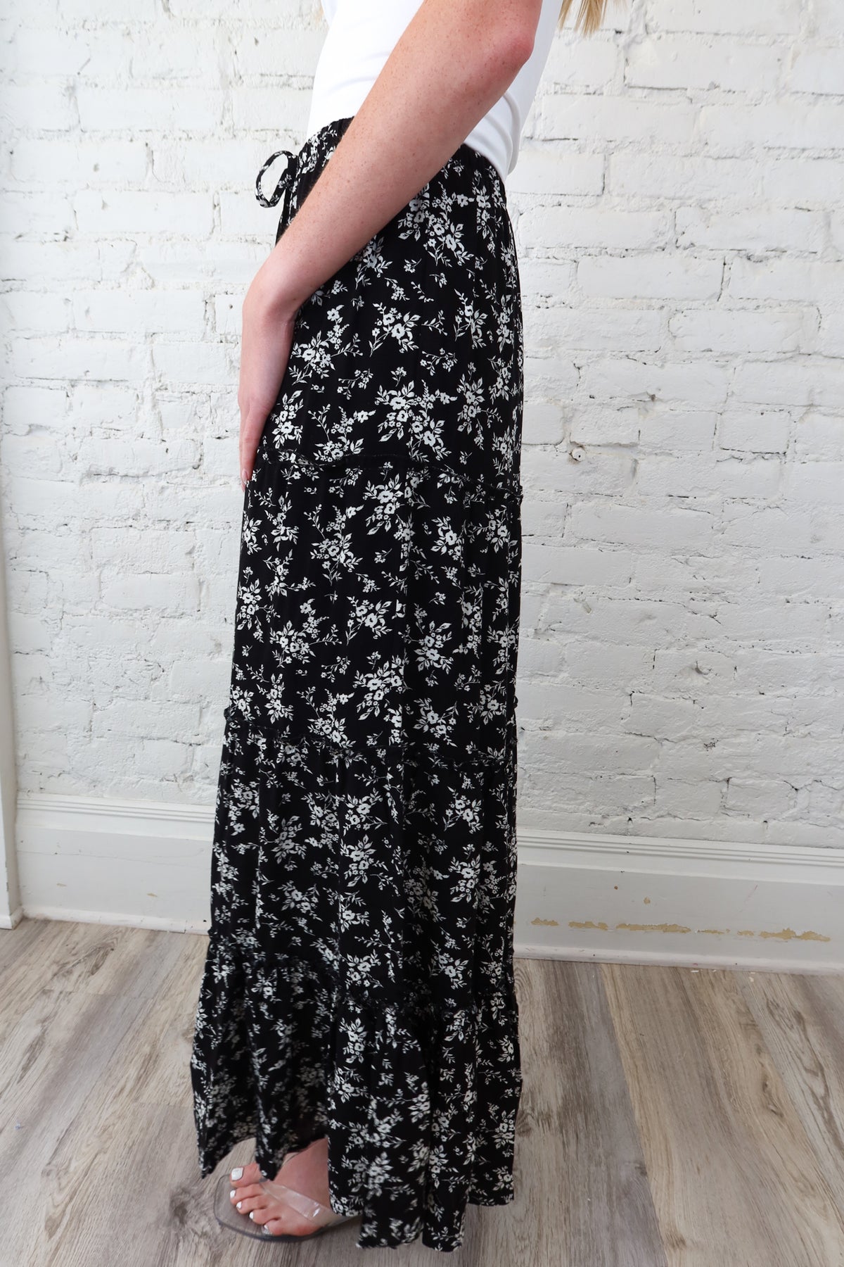 Elevate your evening look with this Night Out Black Maxi Skirt. Featuring delicate white flower detailing and a stylish tiered design, it offers a graceful silhouette that moves beautifully. Perfect for making a lasting impression at any event, this skirt combines elegance with a touch of playful charm.
