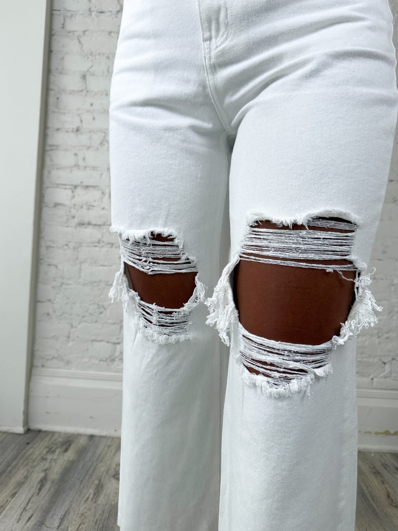 Elevate your wardrobe with these White Distressed Straight Leg Jeans. Featuring a structured fit and high-rise design, they offer both style and comfort. Distressed details add a trendy edge, while the zip and button closure ensure a secure fit. With classic 5-pocket detailing, these jeans combine practicality with modern flair, making them a versatile choice for any occasion.