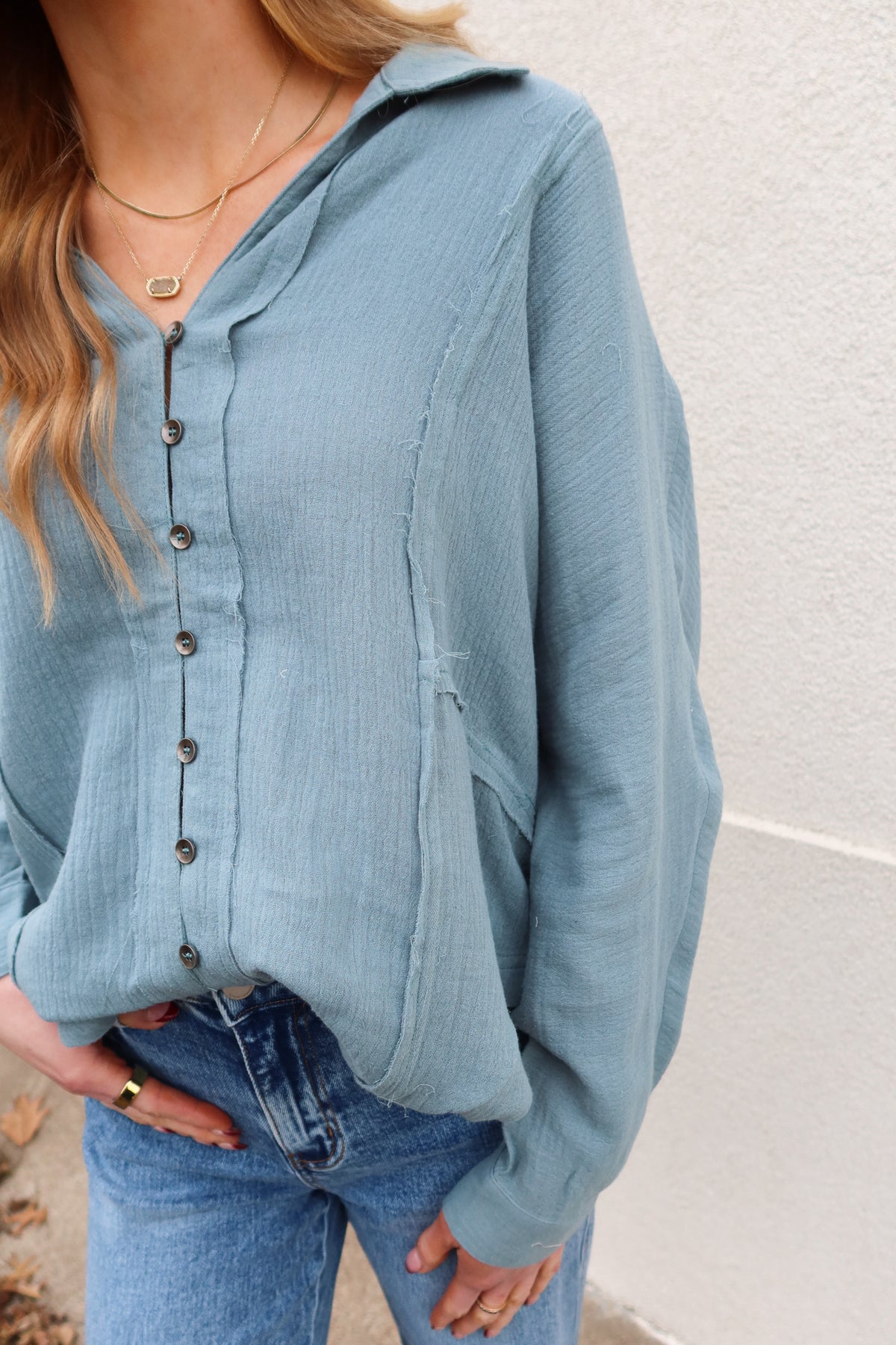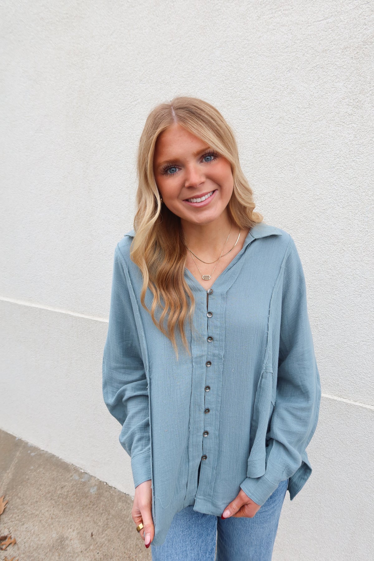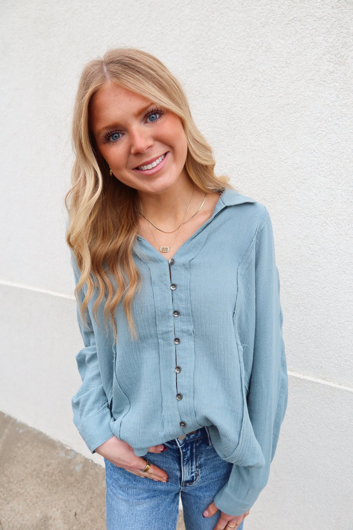 Elevate your everyday wardrobe with this sophisticated blue pintuck long sleeve top. The refined pintuck detailing adds visual interest and dimension, while the classic button front offers effortless styling versatility. Crafted for comfort and polish, this piece transitions seamlessly from office to weekend wear. The timeless blue hue pairs beautifully with neutrals or bold accents, making it a wardrobe essential that works harder than most basics. Perfect for layering or wearing solo, this top delivers understated elegance with lasting appeal.