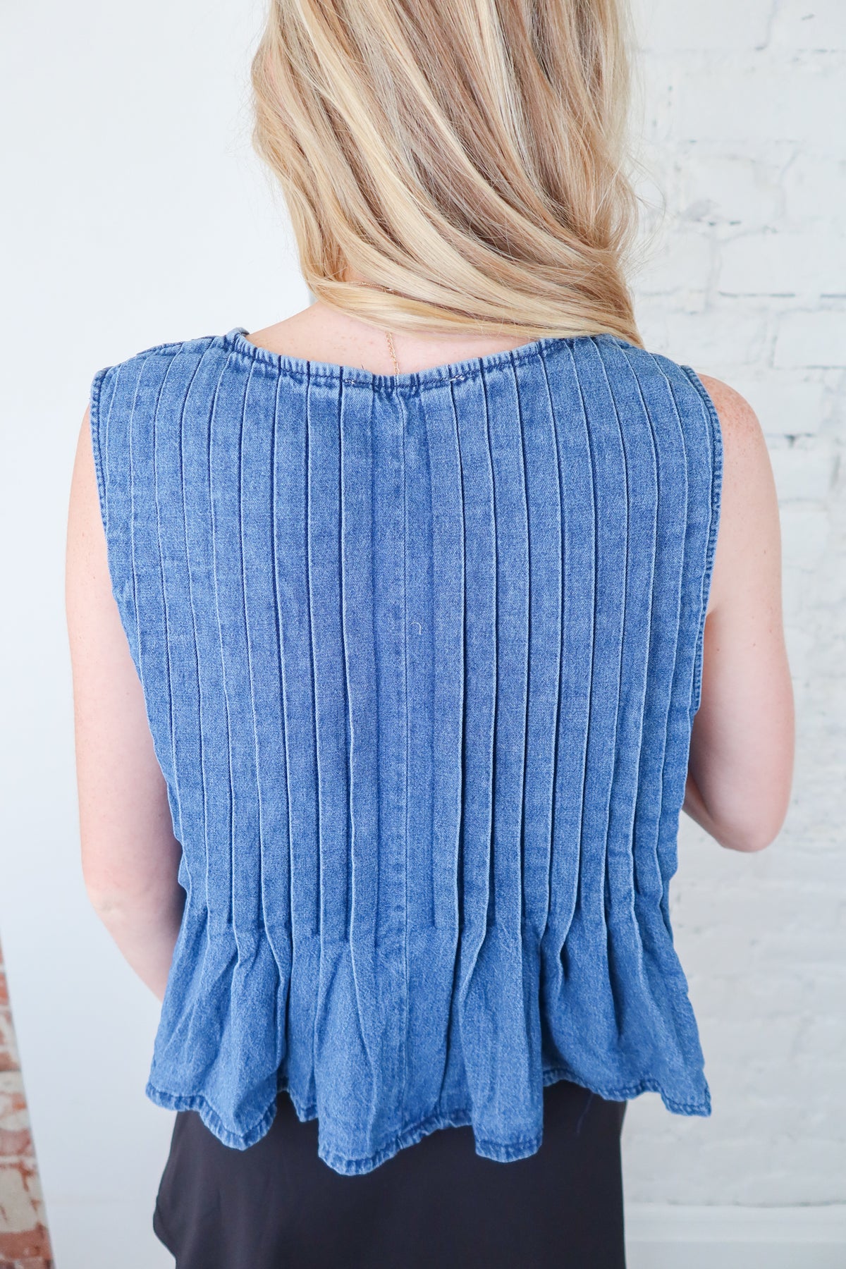 Elevate your casual wardrobe with the Denim Front Tie Pleated Top. Featuring a flattering front tie detail and delicate pleats, this top combines style and comfort effortlessly. Its versatile denim fabric pairs perfectly with jeans or skirts, making it an ideal choice for day-to-night wear. Embrace a chic, relaxed look that moves with you.