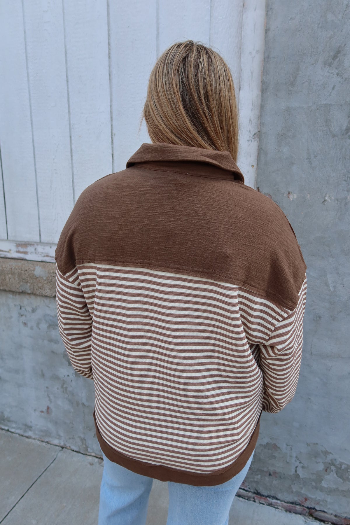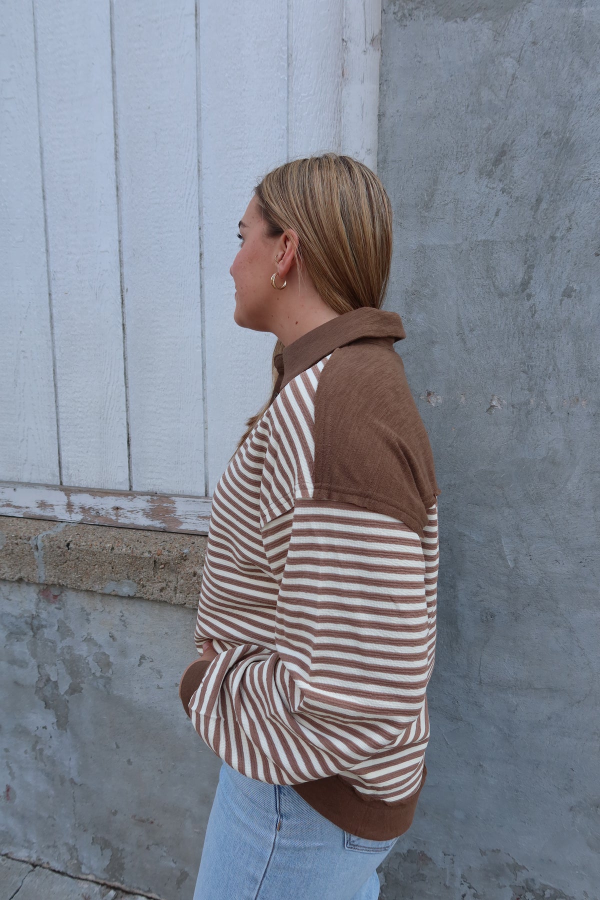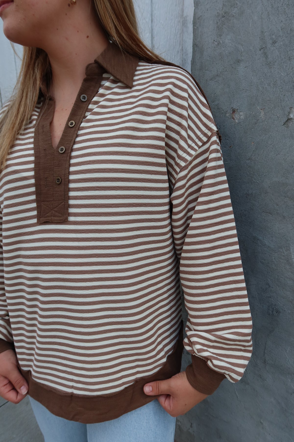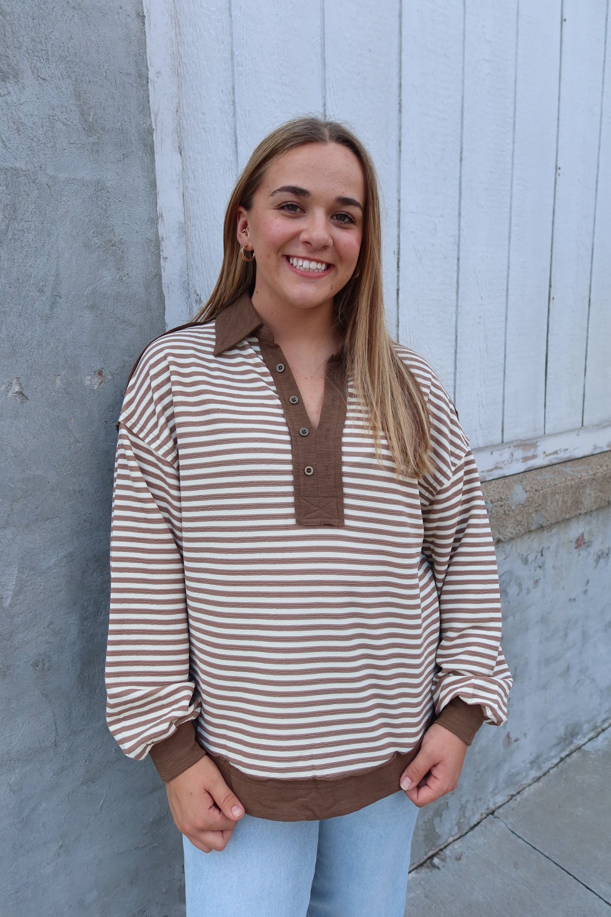 Elevate your wardrobe with the All I Need Mocha Striped Mix and Match Collared Top. This cozy mocha and cream sweater features a faux button V-neck that adds a stylish touch without the hassle. Perfect for layering or wearing on its own, it blends comfort and sophistication for effortlessly chic looks every day.