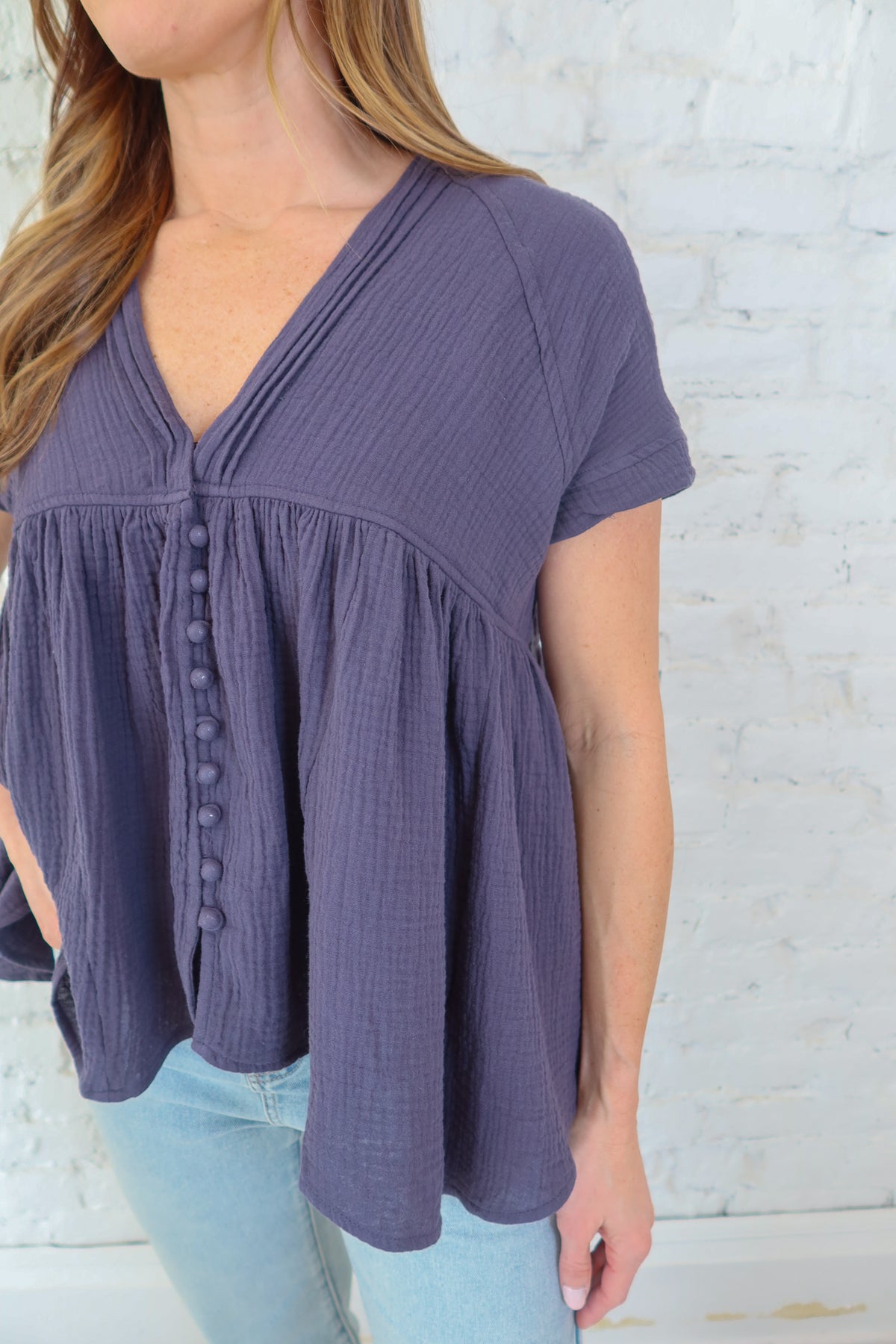 Effortless elegance meets everyday comfort in this navy gauze babydoll top. The flattering V-neckline draws the eye upward while delicate front button details add visual interest and styling versatility. Crafted from breathable gauze fabric, this relaxed silhouette skims the body for a breezy, feminine look that transitions seamlessly from casual outings to weekend gatherings.