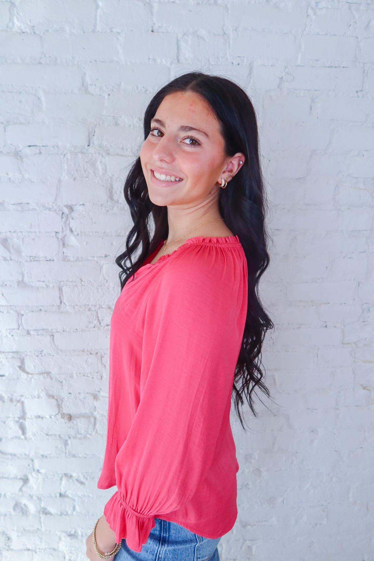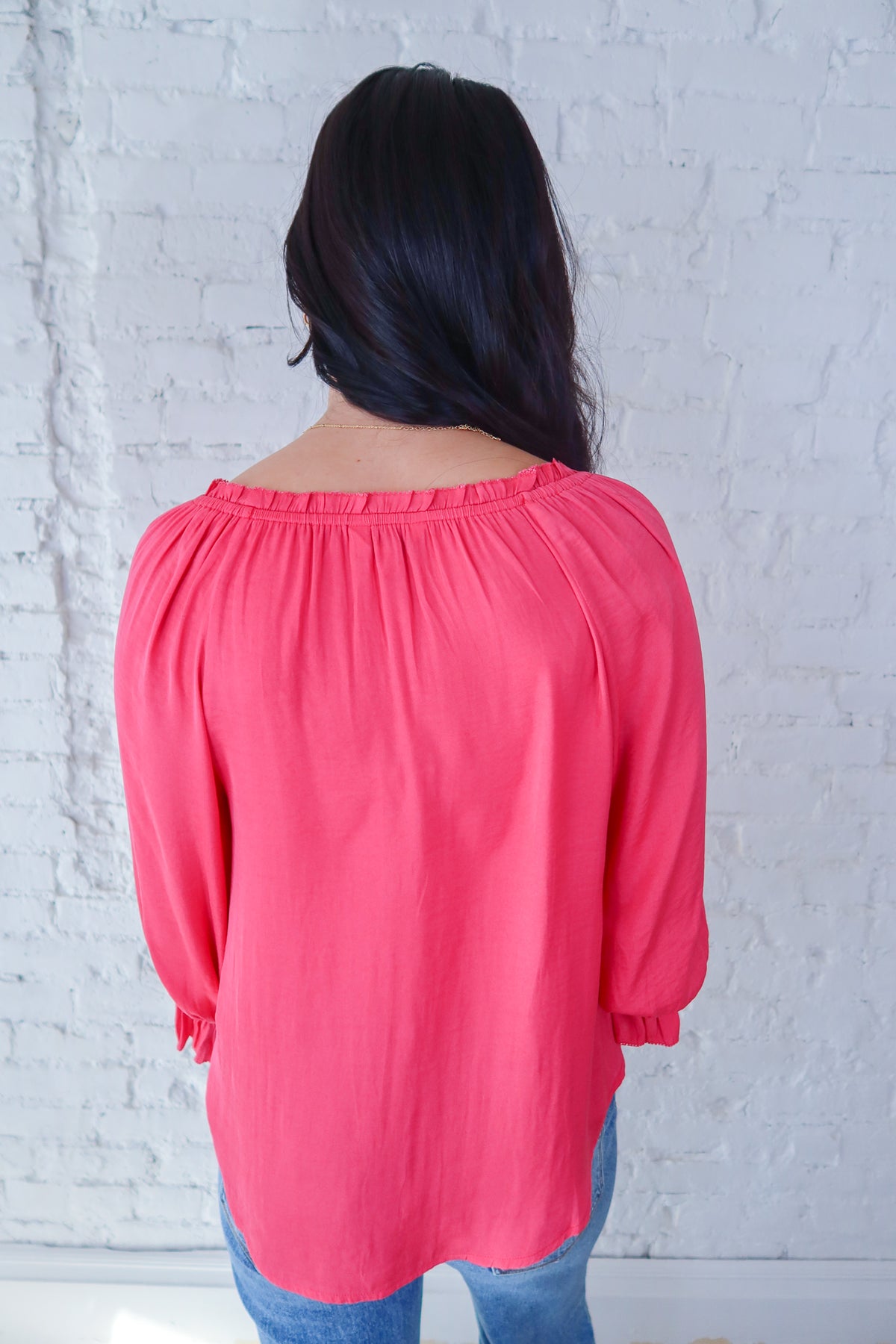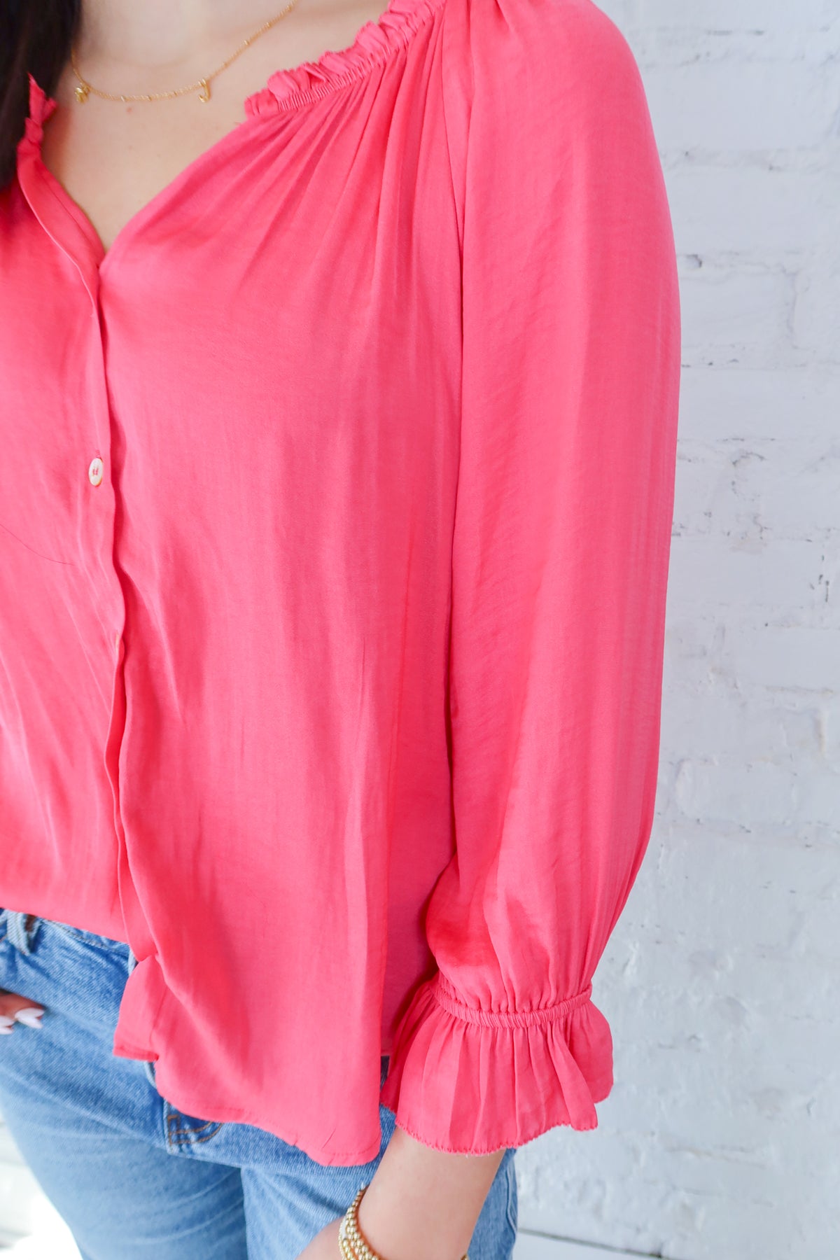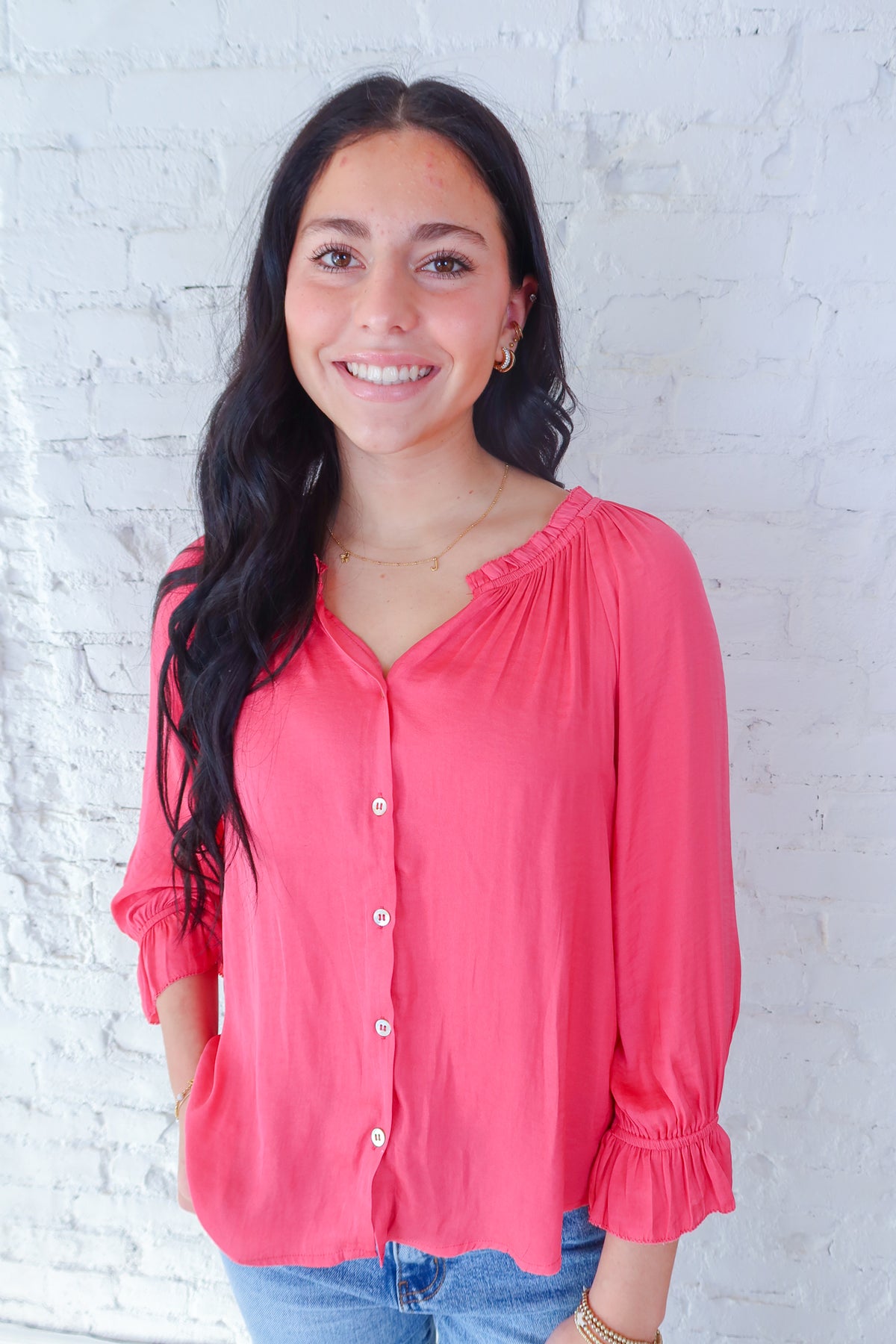 Elevate your everyday wardrobe with this charming pink button-up blouse that strikes the perfect balance between playful and polished. The delicate ruffle detail adorning the collar adds a touch of feminine flair, while the three-quarter sleeves offer versatile styling for any season. Crafted for comfort and style, this piece transitions effortlessly from office to weekend brunch. Whether you're dressing it up with tailored trousers or keeping it casual with your favorite jeans, this blouse is the versatile essential you've been searching for.