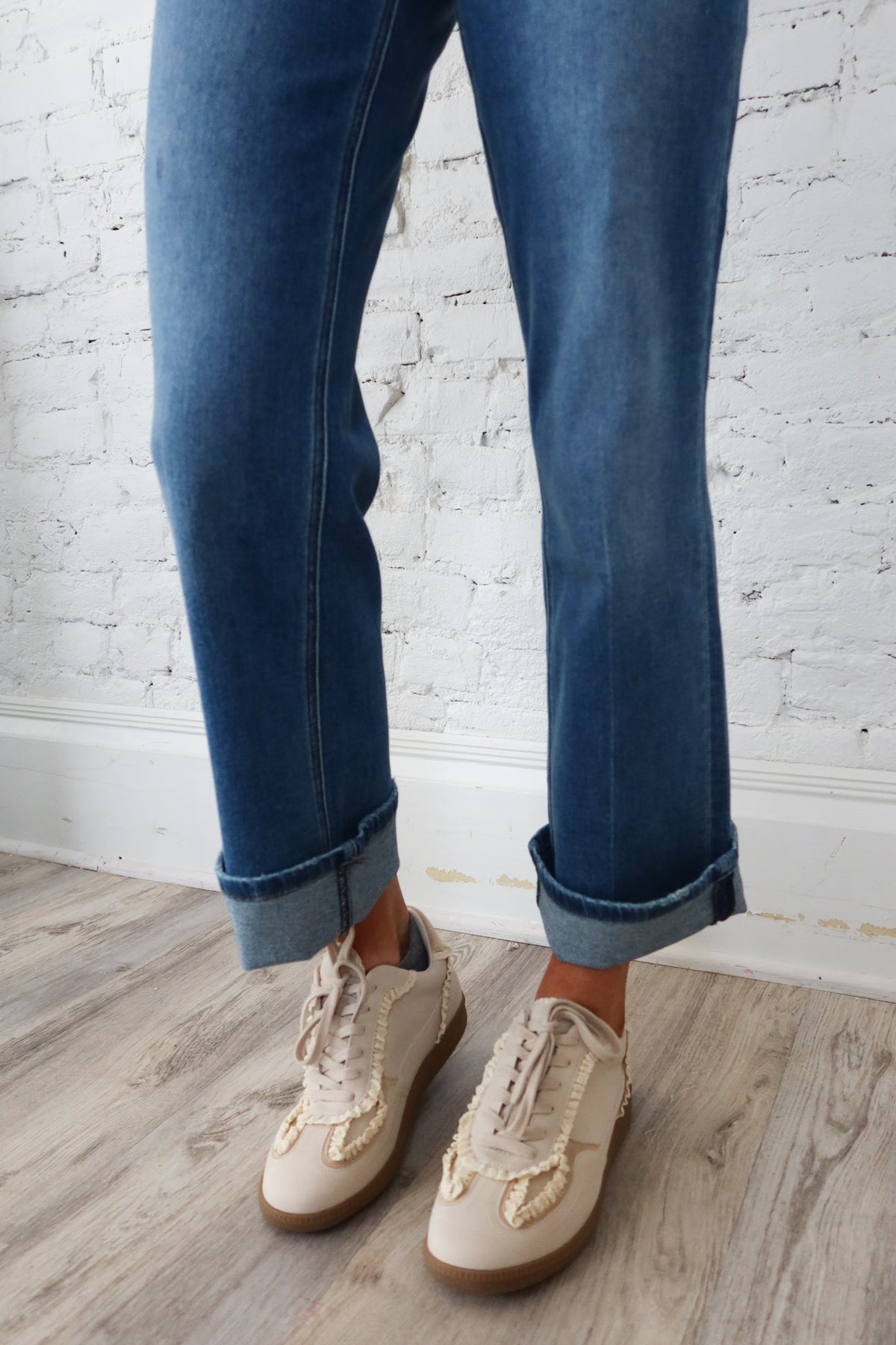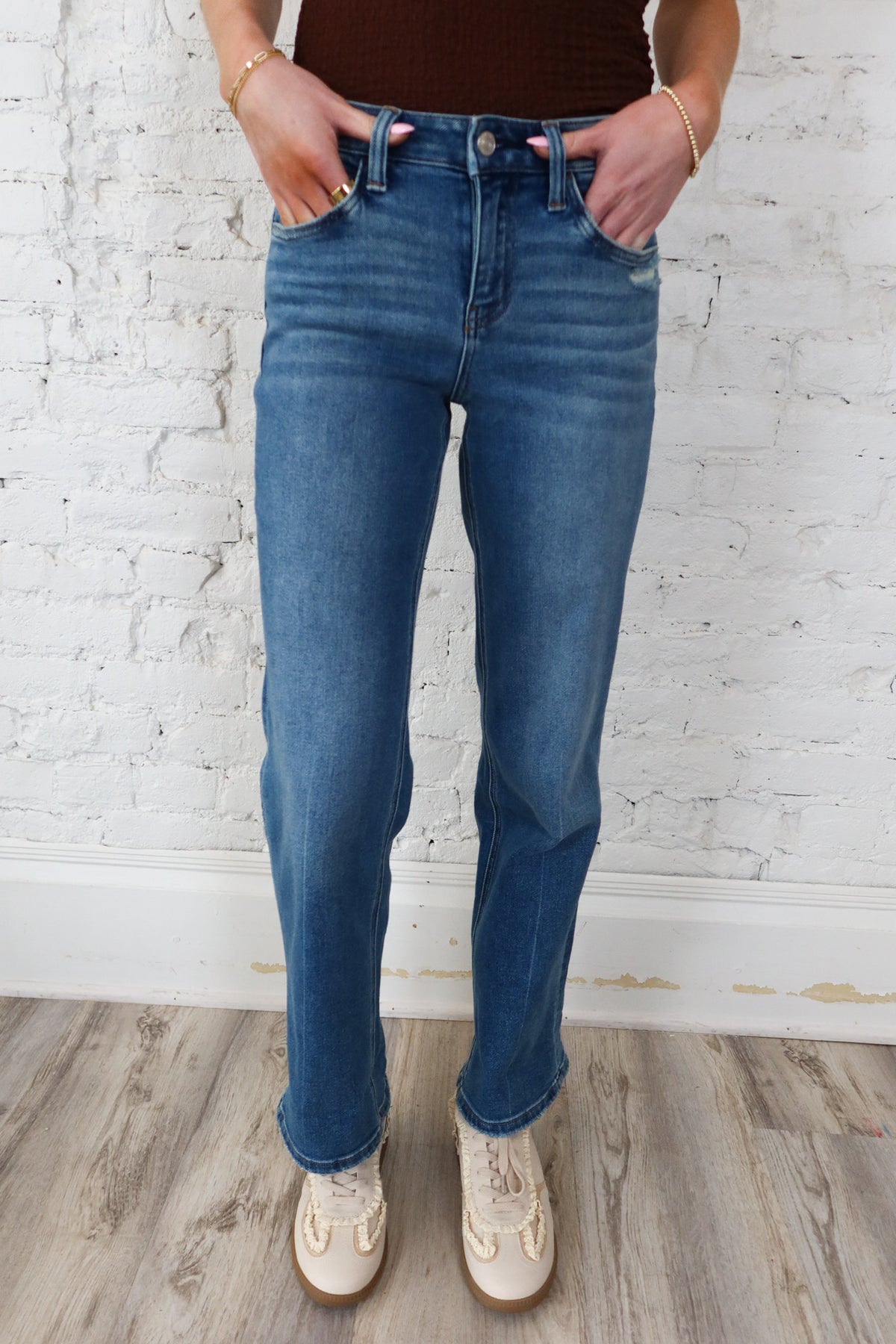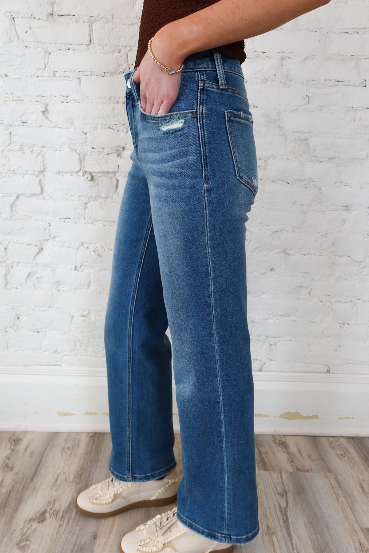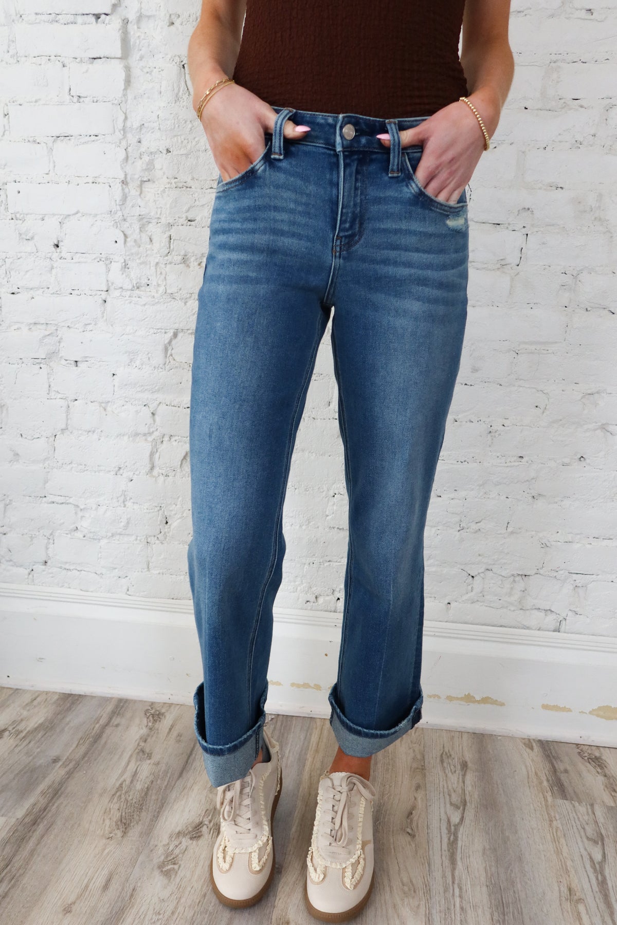 Effortlessly transition from casual to polished with these versatile mid-rise slim wide leg jeans. The stretch fabric moves with you while maintaining a flattering silhouette, while the adjustable cuff styling lets you customize the look to match your mood. Five-pocket construction keeps essentials secure, and the reliable zip and button closure ensures a secure fit all day long. Whether you're dressing up or down, these jeans deliver comfort and style in one timeless piece.