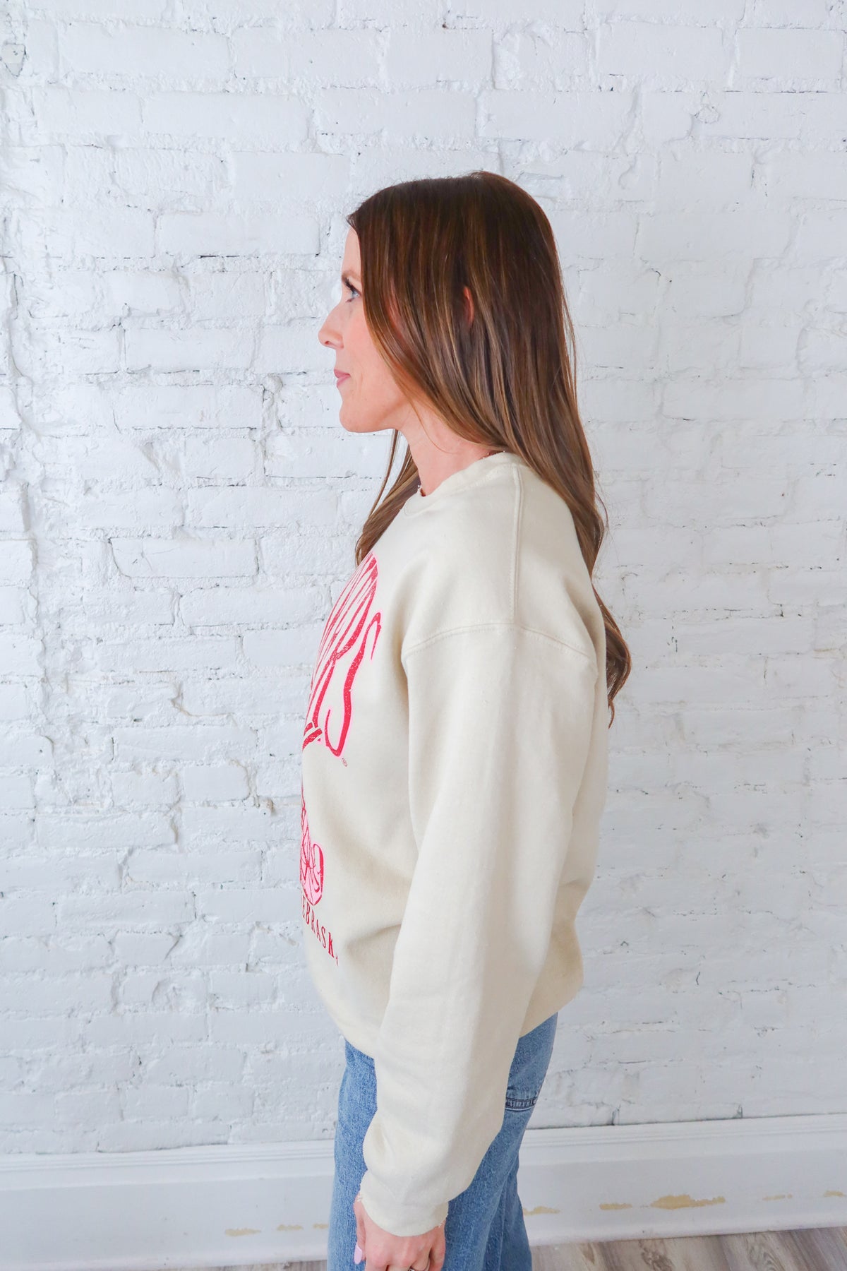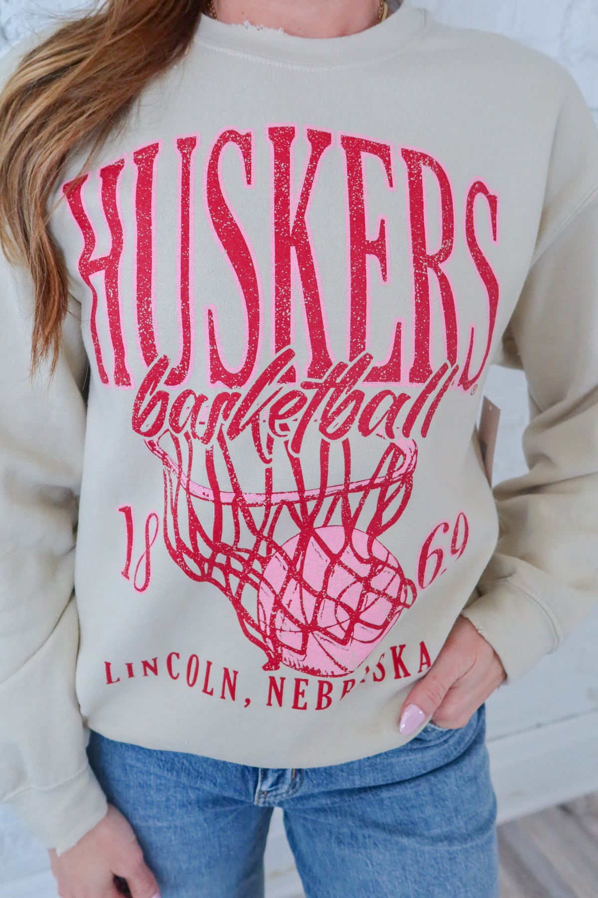 Sand NE Huskers Big Basketball Sweatshirt features a bold graphic print that captures team spirit with authentic style. Distressed detailing at the neckline and sleeves adds vintage character and edge, making this piece stand out in any casual rotation. Perfect for game day or everyday wear, this sweatshirt combines comfort with distinctive design elements that sports fans will appreciate.