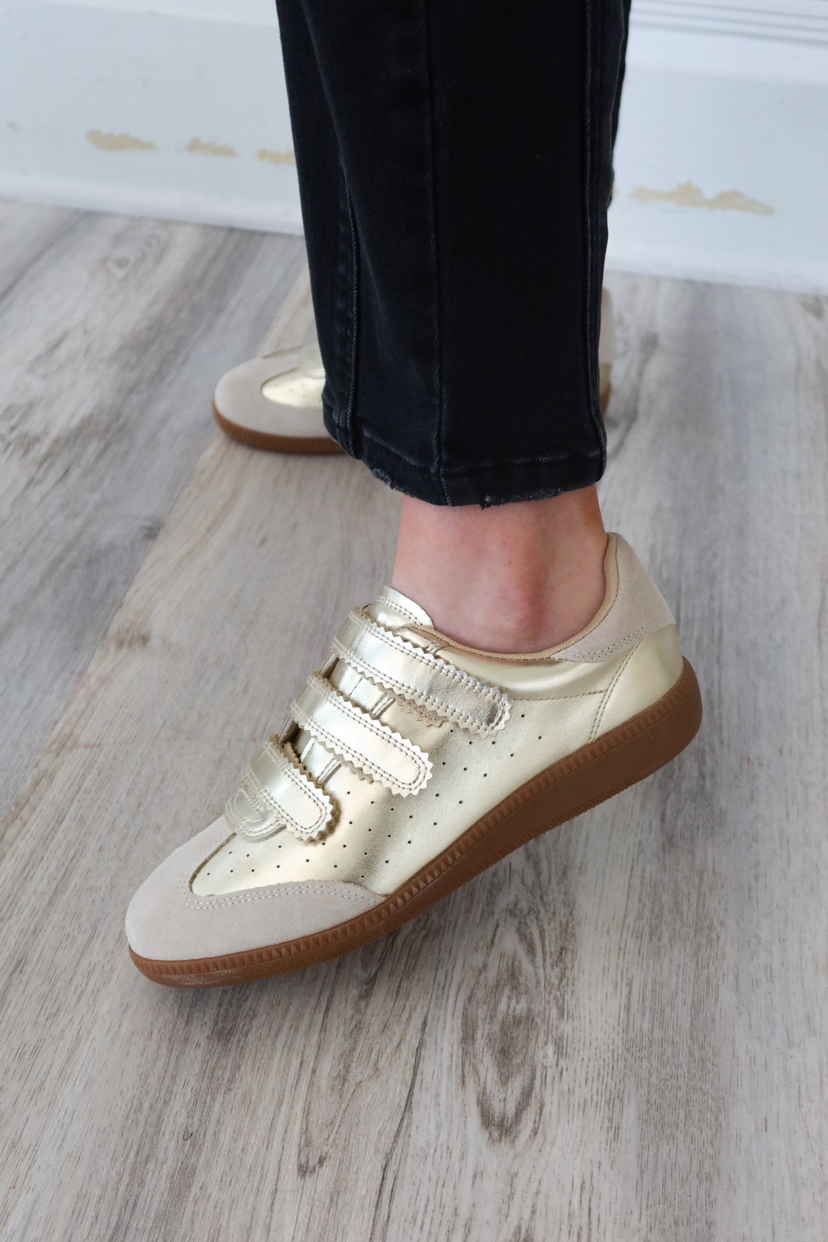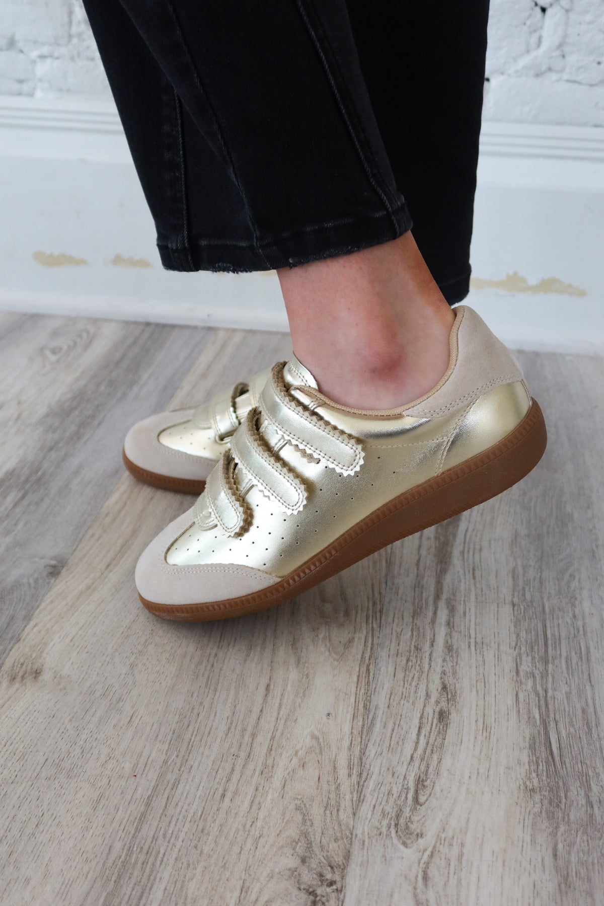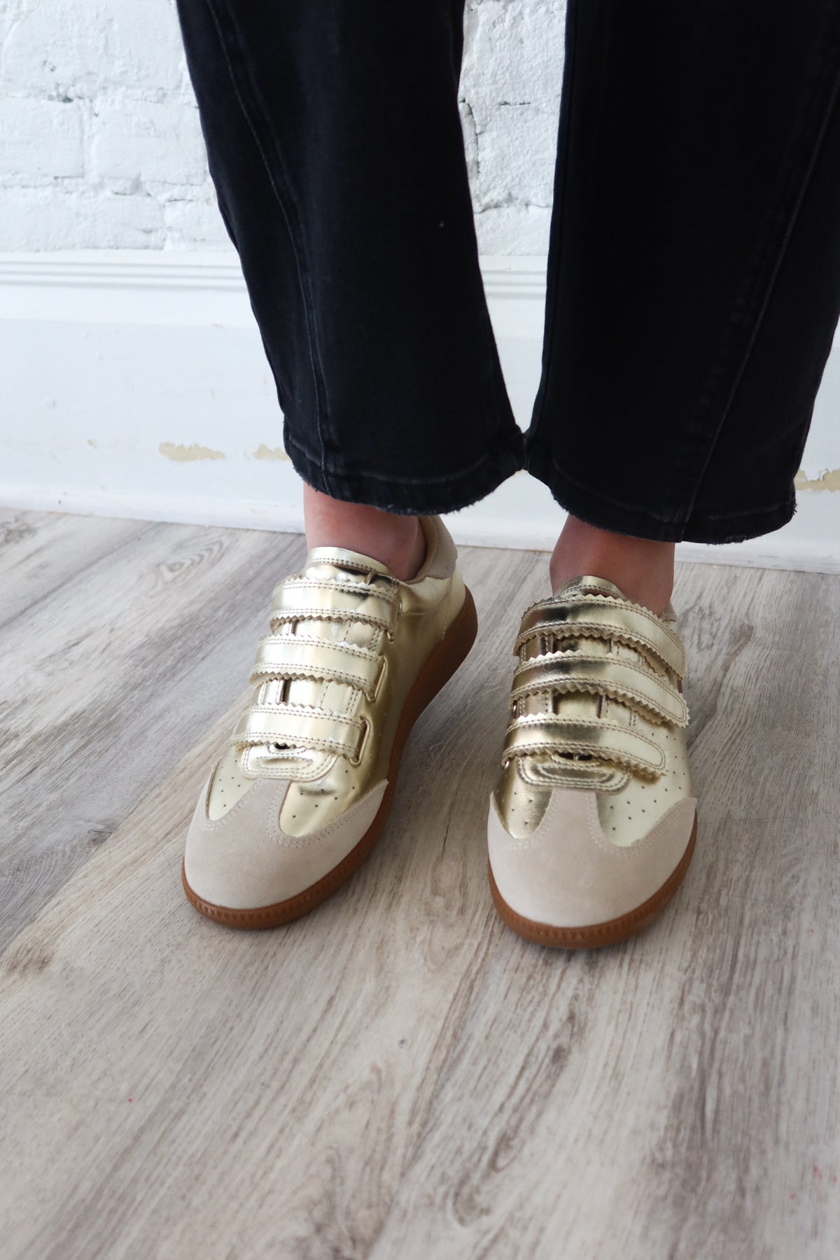 Step into effortless style with the Steve Madden Gold Momentum Shoe. Featuring convenient velcro straps for easy on-and-off wear, this adorable gold design combines comfort with contemporary flair. Perfect for everyday adventures, these shoes deliver the polished look you love without sacrificing all-day wearability. A versatile addition to any wardrobe that keeps you looking put-together from morning to night.