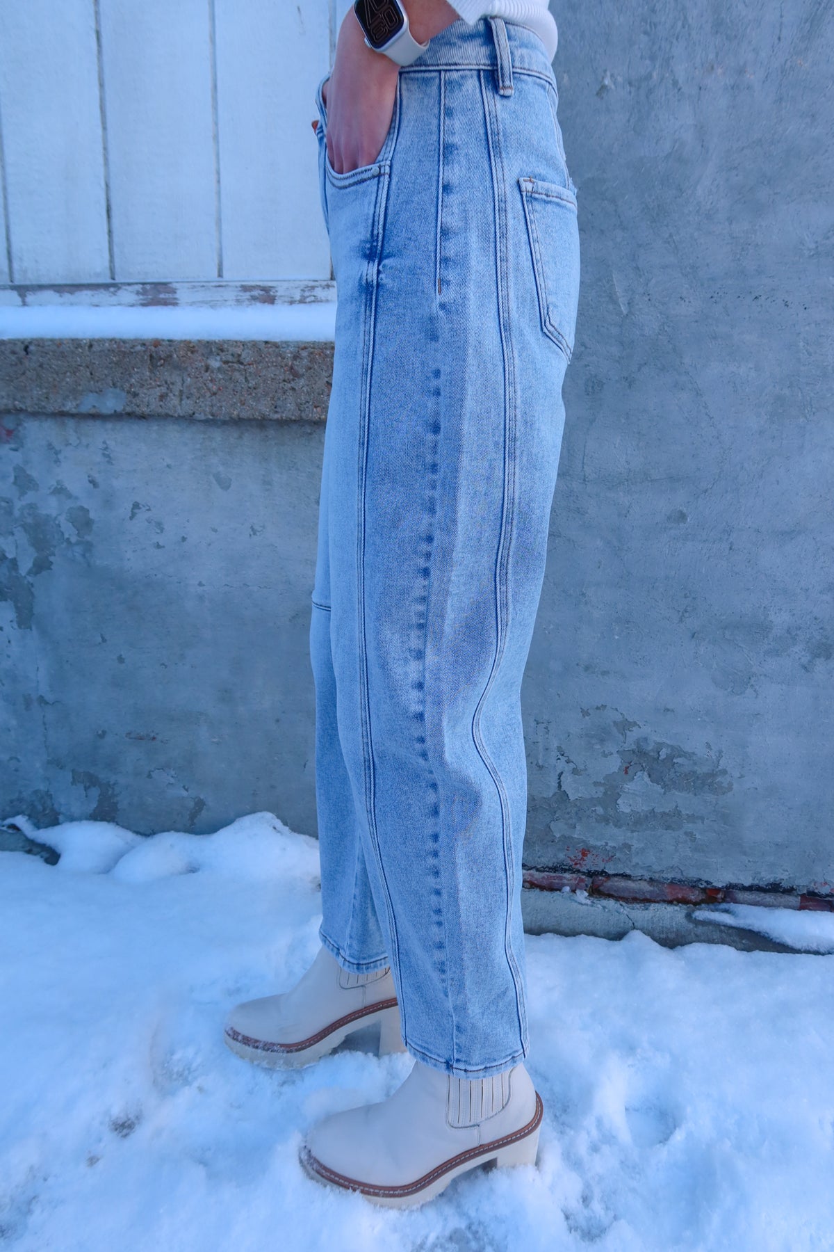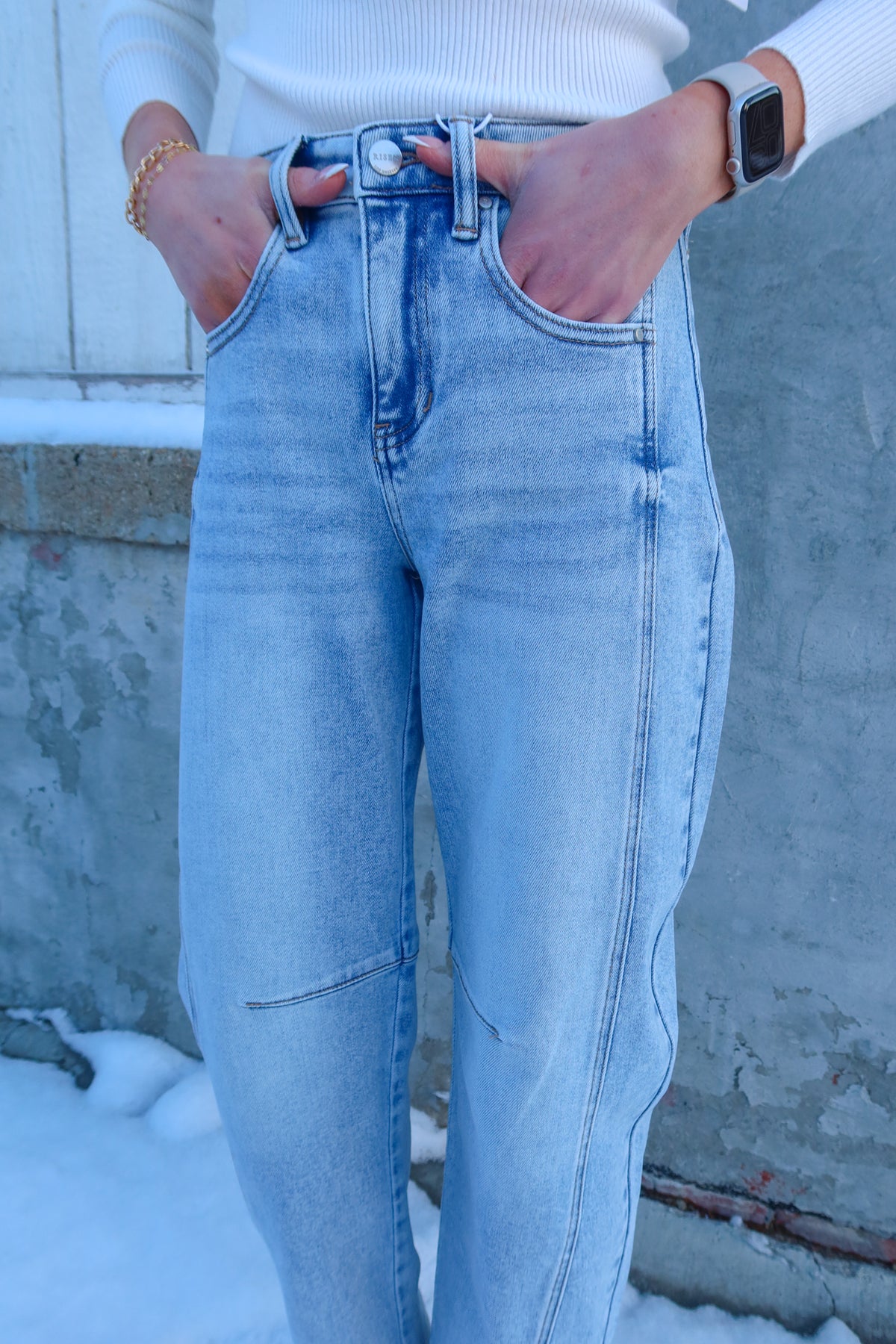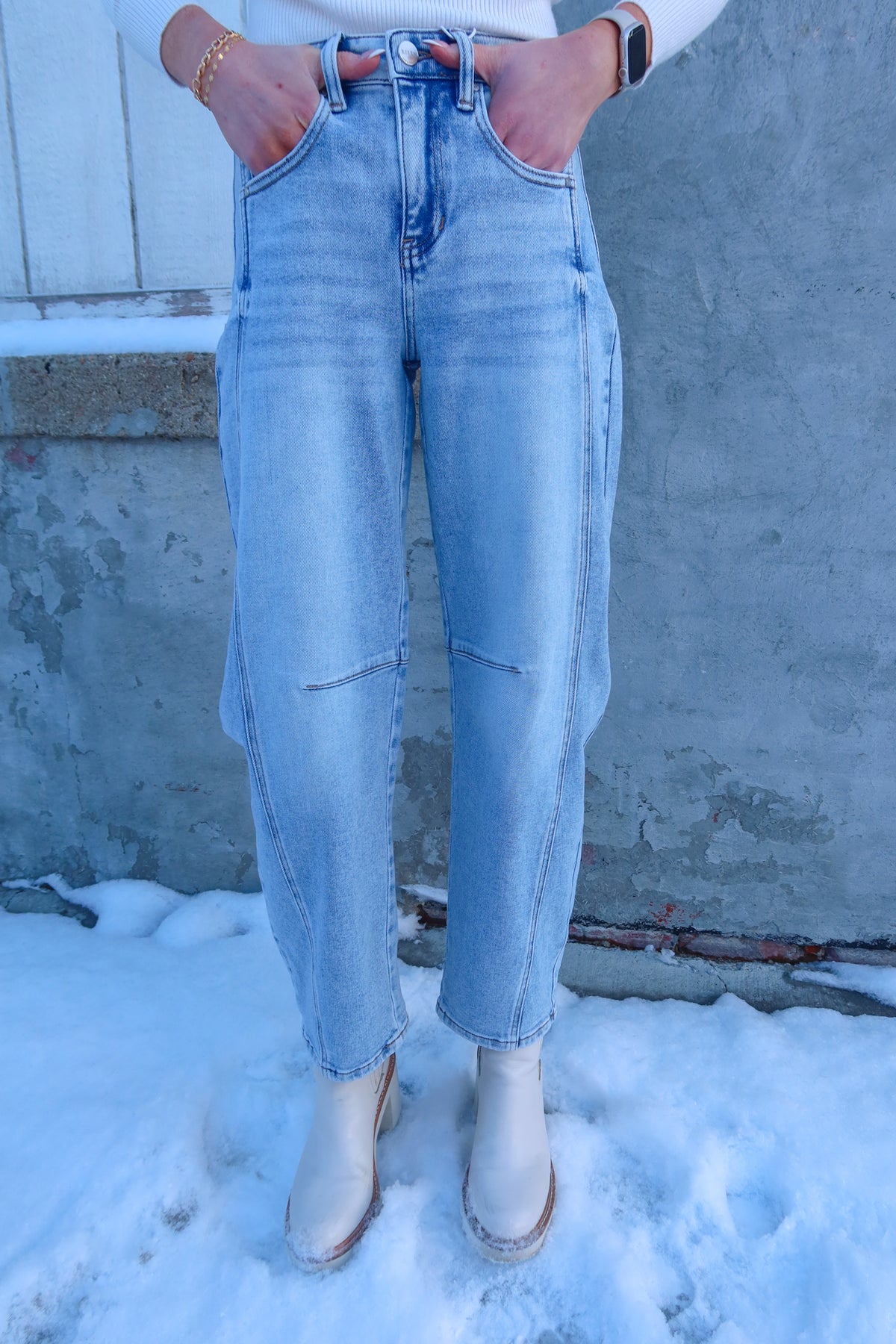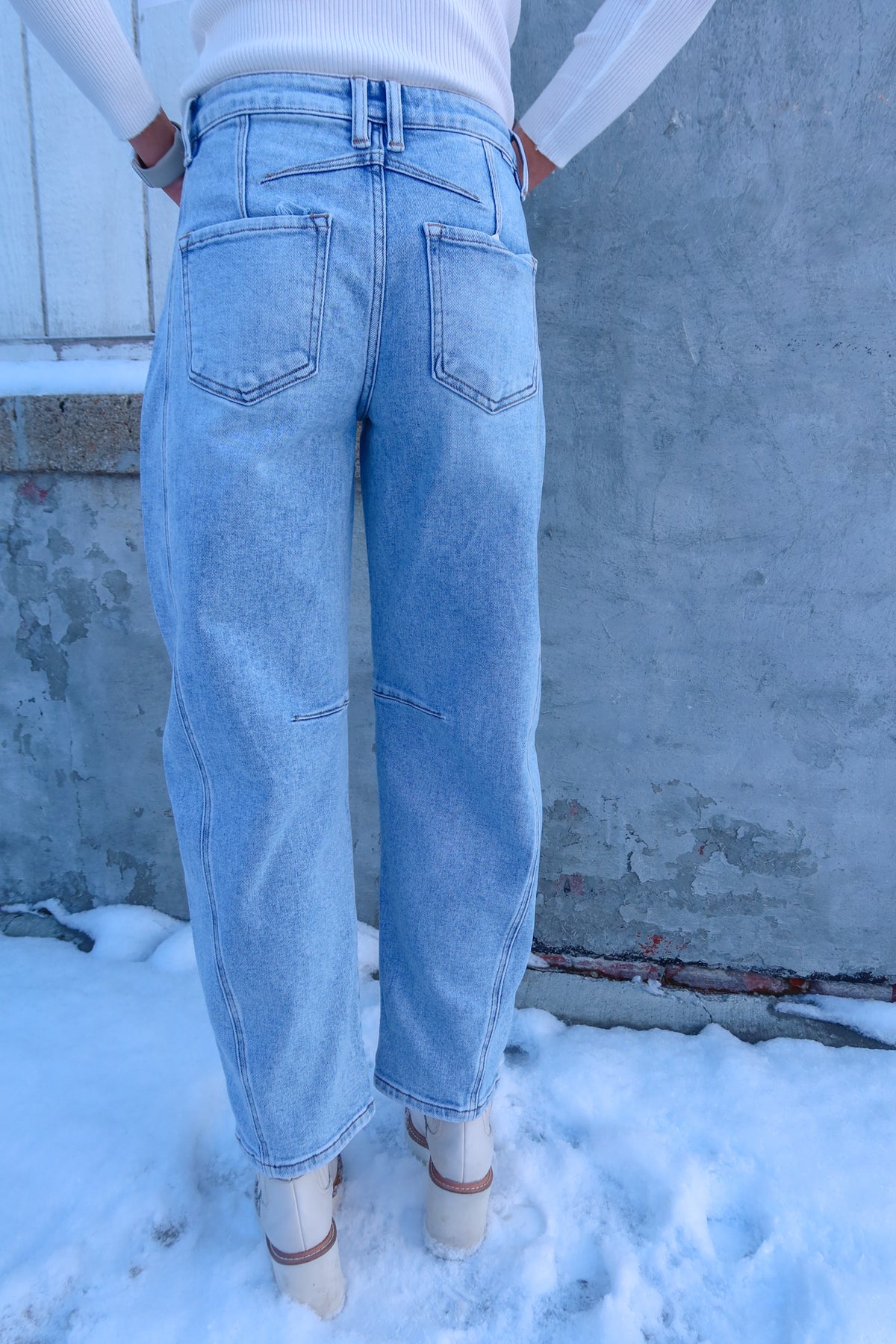 Elevate your denim game with this Risen light wash high-rise crop barrel jean—a modern take on a timeless classic. The high-rise waistband flatters your silhouette while the cropped barrel leg creates an effortlessly chic, on-trend look. Crafted in a soft light wash that pairs seamlessly with everything from sneakers to heels, this versatile piece transitions from casual weekends to polished nights out. The structured barrel cut offers a contemporary edge that sets you apart. Perfect for anyone seeking quality denim that combines comfort, style, and undeniable confidence.