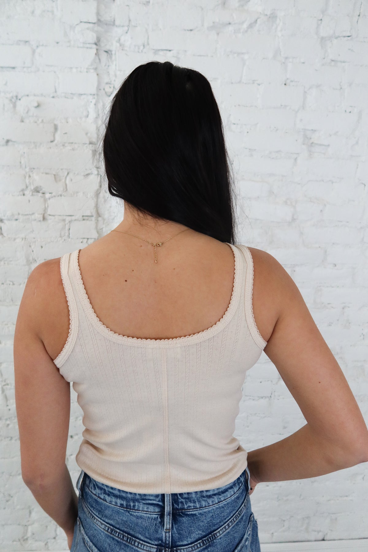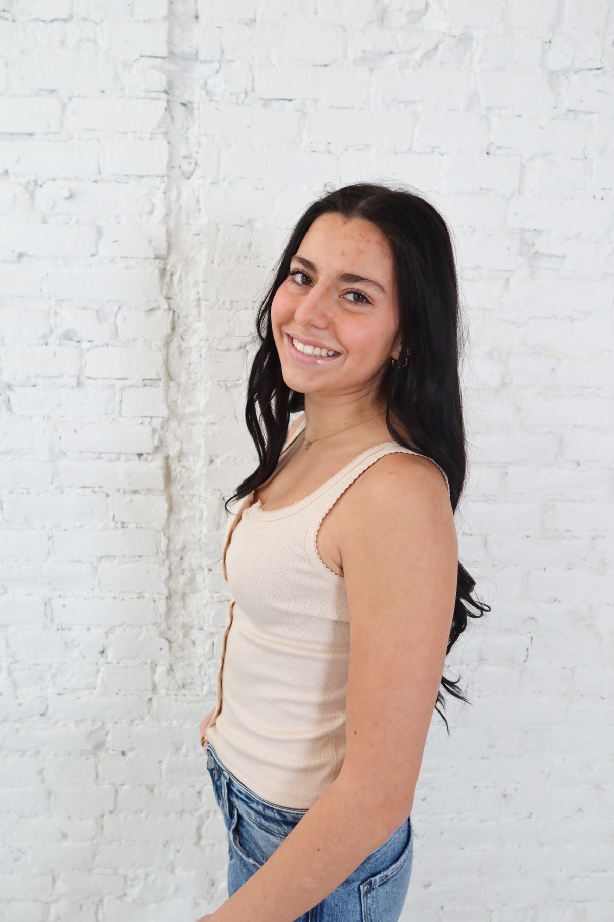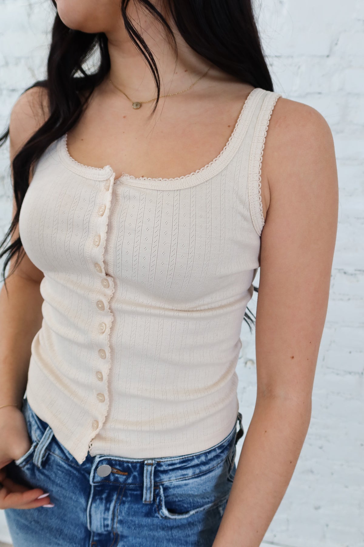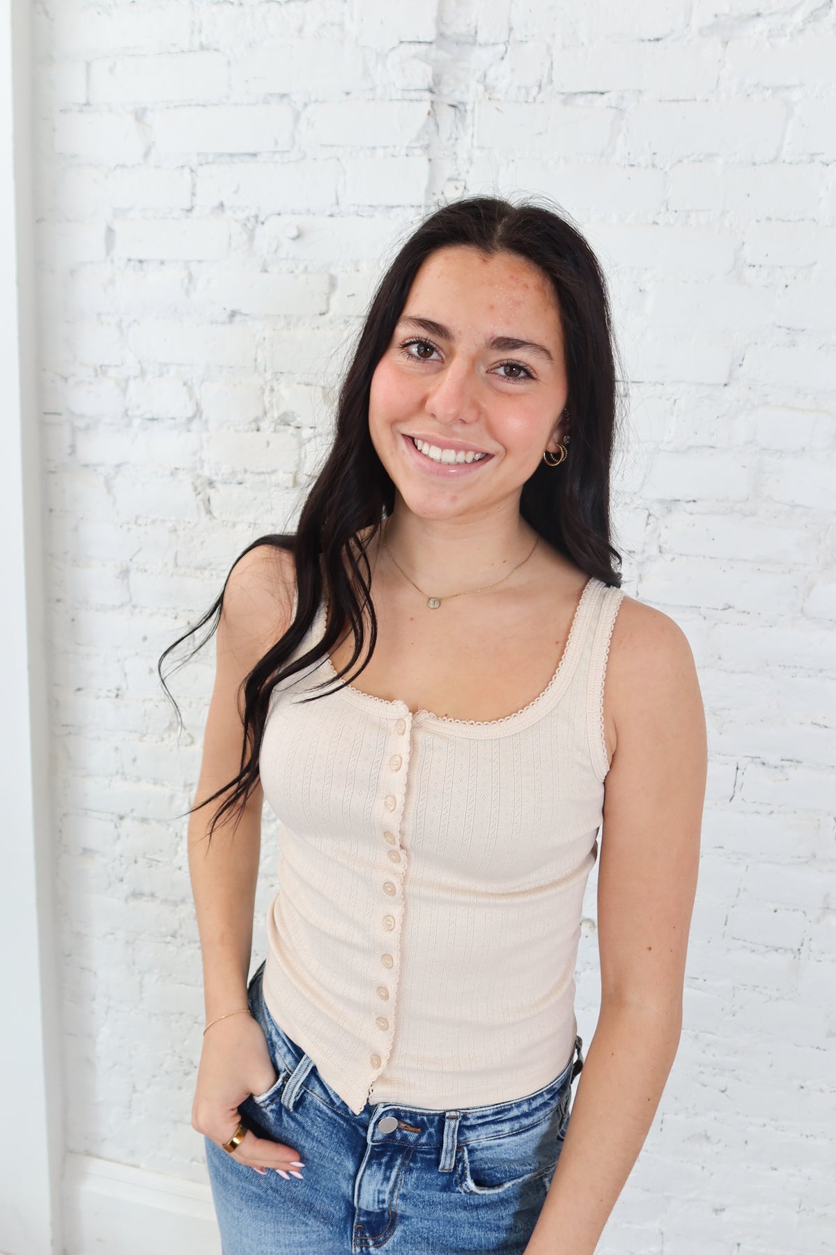 Elevate your spring wardrobe with this charming beige button-down tank top. Crafted with delicate details and a refined silhouette, this dainty piece transitions effortlessly from casual days to dressed-up occasions. The soft, neutral tone pairs beautifully with everything in your closet, while thoughtful design elements add understated sophistication. Perfect for layering or wearing solo, this versatile essential brings timeless elegance to any season.