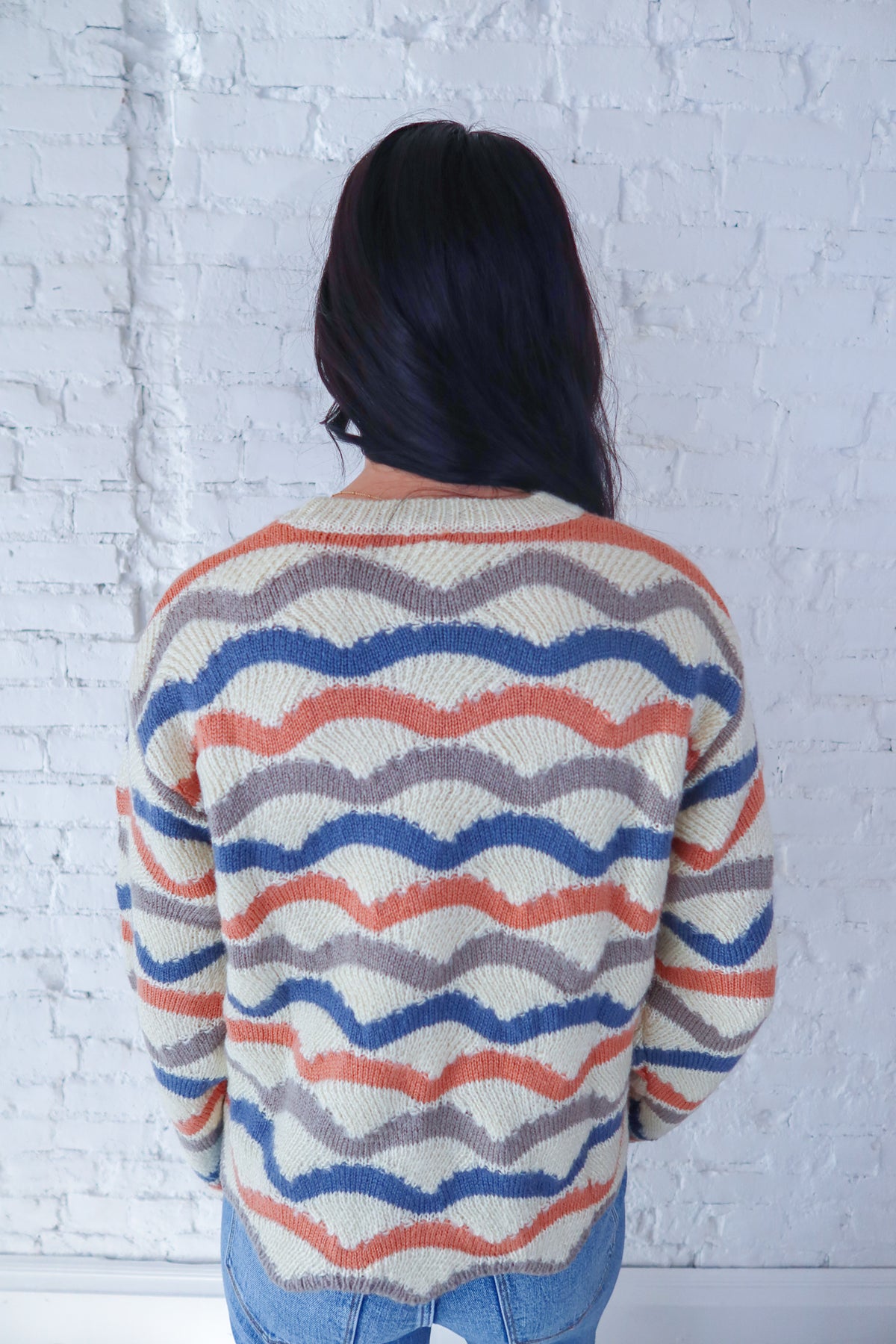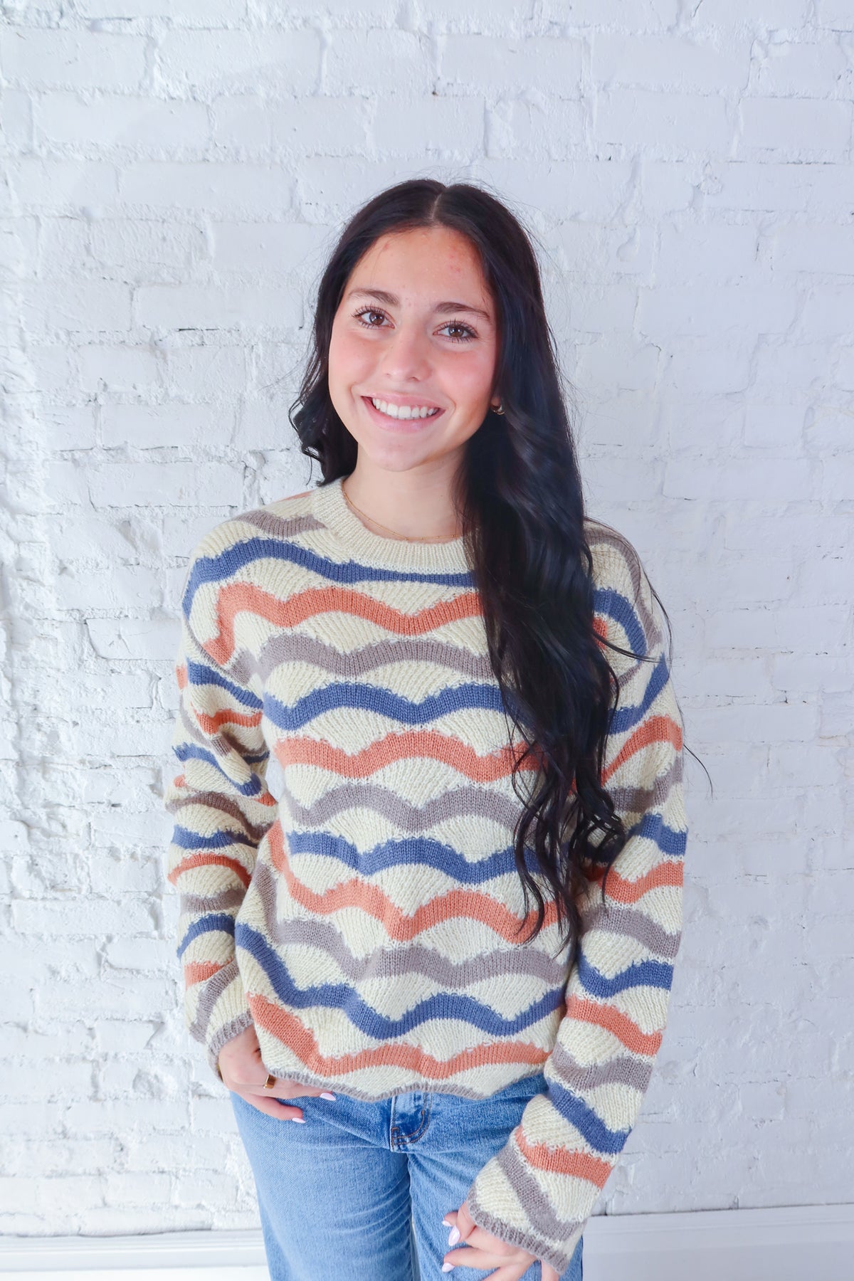 Wrap yourself in comfort with this charming knit sweater, featuring playful wavy stripes that add visual interest to your everyday wardrobe. The soft, cozy fabric makes it perfect for layering or wearing solo, while the classic round neckline keeps the look timeless and versatile. Whether you're relaxing at home or stepping out for casual errands, this sweater delivers warmth and style in one effortless piece. A wardrobe essential that feels as good as it looks.